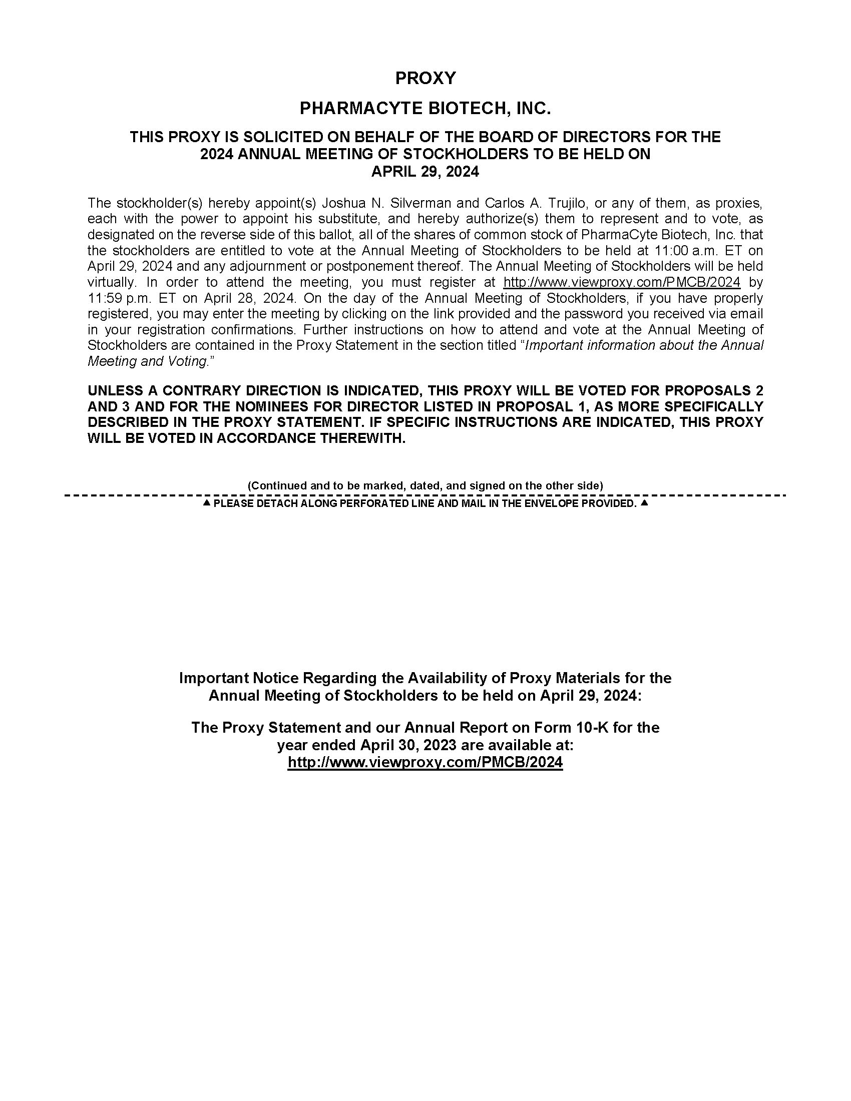 PROXY PHARMACYTE BIOTECH, INC. THIS PROXY IS SOLICITED ON BEHALF OF THE BOARD OF DIRECTORS FOR THE 2024 ANNUAL MEETING OF STOCKHOLDERS TO BE HELD ON APRIL 29, 2024 The stockholder(s) hereby appoint(s) Joshua N . Silverman and Carlos A . Trujilo, or any of them, as proxies, each with the power to appoint his substitute, and hereby authorize(s) them to represent and to vote, as designated on the reverse side of this ballot, all of the shares of common stock of PharmaCyte Biotech, Inc . that the stockholders are entitled to vote at the Annual Meeting of Stockholders to be held at 11 : 00 a . m . ET on April 29 , 2024 and any adjournment or postponement thereof . The Annual Meeting of Stockholders will be held virtually . In order to attend the meeting, you must register at http : //www . viewproxy . com/PMCB/ 2024 by 11 : 59 p . m . ET on April 28 , 2024 . On the day of the Annual Meeting of Stockholders, if you have properly registered, you may enter the meeting by clicking on the link provided and the password you received via email in your registration confirmations . Further instructions on how to attend and vote at the Annual Meeting of Stockholders are contained in the Proxy Statement in the section titled “ Important information about the Annual Meeting and Voting . ” UNLESS A CONTRARY DIRECTION IS INDICATED, THIS PROXY WILL BE VOTED FOR PROPOSALS 2 AND 3 AND FOR THE NOMINEES FOR DIRECTOR LISTED IN PROPOSAL 1 , AS MORE SPECIFICALLY DESCRIBED IN THE PROXY STATEMENT . IF SPECIFIC INSTRUCTIONS ARE INDICATED, THIS PROXY WILL BE VOTED IN ACCORDANCE THEREWITH . (Continued and to be marked, dated, and signed on the other side) ☒ PLEASE DETACH ALONG PERFORATED LINE AND MAIL IN THE ENVELOPE PROVIDED. ☒ Important Notice Regarding the Availability of Proxy Materials for the Annual Meeting of Stockholders to be held on April 29, 2024: The Proxy Statement and our Annual Report on Form 10 - K for the year ended April 30, 2023 are available at: http://www.viewproxy.com/PMCB/2024