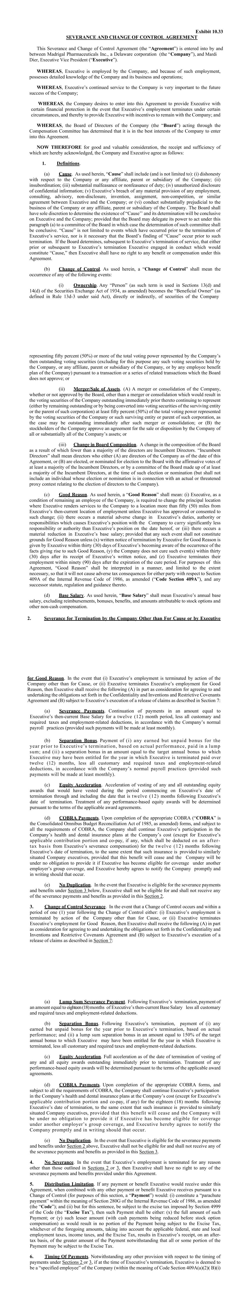 Exhibit 10.33 SEVERANCE AND CHANGE OF CONTROL AGREEMENT This Severance and Change of Control Agreement (the “Agreement”) is entered into by and between Madrigal Pharmaceuticals Inc., a Delaware corporation (the “Company”), and Mardi Dier, Executive Vice President (“Executive”). WHEREAS, Executive is employed by the Company, and because of such employment, possesses detailed knowledge of the Company and its business and operations; WHEREAS, Executive’s continued service to the Company is very important to the future success of the Company; WHEREAS, the Company desires to enter into this Agreement to provide Executive with certain financial protection in the event that Executive’s employment terminates under certain circumstances, and thereby to provide Executive with incentives to remain with the Company; and WHEREAS, the Board of Directors of the Company (the “Board”) acting through the Compensation Committee has determined that it is in the best interests of the Company to enter into this Agreement. NOW THEREFORE for good and valuable consideration, the receipt and sufficiency of which are hereby acknowledged, the Company and Executive agree as follows: 1. Definitions. (a) Cause. As used herein, “Cause” shall include (and is not limited to): (i) dishonesty with respect to the Company or any affiliate, parent or subsidiary of the Company; (ii) insubordination; (iii) substantial malfeasance or nonfeasance of duty; (iv) unauthorized disclosure of confidential information; (v) Executive’s breach of any material provision of any employment, consulting, advisory, non-disclosure, invention, assignment, non-competition, or similar agreement between Executive and the Company; or (vi) conduct substantially prejudicial to the business of the Company or any affiliate, parent or subsidiary of the Company. The Board shall have sole discretion to determine the existence of “Cause’’ and its determination will be conclusive on Executive and the Company; provided that the Board may delegate its power to act under this paragraph (a) to a committee of the Board in which case the determination of such committee shall be conclusive. “Cause” is not limited to events which have occurred prior to the termination of Executive’s service, nor is it necessary that the Board’s finding of “Cause” occur prior to such termination. If the Board determines, subsequent to Executive’s termination of service, that either prior or subsequent to Executive’s termination Executive engaged in conduct which would constitute “Cause,” then Executive shall have no right to any benefit or compensation under this Agreement. (b) Change of Control. As used herein, a “Change of Control” shall mean the occurrence of any of the following events: (i) Ownership. Any “Person” (as such term is used in Sections 13(d) and 14(d) of the Securities Exchange Act of 1934, as amended) becomes the “Beneficial Owner” (as defined in Rule 13d-3 under said Act), directly or indirectly, of securities of the Company representing fifty percent (50%) or more of the total voting power represented by the Company’s then outstanding voting securities (excluding for this purpose any such voting securities held by the Company, or any affiliate, parent or subsidiary of the Company, or by any employee benefit plan of the Company) pursuant to a transaction or a series of related transactions which the Board does not approve; or (ii) Merger/Sale of Assets. (A) A merger or consolidation of the Company, whether or not approved by the Board, other than a merger or consolidation which would result in the voting securities of the Company outstanding immediately prior thereto continuing to represent (either by remaining outstanding or by being converted into voting securities of the surviving entity or the parent of such corporation) at least fifty percent (50%) of the total voting power represented by the voting securities of the Company or such surviving entity or parent of such corporation, as the case may be outstanding immediately after such merger or consolidation; or (B) the stockholders of the Company approve an agreement for the sale or disposition by the Company of all or substantially all of the Company’s assets; or (iii) Change in Board Composition. A change in the composition of the Board as a result of which fewer than a majority of the directors are Incumbent Directors. “Incumbent Directors” shall mean directors who either (A) are directors of the Company as of the date of this Agreement, or (B) are elected, or nominated for election to the Board with the affirmative votes of at least a majority of the Incumbent Directors, or by a committee of the Board made up of at least a majority of the Incumbent Directors, at the time of such election or nomination (but shall not include an individual whose election or nomination is in connection with an actual or threatened proxy contest relating to the election of directors to the Company). (c) Good Reason. As used herein, a “Good Reason” shall mean: (i) Executive, as a condition of remaining an employee of the Company, is required to change the principal location where Executive renders services to the Company to a location more than fifty (50) miles from Executive’s then-current location of employment unless Executive has approved or consented to such change; (ii) there occurs a material adverse change in Executive’s duties, authority or responsibilities which causes Executive’s position with the Company to carry significantly less responsibility or authority than Executive’s position on the date hereof, or (iii) there occurs a material reduction in Executive’s base salary; provided that any such event shall not constitute grounds for Good Reason unless (x) written notice of termination by Executive for Good Reason is given by Executive within thirty (30) days of Executive’s becoming aware of the occurrence of the facts giving rise 
