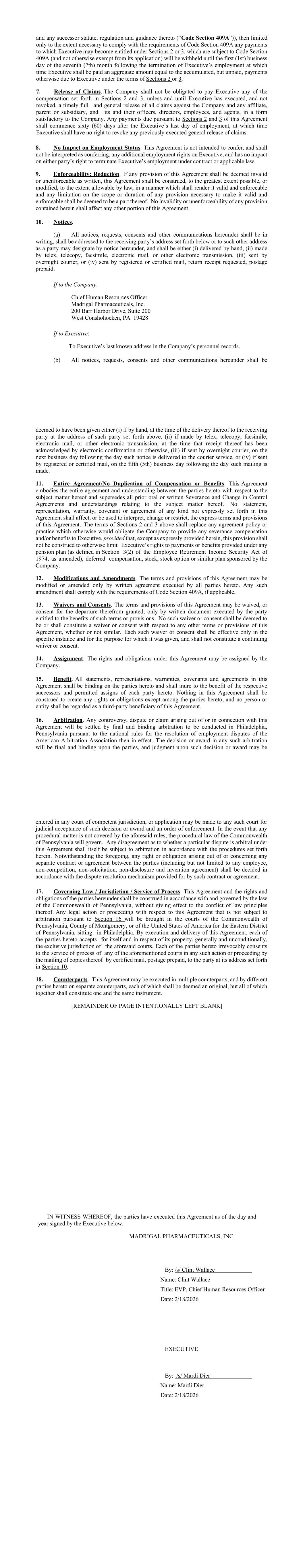 and any successor statute, regulation and guidance thereto (“Code Section 409A”)), then limited only to the extent necessary to comply with the requirements of Code Section 409A any payments to which Executive may become entitled under Sections 2 or 3, which are subject to Code Section 409A (and not otherwise exempt from its application) will be withheld until the first (1st) business day of the seventh (7th) month following the termination of Executive’s employment at which time Executive shall be paid an aggregate amount equal to the accumulated, but unpaid, payments otherwise due to Executive under the terms of Sections 2 or 3. 7. Release of Claims. The Company shall not be obligated to pay Executive any of the compensation set forth in Sections 2 and 3, unless and until Executive has executed, and not revoked, a timely full and general release of all claims against the Company and any affiliate, parent or subsidiary, and its and their officers, directors, employees, and agents, in a form satisfactory to the Company. Any payments due pursuant to Sections 2 and 3 of this Agreement shall commence sixty (60) days after the Executive’s last day of employment, at which time Executive shall have no right to revoke any previously executed general release of claims. 8. No Impact on Employment Status. This Agreement is not intended to confer, and shall not be interpreted as conferring, any additional employment rights on Executive, and has no impact on either party’s right to terminate Executive’s employment under contract or applicable law. 9. Enforceability; Reduction. If any provision of this Agreement shall be deemed invalid or unenforceable as written, this Agreement shall be construed, to the greatest extent possible, or modified, to the extent allowable by law, in a manner which shall render it valid and enforceable and any limitation on the scope or duration of any provision necessary to make it valid and enforceable shall be deemed to be a part thereof. No invalidity or unenforceability of any provision contained herein shall affect any other portion of this Agreement. 10. Notices. (a) All notices, requests, consents and other communications hereunder shall be in writing, shall be addressed to the receiving party’s address set forth below or to such other address as a party may designate by notice hereunder, and shall be either (i) delivered by hand, (ii) made by telex, telecopy, facsimile, electronic mail, or other electronic transmission, (iii) sent by overnight courier, or (iv) sent by registered or certified mail, return receipt requested, postage prepaid. If to the Company: Chief Human Resources Officer Madrigal Pharmaceuticals, Inc. 200 Barr Harbor Drive, Suite 200 West Conshohocken, PA 19428 If to Executive: To Executive’s last known address in the Company’s personnel records. (b) All notices, requests, consents and other communications hereunder shall be deemed to have been given either (i) if by hand, at the time of the delivery thereof to the receiving party at the address of such party set forth above, (ii) if made by telex, telecopy, facsimile, electronic mail, or other electronic transmission, at the time that receipt thereof has been acknowledged by electronic confirmation or otherwise, (iii) if sent by overnight courier, on the next business day following the day such notice is delivered to the courier service, or (iv) if sent by registered or certified mail, on the fifth (5th) business day following the day such mailing is made. 11. Entire Agreement/No Duplication of Compensation or Benefits. This Agreement embodies the entire agreement and understanding between the parties hereto with respect to the subject matter hereof and supersedes all prior oral or written Severance and Change in Control Agreements and understandings relating to the subject matter hereof. No statement, representation, warranty, covenant or agreement of any kind not expressly set forth in this Agreement shall affect, or be used to interpret, change or restrict, the express terms and provisions of this Agreement. The terms of Sections 2 and 3 above shall replace any agreement policy or practice which otherwise would obligate the Company to provide any severance compensation and/or benefits to Executive, provided that, except as expressly provided herein, this provision shall not be construed to otherwise limit Executive’s rights to payments or benefits provided under any pension plan (as defined in Section 3(2) of the Employee Retirement Income Security Act of 1974, as amended), deferred compensation, stock, stock option or similar plan sponsored by the Company. 12. Modifications and Amendments. The terms and provisions of this Agreement may be modified or amended only by written agreement executed by all parties hereto. Any such amendment shall comply with the requirements of Code Section 409A, if applicable. 13. Waivers and Consents. The terms and provisions of this Agreement may be waived, or consent for the departure therefrom granted, only by written document executed by the party entitled to the benefits of such terms or provisions. No such waiver or consent shall be deemed to be or shall constitute a waiver or consent with respect to any other terms or provisions of this Agreement, whether or not similar. Each such waiver or consent shall be effective only in the specific instance and for the purpose for which it was given, and shall not constitute a continuing waiver or consent. 14. Assignment. The rights and obligations under this Agreement may be assigned by the Company. 15. Benefit. All statements, representations, warranties, covenants and agreements in this Agreement shall be binding on the parties hereto and shall inure to the benefit of the respective successors and permitted assigns of each party hereto. Nothing in this Agreement shall be construed to create any rights or obligations except among the parties hereto, and no person or entity shall be regarded as a 