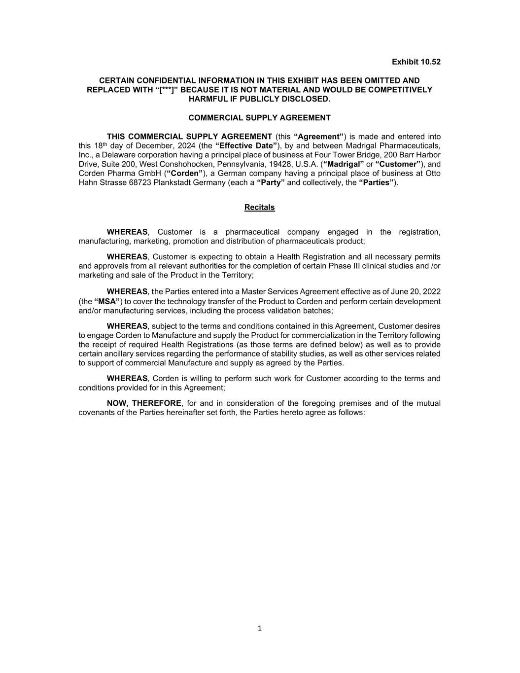 1 Exhibit 10.52 CERTAIN CONFIDENTIAL INFORMATION IN THIS EXHIBIT HAS BEEN OMITTED AND REPLACED WITH “[***]” BECAUSE IT IS NOT MATERIAL AND WOULD BE COMPETITIVELY HARMFUL IF PUBLICLY DISCLOSED. COMMERCIAL SUPPLY AGREEMENT THIS COMMERCIAL SUPPLY AGREEMENT (this “Agreement”) is made and entered into this 18th day of December, 2024 (the “Effective Date”), by and between Madrigal Pharmaceuticals, Inc., a Delaware corporation having a principal place of business at Four Tower Bridge, 200 Barr Harbor Drive, Suite 200, West Conshohocken, Pennsylvania, 19428, U.S.A. (“Madrigal” or “Customer”), and Corden Pharma GmbH (“Corden”), a German company having a principal place of business at Otto Hahn Strasse 68723 Plankstadt Germany (each a “Party” and collectively, the “Parties”). Recitals WHEREAS, Customer is a pharmaceutical company engaged in the registration, manufacturing, marketing, promotion and distribution of pharmaceuticals product; WHEREAS, Customer is expecting to obtain a Health Registration and all necessary permits and approvals from all relevant authorities for the completion of certain Phase III clinical studies and /or marketing and sale of the Product in the Territory; WHEREAS, the Parties entered into a Master Services Agreement effective as of June 20, 2022 (the “MSA”) to cover the technology transfer of the Product to Corden and perform certain development and/or manufacturing services, including the process validation batches; WHEREAS, subject to the terms and conditions contained in this Agreement, Customer desires to engage Corden to Manufacture and supply the Product for commercialization in the Territory following the receipt of required Health Registrations (as those terms are defined below) as well as to provide certain ancillary services regarding the performance of stability studies, as well as other services related to support of commercial Manufacture and supply as agreed by the Parties. WHEREAS, Corden is willing to perform such work for Customer according to the terms and conditions provided for in this Agreement; NOW, THEREFORE, for and in consideration of the foregoing premises and of the mutual covenants of the Parties hereinafter set forth, the Parties hereto agree as follows: