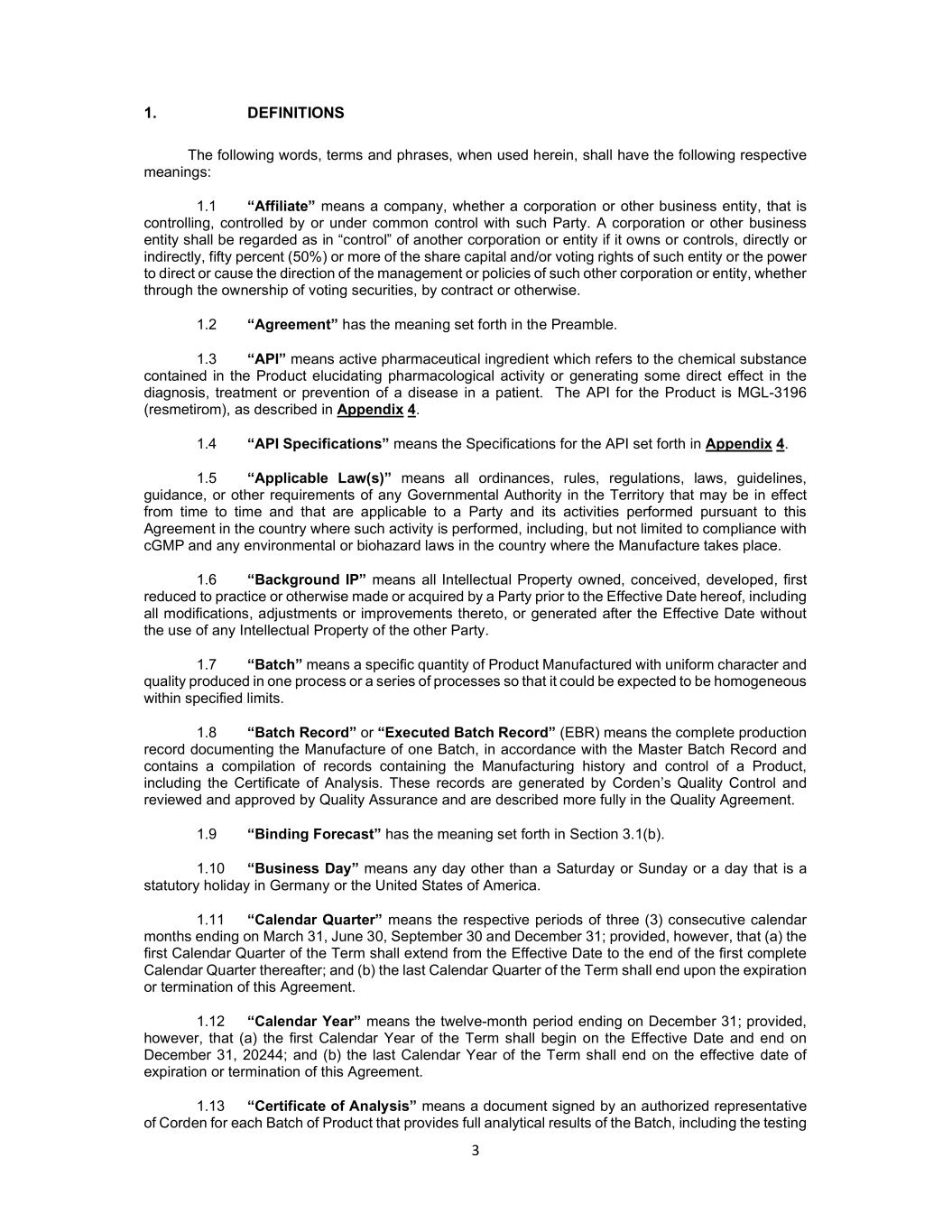 3 1. DEFINITIONS The following words, terms and phrases, when used herein, shall have the following respective meanings: 1.1 “Affiliate” means a company, whether a corporation or other business entity, that is controlling, controlled by or under common control with such Party. A corporation or other business entity shall be regarded as in “control” of another corporation or entity if it owns or controls, directly or indirectly, fifty percent (50%) or more of the share capital and/or voting rights of such entity or the power to direct or cause the direction of the management or policies of such other corporation or entity, whether through the ownership of voting securities, by contract or otherwise. 1.2 “Agreement” has the meaning set forth in the Preamble. 1.3 “API” means active pharmaceutical ingredient which refers to the chemical substance contained in the Product elucidating pharmacological activity or generating some direct effect in the diagnosis, treatment or prevention of a disease in a patient. The API for the Product is MGL-3196 (resmetirom), as described in Appendix 4. 1.4 “API Specifications” means the Specifications for the API set forth in Appendix 4. 1.5 “Applicable Law(s)” means all ordinances, rules, regulations, laws, guidelines, guidance, or other requirements of any Governmental Authority in the Territory that may be in effect from time to time and that are applicable to a Party and its activities performed pursuant to this Agreement in the country where such activity is performed, including, but not limited to compliance with cGMP and any environmental or biohazard laws in the country where the Manufacture takes place. 1.6 “Background IP” means all Intellectual Property owned, conceived, developed, first reduced to practice or otherwise made or acquired by a Party prior to the Effective Date hereof, including all modifications, adjustments or improvements thereto, or generated after the Effective Date without the use of any Intellectual Property of the other Party. 1.7 “Batch” means a specific quantity of Product Manufactured with uniform character and quality produced in one process or a series of processes so that it could be expected to be homogeneous within specified limits. 1.8 “Batch Record” or “Executed Batch Record” (EBR) means the complete production record documenting the Manufacture of one Batch, in accordance with the Master Batch Record and contains a compilation of records containing the Manufacturing history and control of a Product, including the Certificate of Analysis. These records are generated by Corden’s Quality Control and reviewed and approved by Quality Assurance and are described more fully in the Quality Agreement. 1.9 “Binding Forecast” has the meaning set forth in Section 3.1(b). 1.10 “Business Day” means any day other than a Saturday or Sunday or a day that is a statutory holiday in Germany or the United States of America. 1.11 “Calendar Quarter” means the respective periods of three (3) consecutive calendar months ending on March 31, June 30, September 30 and December 31; provided, however, that (a) the first Calendar Quarter of the Term shall extend from the Effective Date to the end of the first complete Calendar Quarter thereafter; and (b) the last Calendar Quarter of the Term shall end upon the expiration or termination of this Agreement. 1.12 “Calendar Year” means the twelve-month period ending on December 31; provided, however, that (a) the first Calendar Year of the Term shall begin on the Effective Date and end on December 31, 20244; and (b) the last Calendar Year of the Term shall end on the effective date of expiration or termination of this Agreement. 1.13 “Certificate of Analysis” means a document signed by an authorized representative of Corden for each Batch of Product that provides full analytical results of the Batch, including the testing