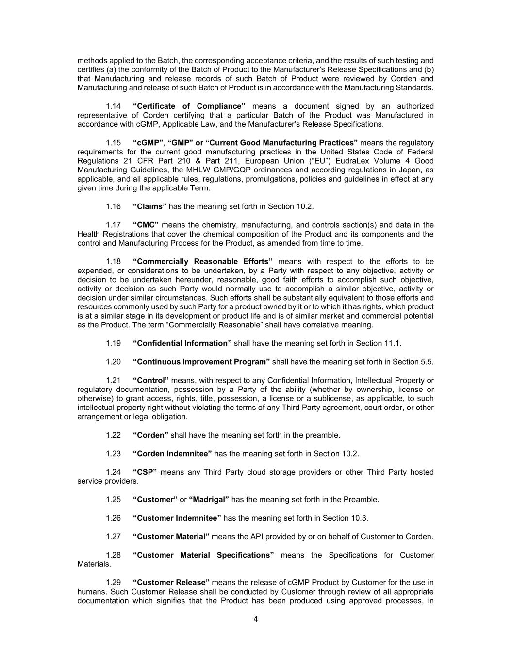 4 methods applied to the Batch, the corresponding acceptance criteria, and the results of such testing and certifies (a) the conformity of the Batch of Product to the Manufacturer’s Release Specifications and (b) that Manufacturing and release records of such Batch of Product were reviewed by Corden and Manufacturing and release of such Batch of Product is in accordance with the Manufacturing Standards. 1.14 “Certificate of Compliance” means a document signed by an authorized representative of Corden certifying that a particular Batch of the Product was Manufactured in accordance with cGMP, Applicable Law, and the Manufacturer’s Release Specifications. 1.15 “cGMP”, “GMP” or “Current Good Manufacturing Practices” means the regulatory requirements for the current good manufacturing practices in the United States Code of Federal Regulations 21 CFR Part 210 & Part 211, European Union (“EU”) EudraLex Volume 4 Good Manufacturing Guidelines, the MHLW GMP/GQP ordinances and according regulations in Japan, as applicable, and all applicable rules, regulations, promulgations, policies and guidelines in effect at any given time during the applicable Term. 1.16 “Claims” has the meaning set forth in Section 10.2. 1.17 “CMC” means the chemistry, manufacturing, and controls section(s) and data in the Health Registrations that cover the chemical composition of the Product and its components and the control and Manufacturing Process for the Product, as amended from time to time. 1.18 “Commercially Reasonable Efforts” means with respect to the efforts to be expended, or considerations to be undertaken, by a Party with respect to any objective, activity or decision to be undertaken hereunder, reasonable, good faith efforts to accomplish such objective, activity or decision as such Party would normally use to accomplish a similar objective, activity or decision under similar circumstances. Such efforts shall be substantially equivalent to those efforts and resources commonly used by such Party for a product owned by it or to which it has rights, which product is at a similar stage in its development or product life and is of similar market and commercial potential as the Product. The term “Commercially Reasonable” shall have correlative meaning. 1.19 “Confidential Information” shall have the meaning set forth in Section 11.1. 1.20 “Continuous Improvement Program” shall have the meaning set forth in Section 5.5. 1.21 “Control” means, with respect to any Confidential Information, Intellectual Property or regulatory documentation, possession by a Party of the ability (whether by ownership, license or otherwise) to grant access, rights, title, possession, a license or a sublicense, as applicable, to such intellectual property right without violating the terms of any Third Party agreement, court order, or other arrangement or legal obligation. 1.22 “Corden” shall have the meaning set forth in the preamble. 1.23 “Corden Indemnitee” has the meaning set forth in Section 10.2. 1.24 “CSP” means any Third Party cloud storage providers or other Third Party hosted service providers. 1.25 “Customer” or “Madrigal” has the meaning set forth in the Preamble. 1.26 “Customer Indemnitee” has the meaning set forth in Section 10.3. 1.27 “Customer Material” means the API provided by or on behalf of Customer to Corden. 1.28 “Customer Material Specifications” means the Specifications for Customer Materials. 1.29 “Customer Release” means the release of cGMP Product by Customer for the use in humans. Such Customer Release shall be conducted by Customer through review of all appropriate documentation which signifies that the Product has been produced using approved processes, in