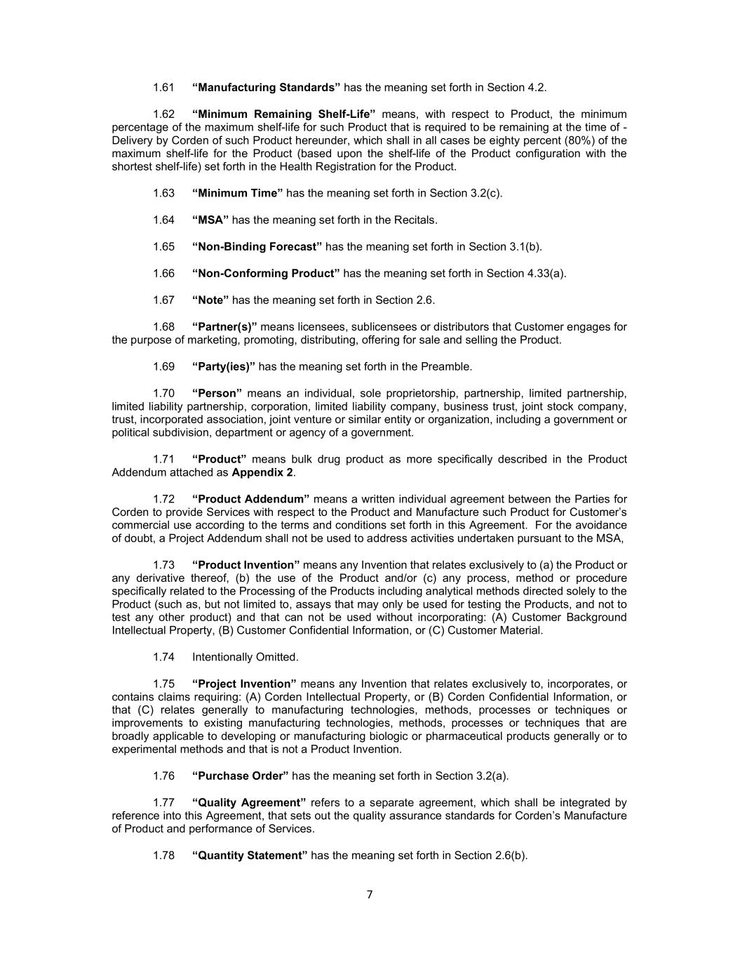 7 1.61 “Manufacturing Standards” has the meaning set forth in Section 4.2. 1.62 “Minimum Remaining Shelf-Life” means, with respect to Product, the minimum percentage of the maximum shelf-life for such Product that is required to be remaining at the time of - Delivery by Corden of such Product hereunder, which shall in all cases be eighty percent (80%) of the maximum shelf-life for the Product (based upon the shelf-life of the Product configuration with the shortest shelf-life) set forth in the Health Registration for the Product. 1.63 “Minimum Time” has the meaning set forth in Section 3.2(c). 1.64 “MSA” has the meaning set forth in the Recitals. 1.65 “Non-Binding Forecast” has the meaning set forth in Section 3.1(b). 1.66 “Non-Conforming Product” has the meaning set forth in Section 4.33(a). 1.67 “Note” has the meaning set forth in Section 2.6. 1.68 “Partner(s)” means licensees, sublicensees or distributors that Customer engages for the purpose of marketing, promoting, distributing, offering for sale and selling the Product. 1.69 “Party(ies)” has the meaning set forth in the Preamble. 1.70 “Person” means an individual, sole proprietorship, partnership, limited partnership, limited liability partnership, corporation, limited liability company, business trust, joint stock company, trust, incorporated association, joint venture or similar entity or organization, including a government or political subdivision, department or agency of a government. 1.71 “Product” means bulk drug product as more specifically described in the Product Addendum attached as Appendix 2. 1.72 “Product Addendum” means a written individual agreement between the Parties for Corden to provide Services with respect to the Product and Manufacture such Product for Customer’s commercial use according to the terms and conditions set forth in this Agreement. For the avoidance of doubt, a Project Addendum shall not be used to address activities undertaken pursuant to the MSA, 1.73 “Product Invention” means any Invention that relates exclusively to (a) the Product or any derivative thereof, (b) the use of the Product and/or (c) any process, method or procedure specifically related to the Processing of the Products including analytical methods directed solely to the Product (such as, but not limited to, assays that may only be used for testing the Products, and not to test any other product) and that can not be used without incorporating: (A) Customer Background Intellectual Property, (B) Customer Confidential Information, or (C) Customer Material. 1.74 Intentionally Omitted. 1.75 “Project Invention” means any Invention that relates exclusively to, incorporates, or contains claims requiring: (A) Corden Intellectual Property, or (B) Corden Confidential Information, or that (C) relates generally to manufacturing technologies, methods, processes or techniques or improvements to existing manufacturing technologies, methods, processes or techniques that are broadly applicable to developing or manufacturing biologic or pharmaceutical products generally or to experimental methods and that is not a Product Invention. 1.76 “Purchase Order” has the meaning set forth in Section 3.2(a). 1.77 “Quality Agreement” refers to a separate agreement, which shall be integrated by reference into this Agreement, that sets out the quality assurance standards for Corden’s Manufacture of Product and performance of Services. 1.78 “Quantity Statement” has the meaning set forth in Section 2.6(b).