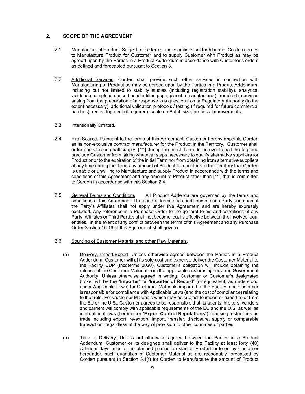 9 2. SCOPE OF THE AGREEMENT 2.1 Manufacture of Product. Subject to the terms and conditions set forth herein, Corden agrees to Manufacture Product for Customer and to supply Customer with Product as may be agreed upon by the Parties in a Product Addendum in accordance with Customer’s orders as defined and forecasted pursuant to Section 3. 2.2 Additional Services. Corden shall provide such other services in connection with Manufacturing of Product as may be agreed upon by the Parties in a Product Addendum, including but not limited to stability studies (including registration stability), analytical validation completion based on identified gaps, placebo manufacture (if required), services arising from the preparation of a response to a question from a Regulatory Authority (to the extent necessary), additional validation protocols / testing (if required for future commercial batches), redevelopment (if required), scale up Batch size, process improvements. 2.3 Intentionally Omitted. 2.4 First Source. Pursuant to the terms of this Agreement, Customer hereby appoints Corden as its non-exclusive contract manufacturer for the Product in the Territory. Customer shall order and Corden shall supply, [***] during the Initial Term. In no event shall the forgoing preclude Customer from taking whatever steps necessary to qualify alternative suppliers for Product prior to the expiration of the initial Term nor from obtaining from alternative suppliers at any time during the Term any amount of Product for countries in the Territory that Corden is unable or unwilling to Manufacture and supply Product in accordance with the terms and conditions of this Agreement and any amount of Product other than [***] that is committed to Corden in accordance with this Section 2.4. 2.5 General Terms and Conditions. All Product Addenda are governed by the terms and conditions of this Agreement. The general terms and conditions of each Party and each of the Party’s Affiliates shall not apply under this Agreement and are hereby expressly excluded. Any reference in a Purchase Order to the general terms and conditions of any Party, Affiliates or Third Parties shall not become legally effective between the involved legal entities. In the event of any conflict between the terms of this Agreement and any Purchase Order Section 16.16 of this Agreement shall govern. 2.6 Sourcing of Customer Material and other Raw Materials. (a) Delivery, Import/Export. Unless otherwise agreed between the Parties in a Product Addendum, Customer will at its sole cost and expense deliver the Customer Material to the Facility DDP (Incoterms 2020). Customer’s obligation will include obtaining the release of the Customer Material from the applicable customs agency and Government Authority. Unless otherwise agreed in writing, Customer or Customer’s designated broker will be the “Importer” or “Importer of Record” (or equivalent, as understood under Applicable Laws) for Customer Materials imported to the Facility, and Customer is responsible for compliance with Applicable Laws (and the cost of compliance) relating to that role. For Customer Materials which may be subject to import or export to or from the EU or the U.S., Customer agrees to be responsible that its agents, brokers, vendors and carriers will comply with applicable requirements of the EU and the U.S. as well as international laws (hereinafter “Export Control Regulations”) imposing restrictions on trade including export, re-export, import, transfer, disclosure, supply or comparable transaction, regardless of the way of provision to other countries or parties. (b) Time of Delivery. Unless not otherwise agreed between the Parties in a Product Addendum, Customer or its designee shall deliver to the Facility at least forty (40) calendar days prior to the planned production start of Product ordered by Customer hereunder, such quantities of Customer Material as are reasonably forecasted by Corden pursuant to Section 3.1(f) for Corden to Manufacture the amount of Product