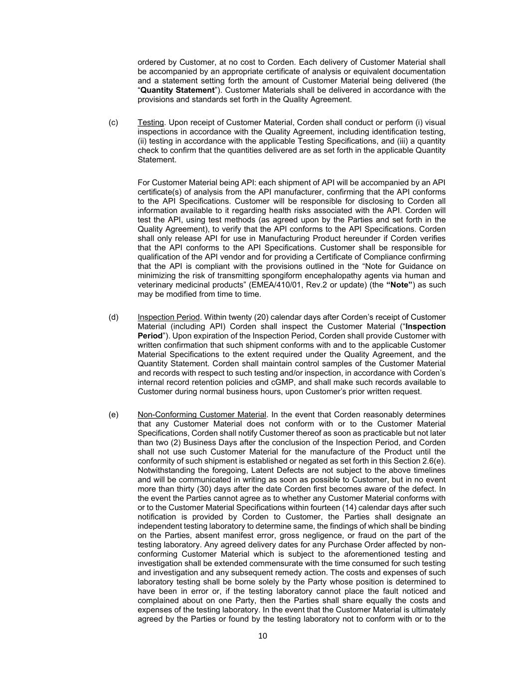 10 ordered by Customer, at no cost to Corden. Each delivery of Customer Material shall be accompanied by an appropriate certificate of analysis or equivalent documentation and a statement setting forth the amount of Customer Material being delivered (the “Quantity Statement”). Customer Materials shall be delivered in accordance with the provisions and standards set forth in the Quality Agreement. (c) Testing. Upon receipt of Customer Material, Corden shall conduct or perform (i) visual inspections in accordance with the Quality Agreement, including identification testing, (ii) testing in accordance with the applicable Testing Specifications, and (iii) a quantity check to confirm that the quantities delivered are as set forth in the applicable Quantity Statement. For Customer Material being API: each shipment of API will be accompanied by an API certificate(s) of analysis from the API manufacturer, confirming that the API conforms to the API Specifications. Customer will be responsible for disclosing to Corden all information available to it regarding health risks associated with the API. Corden will test the API, using test methods (as agreed upon by the Parties and set forth in the Quality Agreement), to verify that the API conforms to the API Specifications. Corden shall only release API for use in Manufacturing Product hereunder if Corden verifies that the API conforms to the API Specifications. Customer shall be responsible for qualification of the API vendor and for providing a Certificate of Compliance confirming that the API is compliant with the provisions outlined in the “Note for Guidance on minimizing the risk of transmitting spongiform encephalopathy agents via human and veterinary medicinal products” (EMEA/410/01, Rev.2 or update) (the “Note”) as such may be modified from time to time. (d) Inspection Period. Within twenty (20) calendar days after Corden’s receipt of Customer Material (including API) Corden shall inspect the Customer Material (“Inspection Period”). Upon expiration of the Inspection Period, Corden shall provide Customer with written confirmation that such shipment conforms with and to the applicable Customer Material Specifications to the extent required under the Quality Agreement, and the Quantity Statement. Corden shall maintain control samples of the Customer Material and records with respect to such testing and/or inspection, in accordance with Corden’s internal record retention policies and cGMP, and shall make such records available to Customer during normal business hours, upon Customer’s prior written request. (e) Non-Conforming Customer Material. In the event that Corden reasonably determines that any Customer Material does not conform with or to the Customer Material Specifications, Corden shall notify Customer thereof as soon as practicable but not later than two (2) Business Days after the conclusion of the Inspection Period, and Corden shall not use such Customer Material for the manufacture of the Product until the conformity of such shipment is established or negated as set forth in this Section 2.6(e). Notwithstanding the foregoing, Latent Defects are not subject to the above timelines and will be communicated in writing as soon as possible to Customer, but in no event more than thirty (30) days after the date Corden first becomes aware of the defect. In the event the Parties cannot agree as to whether any Customer Material conforms with or to the Customer Material Specifications within fourteen (14) calendar days after such notification is provided by Corden to Customer, the Parties shall designate an independent testing laboratory to determine same, the findings of which shall be binding on the Parties, absent manifest error, gross negligence, or fraud on the part of the testing laboratory. Any agreed delivery dates for any Purchase Order affected by non- conforming Customer Material which is subject to the aforementioned testing and investigation shall be extended commensurate with the time consumed for such testing and investigation and any subsequent remedy action. The costs and expenses of such laboratory testing shall be borne solely by the Party whose position is determined to have been in error or, if the testing laboratory cannot place the fault noticed and complained about on one Party, then the Parties shall share equally the costs and expenses of the testing laboratory. In the event that the Customer Material is ultimately agreed by the Parties or found by the testing laboratory not to conform with or to the