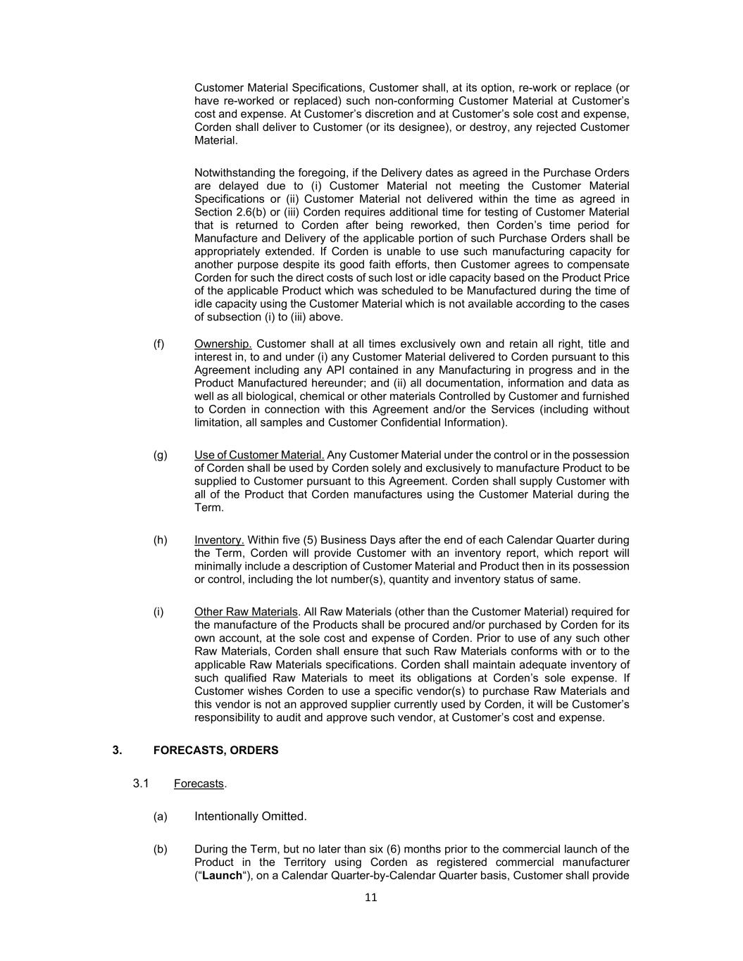 11 Customer Material Specifications, Customer shall, at its option, re-work or replace (or have re-worked or replaced) such non-conforming Customer Material at Customer’s cost and expense. At Customer’s discretion and at Customer’s sole cost and expense, Corden shall deliver to Customer (or its designee), or destroy, any rejected Customer Material. Notwithstanding the foregoing, if the Delivery dates as agreed in the Purchase Orders are delayed due to (i) Customer Material not meeting the Customer Material Specifications or (ii) Customer Material not delivered within the time as agreed in Section 2.6(b) or (iii) Corden requires additional time for testing of Customer Material that is returned to Corden after being reworked, then Corden’s time period for Manufacture and Delivery of the applicable portion of such Purchase Orders shall be appropriately extended. If Corden is unable to use such manufacturing capacity for another purpose despite its good faith efforts, then Customer agrees to compensate Corden for such the direct costs of such lost or idle capacity based on the Product Price of the applicable Product which was scheduled to be Manufactured during the time of idle capacity using the Customer Material which is not available according to the cases of subsection (i) to (iii) above. (f) Ownership. Customer shall at all times exclusively own and retain all right, title and interest in, to and under (i) any Customer Material delivered to Corden pursuant to this Agreement including any API contained in any Manufacturing in progress and in the Product Manufactured hereunder; and (ii) all documentation, information and data as well as all biological, chemical or other materials Controlled by Customer and furnished to Corden in connection with this Agreement and/or the Services (including without limitation, all samples and Customer Confidential Information). (g) Use of Customer Material. Any Customer Material under the control or in the possession of Corden shall be used by Corden solely and exclusively to manufacture Product to be supplied to Customer pursuant to this Agreement. Corden shall supply Customer with all of the Product that Corden manufactures using the Customer Material during the Term. (h) Inventory. Within five (5) Business Days after the end of each Calendar Quarter during the Term, Corden will provide Customer with an inventory report, which report will minimally include a description of Customer Material and Product then in its possession or control, including the lot number(s), quantity and inventory status of same. (i) Other Raw Materials. All Raw Materials (other than the Customer Material) required for the manufacture of the Products shall be procured and/or purchased by Corden for its own account, at the sole cost and expense of Corden. Prior to use of any such other Raw Materials, Corden shall ensure that such Raw Materials conforms with or to the applicable Raw Materials specifications. Corden shall maintain adequate inventory of such qualified Raw Materials to meet its obligations at Corden’s sole expense. If Customer wishes Corden to use a specific vendor(s) to purchase Raw Materials and this vendor is not an approved supplier currently used by Corden, it will be Customer’s responsibility to audit and approve such vendor, at Customer’s cost and expense. 3. FORECASTS, ORDERS 3.1 Forecasts. (a) Intentionally Omitted. (b) During the Term, but no later than six (6) months prior to the commercial launch of the Product in the Territory using Corden as registered commercial manufacturer (“Launch“), on a Calendar Quarter-by-Calendar Quarter basis, Customer shall provide