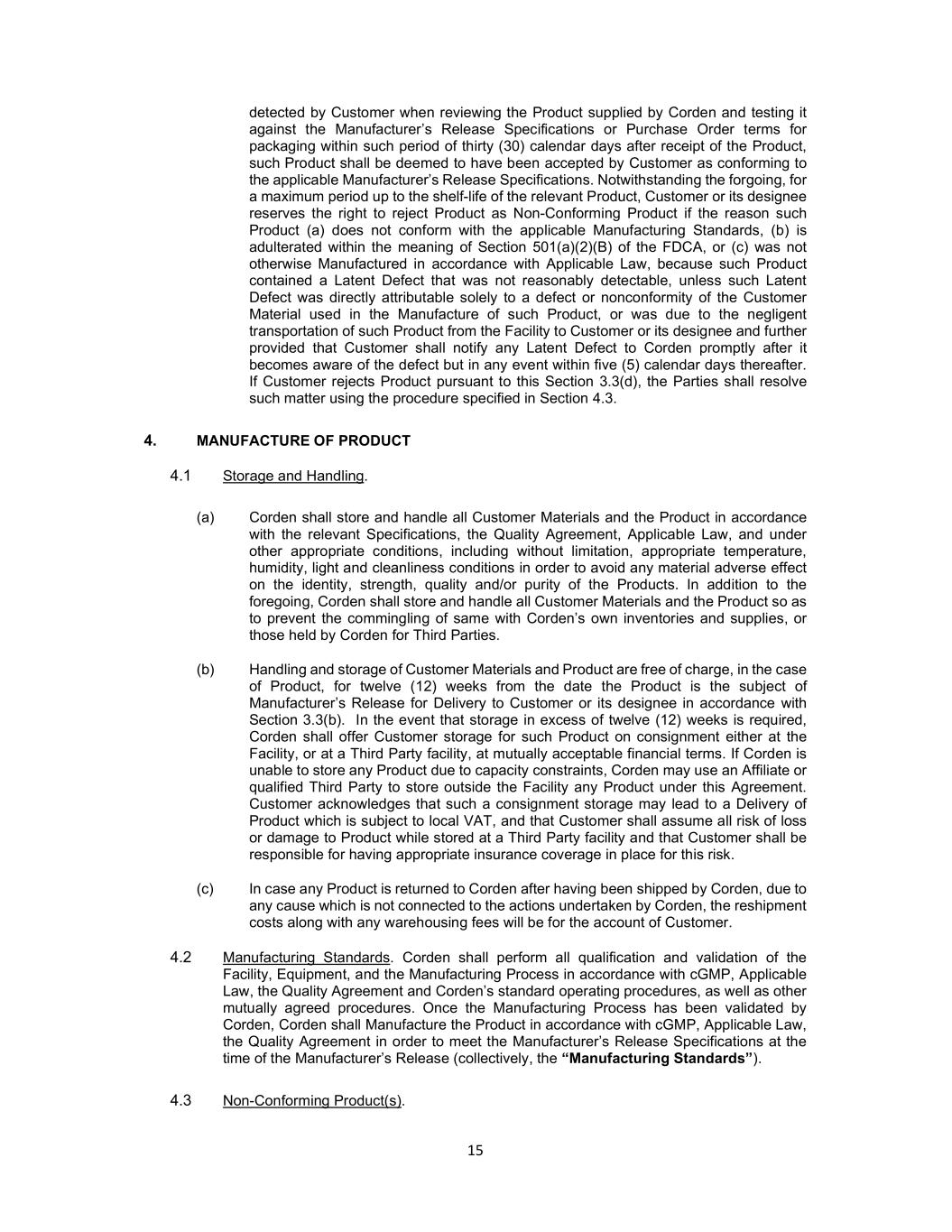 15 detected by Customer when reviewing the Product supplied by Corden and testing it against the Manufacturer’s Release Specifications or Purchase Order terms for packaging within such period of thirty (30) calendar days after receipt of the Product, such Product shall be deemed to have been accepted by Customer as conforming to the applicable Manufacturer’s Release Specifications. Notwithstanding the forgoing, for a maximum period up to the shelf-life of the relevant Product, Customer or its designee reserves the right to reject Product as Non-Conforming Product if the reason such Product (a) does not conform with the applicable Manufacturing Standards, (b) is adulterated within the meaning of Section 501(a)(2)(B) of the FDCA, or (c) was not otherwise Manufactured in accordance with Applicable Law, because such Product contained a Latent Defect that was not reasonably detectable, unless such Latent Defect was directly attributable solely to a defect or nonconformity of the Customer Material used in the Manufacture of such Product, or was due to the negligent transportation of such Product from the Facility to Customer or its designee and further provided that Customer shall notify any Latent Defect to Corden promptly after it becomes aware of the defect but in any event within five (5) calendar days thereafter. If Customer rejects Product pursuant to this Section 3.3(d), the Parties shall resolve such matter using the procedure specified in Section 4.3. 4. MANUFACTURE OF PRODUCT 4.1 Storage and Handling. (a) Corden shall store and handle all Customer Materials and the Product in accordance with the relevant Specifications, the Quality Agreement, Applicable Law, and under other appropriate conditions, including without limitation, appropriate temperature, humidity, light and cleanliness conditions in order to avoid any material adverse effect on the identity, strength, quality and/or purity of the Products. In addition to the foregoing, Corden shall store and handle all Customer Materials and the Product so as to prevent the commingling of same with Corden’s own inventories and supplies, or those held by Corden for Third Parties. (b) Handling and storage of Customer Materials and Product are free of charge, in the case of Product, for twelve (12) weeks from the date the Product is the subject of Manufacturer’s Release for Delivery to Customer or its designee in accordance with Section 3.3(b). In the event that storage in excess of twelve (12) weeks is required, Corden shall offer Customer storage for such Product on consignment either at the Facility, or at a Third Party facility, at mutually acceptable financial terms. If Corden is unable to store any Product due to capacity constraints, Corden may use an Affiliate or qualified Third Party to store outside the Facility any Product under this Agreement. Customer acknowledges that such a consignment storage may lead to a Delivery of Product which is subject to local VAT, and that Customer shall assume all risk of loss or damage to Product while stored at a Third Party facility and that Customer shall be responsible for having appropriate insurance coverage in place for this risk. (c) In case any Product is returned to Corden after having been shipped by Corden, due to any cause which is not connected to the actions undertaken by Corden, the reshipment costs along with any warehousing fees will be for the account of Customer. 4.2 Manufacturing Standards. Corden shall perform all qualification and validation of the Facility, Equipment, and the Manufacturing Process in accordance with cGMP, Applicable Law, the Quality Agreement and Corden’s standard operating procedures, as well as other mutually agreed procedures. Once the Manufacturing Process has been validated by Corden, Corden shall Manufacture the Product in accordance with cGMP, Applicable Law, the Quality Agreement in order to meet the Manufacturer’s Release Specifications at the time of the Manufacturer’s Release (collectively, the “Manufacturing Standards”). 4.3 Non-Conforming Product(s).