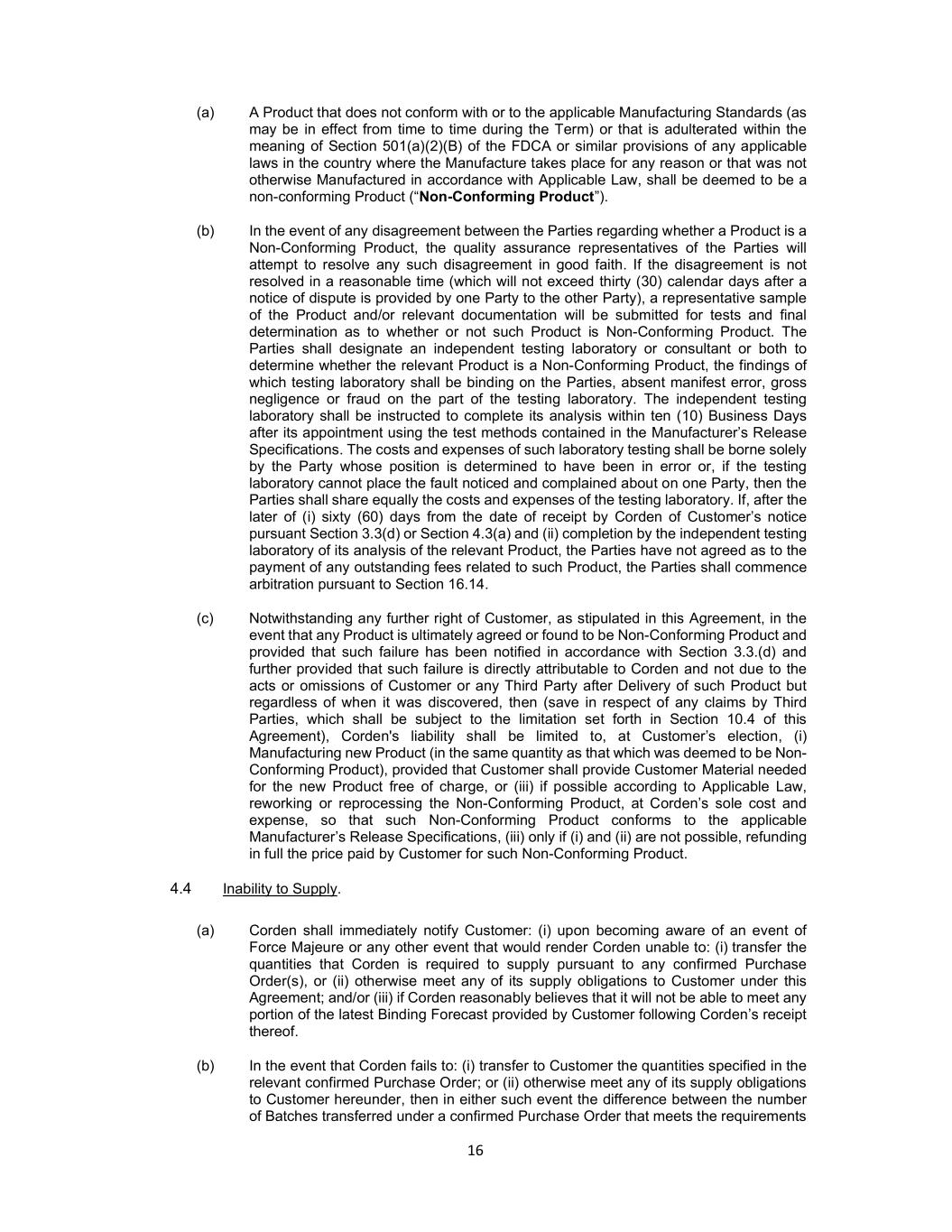 16 (a) A Product that does not conform with or to the applicable Manufacturing Standards (as may be in effect from time to time during the Term) or that is adulterated within the meaning of Section 501(a)(2)(B) of the FDCA or similar provisions of any applicable laws in the country where the Manufacture takes place for any reason or that was not otherwise Manufactured in accordance with Applicable Law, shall be deemed to be a non-conforming Product (“Non-Conforming Product”). (b) In the event of any disagreement between the Parties regarding whether a Product is a Non-Conforming Product, the quality assurance representatives of the Parties will attempt to resolve any such disagreement in good faith. If the disagreement is not resolved in a reasonable time (which will not exceed thirty (30) calendar days after a notice of dispute is provided by one Party to the other Party), a representative sample of the Product and/or relevant documentation will be submitted for tests and final determination as to whether or not such Product is Non-Conforming Product. The Parties shall designate an independent testing laboratory or consultant or both to determine whether the relevant Product is a Non-Conforming Product, the findings of which testing laboratory shall be binding on the Parties, absent manifest error, gross negligence or fraud on the part of the testing laboratory. The independent testing laboratory shall be instructed to complete its analysis within ten (10) Business Days after its appointment using the test methods contained in the Manufacturer’s Release Specifications. The costs and expenses of such laboratory testing shall be borne solely by the Party whose position is determined to have been in error or, if the testing laboratory cannot place the fault noticed and complained about on one Party, then the Parties shall share equally the costs and expenses of the testing laboratory. If, after the later of (i) sixty (60) days from the date of receipt by Corden of Customer’s notice pursuant Section 3.3(d) or Section 4.3(a) and (ii) completion by the independent testing laboratory of its analysis of the relevant Product, the Parties have not agreed as to the payment of any outstanding fees related to such Product, the Parties shall commence arbitration pursuant to Section 16.14. (c) Notwithstanding any further right of Customer, as stipulated in this Agreement, in the event that any Product is ultimately agreed or found to be Non-Conforming Product and provided that such failure has been notified in accordance with Section 3.3.(d) and further provided that such failure is directly attributable to Corden and not due to the acts or omissions of Customer or any Third Party after Delivery of such Product but regardless of when it was discovered, then (save in respect of any claims by Third Parties, which shall be subject to the limitation set forth in Section 10.4 of this Agreement), Corden's liability shall be limited to, at Customer’s election, (i) Manufacturing new Product (in the same quantity as that which was deemed to be Non- Conforming Product), provided that Customer shall provide Customer Material needed for the new Product free of charge, or (iii) if possible according to Applicable Law, reworking or reprocessing the Non-Conforming Product, at Corden’s sole cost and expense, so that such Non-Conforming Product conforms to the applicable Manufacturer’s Release Specifications, (iii) only if (i) and (ii) are not possible, refunding in full the price paid by Customer for such Non-Conforming Product. 4.4 Inability to Supply. (a) Corden shall immediately notify Customer: (i) upon becoming aware of an event of Force Majeure or any other event that would render Corden unable to: (i) transfer the quantities that Corden is required to supply pursuant to any confirmed Purchase Order(s), or (ii) otherwise meet any of its supply obligations to Customer under this Agreement; and/or (iii) if Corden reasonably believes that it will not be able to meet any portion of the latest Binding Forecast provided by Customer following Corden’s receipt thereof. (b) In the event that Corden fails to: (i) transfer to Customer the quantities specified in the relevant confirmed Purchase Order; or (ii) otherwise meet any of its supply obligations to Customer hereunder, then in either such event the difference between the number of Batches transferred under a confirmed Purchase Order that meets the requirements