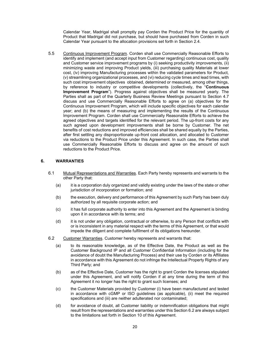20 Calendar Year, Madrigal shall promptly pay Corden the Product Price for the quantity of Product that Madrigal did not purchase, but should have purchased from Corden in such Calendar Year pursuant to the allocation provisions set forth in Section 2.4. 5.5 Continuous Improvement Program. Corden shall use Commercially Reasonable Efforts to identify and implement (and accept input from Customer regarding) continuous cost, quality and Customer service improvement programs by (i) seeking productivity improvements, (ii) minimizing waste and improving Product yields, (iii) purchasing quality Materials at lower cost, (iv) improving Manufacturing processes within the validated parameters for Product, (v) streamlining organizational processes, and (vi) reducing cycle times and lead times, with such cost improvement objectives obtained, determined or measured, among other things, by reference to industry or competitive developments (collectively, the “Continuous Improvement Program”). Progress against objectives shall be measured yearly. The Parties shall as part of the Quarterly Business Review Meetings pursuant to Section 4.7 discuss and use Commercially Reasonable Efforts to agree on (a) objectives for the Continuous Improvement Program, which will include specific objectives for each calendar year; and (b) the means of measuring and implementing the results of the Continuous Improvement Program. Corden shall use Commercially Reasonable Efforts to achieve the agreed objectives and targets identified for the relevant period. The up-front costs for any such agreed upon development improvements shall be borne by Customer. The net benefits of cost reductions and improved efficiencies shall be shared equally by the Parties, after first settling any disproportionate up-front cost allocation, and allocated to Customer via reductions to the Product Price under this Agreement. In such case, the Parties shall use Commercially Reasonable Efforts to discuss and agree on the amount of such reductions to the Product Price. 6. WARRANTIES 6.1 Mutual Representations and Warranties. Each Party hereby represents and warrants to the other Party that: (a) it is a corporation duly organized and validly existing under the laws of the state or other jurisdiction of incorporation or formation; and (b) the execution, delivery and performance of this Agreement by such Party has been duly authorized by all requisite corporate action; and (c) it has full corporate authority to enter into this Agreement and the Agreement is binding upon it in accordance with its terms; and (d) it is not under any obligation, contractual or otherwise, to any Person that conflicts with or is inconsistent in any material respect with the terms of this Agreement, or that would impede the diligent and complete fulfilment of its obligations hereunder. 6.2 Customer Warranties. Customer hereby represents and warrants that: (a) to its reasonable knowledge, as of the Effective Date, the Product as well as the Customer Background IP and all Customer Confidential Information (including for the avoidance of doubt the Manufacturing Process) and their use by Corden or its Affiliates in accordance with this Agreement do not infringe the Intellectual Property Rights of any Third Party; and (b) as of the Effective Date, Customer has the right to grant Corden the licenses stipulated under this Agreement, and will notify Corden if at any time during the term of this Agreement it no longer has the right to grant such licenses; and (c) the Customer Materials provided by Customer (i) have been manufactured and tested in accordance with cGMP or ISO guidelines (as applicable), (ii) meet the required specifications and (iii) are neither adulterated nor contaminated; (d) for avoidance of doubt, all Customer liability or indemnification obligations that might result from the representations and warranties under this Section 6.2 are always subject to the limitations set forth in Section 10 of this Agreement.