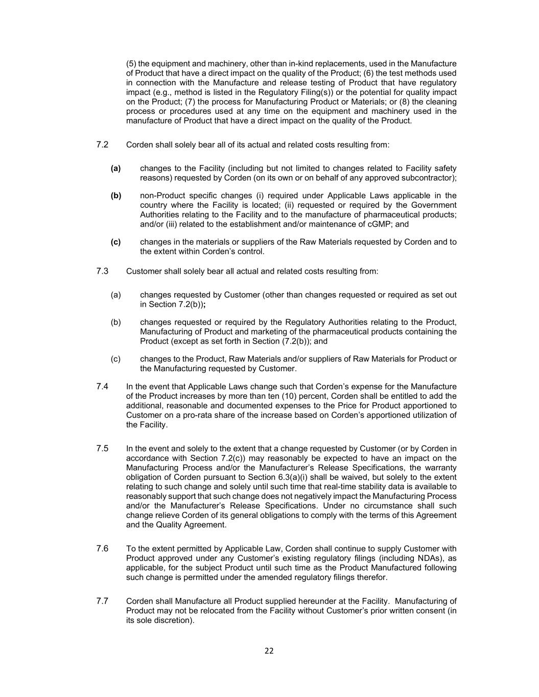 22 (5) the equipment and machinery, other than in-kind replacements, used in the Manufacture of Product that have a direct impact on the quality of the Product; (6) the test methods used in connection with the Manufacture and release testing of Product that have regulatory impact (e.g., method is listed in the Regulatory Filing(s)) or the potential for quality impact on the Product; (7) the process for Manufacturing Product or Materials; or (8) the cleaning process or procedures used at any time on the equipment and machinery used in the manufacture of Product that have a direct impact on the quality of the Product. 7.2 Corden shall solely bear all of its actual and related costs resulting from: (a) changes to the Facility (including but not limited to changes related to Facility safety reasons) requested by Corden (on its own or on behalf of any approved subcontractor); (b) non-Product specific changes (i) required under Applicable Laws applicable in the country where the Facility is located; (ii) requested or required by the Government Authorities relating to the Facility and to the manufacture of pharmaceutical products; and/or (iii) related to the establishment and/or maintenance of cGMP; and (c) changes in the materials or suppliers of the Raw Materials requested by Corden and to the extent within Corden’s control. 7.3 Customer shall solely bear all actual and related costs resulting from: (a) changes requested by Customer (other than changes requested or required as set out in Section 7.2(b)); (b) changes requested or required by the Regulatory Authorities relating to the Product, Manufacturing of Product and marketing of the pharmaceutical products containing the Product (except as set forth in Section (7.2(b)); and (c) changes to the Product, Raw Materials and/or suppliers of Raw Materials for Product or the Manufacturing requested by Customer. 7.4 In the event that Applicable Laws change such that Corden’s expense for the Manufacture of the Product increases by more than ten (10) percent, Corden shall be entitled to add the additional, reasonable and documented expenses to the Price for Product apportioned to Customer on a pro-rata share of the increase based on Corden’s apportioned utilization of the Facility. 7.5 In the event and solely to the extent that a change requested by Customer (or by Corden in accordance with Section 7.2(c)) may reasonably be expected to have an impact on the Manufacturing Process and/or the Manufacturer’s Release Specifications, the warranty obligation of Corden pursuant to Section 6.3(a)(i) shall be waived, but solely to the extent relating to such change and solely until such time that real-time stability data is available to reasonably support that such change does not negatively impact the Manufacturing Process and/or the Manufacturer’s Release Specifications. Under no circumstance shall such change relieve Corden of its general obligations to comply with the terms of this Agreement and the Quality Agreement. 7.6 To the extent permitted by Applicable Law, Corden shall continue to supply Customer with Product approved under any Customer’s existing regulatory filings (including NDAs), as applicable, for the subject Product until such time as the Product Manufactured following such change is permitted under the amended regulatory filings therefor. 7.7 Corden shall Manufacture all Product supplied hereunder at the Facility. Manufacturing of Product may not be relocated from the Facility without Customer’s prior written consent (in its sole discretion).