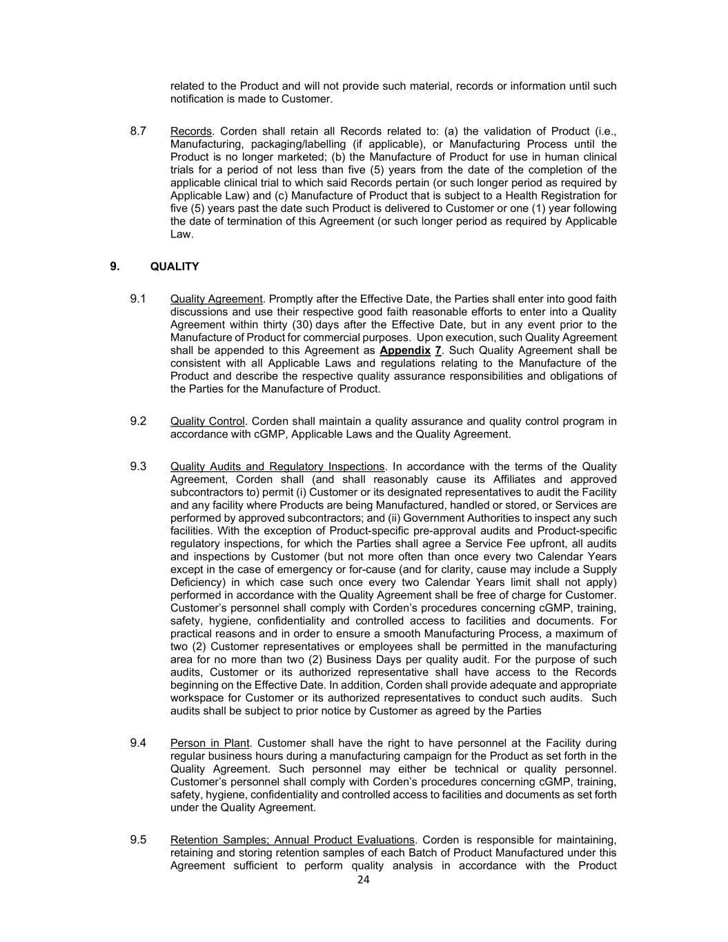 24 related to the Product and will not provide such material, records or information until such notification is made to Customer. 8.7 Records. Corden shall retain all Records related to: (a) the validation of Product (i.e., Manufacturing, packaging/labelling (if applicable), or Manufacturing Process until the Product is no longer marketed; (b) the Manufacture of Product for use in human clinical trials for a period of not less than five (5) years from the date of the completion of the applicable clinical trial to which said Records pertain (or such longer period as required by Applicable Law) and (c) Manufacture of Product that is subject to a Health Registration for five (5) years past the date such Product is delivered to Customer or one (1) year following the date of termination of this Agreement (or such longer period as required by Applicable Law. 9. QUALITY 9.1 Quality Agreement. Promptly after the Effective Date, the Parties shall enter into good faith discussions and use their respective good faith reasonable efforts to enter into a Quality Agreement within thirty (30) days after the Effective Date, but in any event prior to the Manufacture of Product for commercial purposes. Upon execution, such Quality Agreement shall be appended to this Agreement as Appendix 7. Such Quality Agreement shall be consistent with all Applicable Laws and regulations relating to the Manufacture of the Product and describe the respective quality assurance responsibilities and obligations of the Parties for the Manufacture of Product. 9.2 Quality Control. Corden shall maintain a quality assurance and quality control program in accordance with cGMP, Applicable Laws and the Quality Agreement. 9.3 Quality Audits and Regulatory Inspections. In accordance with the terms of the Quality Agreement, Corden shall (and shall reasonably cause its Affiliates and approved subcontractors to) permit (i) Customer or its designated representatives to audit the Facility and any facility where Products are being Manufactured, handled or stored, or Services are performed by approved subcontractors; and (ii) Government Authorities to inspect any such facilities. With the exception of Product-specific pre-approval audits and Product-specific regulatory inspections, for which the Parties shall agree a Service Fee upfront, all audits and inspections by Customer (but not more often than once every two Calendar Years except in the case of emergency or for-cause (and for clarity, cause may include a Supply Deficiency) in which case such once every two Calendar Years limit shall not apply) performed in accordance with the Quality Agreement shall be free of charge for Customer. Customer’s personnel shall comply with Corden’s procedures concerning cGMP, training, safety, hygiene, confidentiality and controlled access to facilities and documents. For practical reasons and in order to ensure a smooth Manufacturing Process, a maximum of two (2) Customer representatives or employees shall be permitted in the manufacturing area for no more than two (2) Business Days per quality audit. For the purpose of such audits, Customer or its authorized representative shall have access to the Records beginning on the Effective Date. In addition, Corden shall provide adequate and appropriate workspace for Customer or its authorized representatives to conduct such audits. Such audits shall be subject to prior notice by Customer as agreed by the Parties 9.4 Person in Plant. Customer shall have the right to have personnel at the Facility during regular business hours during a manufacturing campaign for the Product as set forth in the Quality Agreement. Such personnel may either be technical or quality personnel. Customer’s personnel shall comply with Corden’s procedures concerning cGMP, training, safety, hygiene, confidentiality and controlled access to facilities and documents as set forth under the Quality Agreement. 9.5 Retention Samples; Annual Product Evaluations. Corden is responsible for maintaining, retaining and storing retention samples of each Batch of Product Manufactured under this Agreement sufficient to perform quality analysis in accordance with the Product