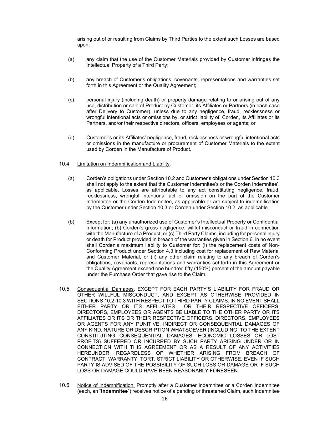 26 arising out of or resulting from Claims by Third Parties to the extent such Losses are based upon: (a) any claim that the use of the Customer Materials provided by Customer infringes the Intellectual Property of a Third Party; (b) any breach of Customer’s obligations, covenants, representations and warranties set forth in this Agreement or the Quality Agreement; (c) personal injury (including death) or property damage relating to or arising out of any use, distribution or sale of Product by Customer, its Affiliates or Partners (in each case after Delivery to Customer), unless due to any negligence, fraud, recklessness or wrongful intentional acts or omissions by, or strict liability of, Corden, its Affiliates or its Partners, and/or their respective directors, officers, employees or agents; or (d) Customer’s or its Affiliates’ negligence, fraud, recklessness or wrongful intentional acts or omissions in the manufacture or procurement of Customer Materials to the extent used by Corden in the Manufacture of Product. 10.4 Limitation on Indemnification and Liability. (a) Corden’s obligations under Section 10.2 and Customer’s obligations under Section 10.3 shall not apply to the extent that the Customer Indemnitee’s or the Corden Indemnitee’, as applicable, Losses are attributable to any act constituting negligence, fraud, recklessness, wrongful intentional act or omission on the part of the Customer Indemnitee or the Corden Indemnitee, as applicable or are subject to indemnification by the Customer under Section 10.3 or Corden under Section 10.2, as applicable. (b) Except for: (a) any unauthorized use of Customer’s Intellectual Property or Confidential Information; (b) Corden’s gross negligence, willful misconduct or fraud in connection with the Manufacture of a Product; or (c) Third Party Claims, including for personal injury or death for Product provided in breach of the warranties given in Section 6, in no event shall Corden’s maximum liability to Customer for: (i) the replacement costs of Non- Conforming Product under Section 4.3 including cost for replacement of Raw Material and Customer Material, or (ii) any other claim relating to any breach of Corden’s obligations, covenants, representations and warranties set forth in this Agreement or the Quality Agreement exceed one hundred fifty (150%) percent of the amount payable under the Purchase Order that gave rise to the Claim. 10.5 Consequential Damages. EXCEPT FOR EACH PARTY’S LIABILITY FOR FRAUD OR OTHER WILLFUL MISCONDUCT, AND EXCEPT AS OTHERWISE PROVIDED IN SECTIONS 10.2-10.3 WITH RESPECT TO THIRD PARTY CLAIMS, IN NO EVENT SHALL EITHER PARTY OR ITS AFFILIATES OR THEIR RESPECTIVE OFFICERS, DIRECTORS, EMPLOYEES OR AGENTS BE LIABLE TO THE OTHER PARTY OR ITS AFFILIATES OR ITS OR THEIR RESPECTIVE OFFICERS, DIRECTORS, EMPLOYEES OR AGENTS FOR ANY PUNITIVE, INDIRECT OR CONSEQUENTIAL DAMAGES OF ANY KIND, NATURE OR DESCRIPTION WHATSOEVER (INCLUDING, TO THE EXTENT CONSTITUTING CONSEQUENTIAL DAMAGES, ECONOMIC LOSSES OR LOST PROFITS) SUFFERED OR INCURRED BY SUCH PARTY ARISING UNDER OR IN CONNECTION WITH THIS AGREEMENT OR AS A RESULT OF ANY ACTIVITIES HEREUNDER, REGARDLESS OF WHETHER ARISING FROM BREACH OF CONTRACT, WARRANTY, TORT, STRICT LIABILITY OR OTHERWISE, EVEN IF SUCH PARTY IS ADVISED OF THE POSSIBILITY OF SUCH LOSS OR DAMAGE OR IF SUCH LOSS OR DAMAGE COULD HAVE BEEN REASONABLY FORESEEN. 10.6 Notice of Indemnification. Promptly after a Customer Indemnitee or a Corden Indemnitee (each, an “Indemnitee”) receives notice of a pending or threatened Claim, such Indemnitee