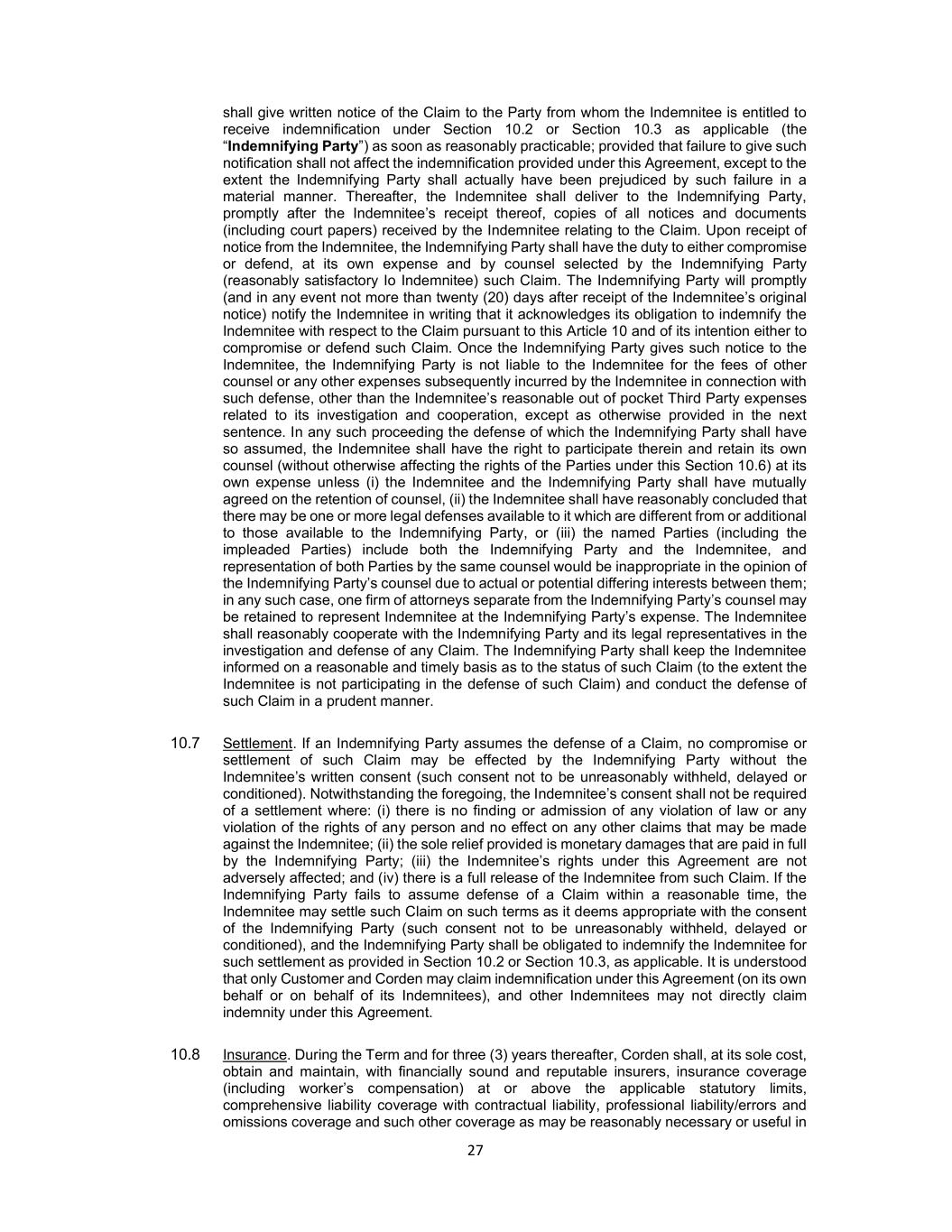 27 shall give written notice of the Claim to the Party from whom the Indemnitee is entitled to receive indemnification under Section 10.2 or Section 10.3 as applicable (the “Indemnifying Party”) as soon as reasonably practicable; provided that failure to give such notification shall not affect the indemnification provided under this Agreement, except to the extent the Indemnifying Party shall actually have been prejudiced by such failure in a material manner. Thereafter, the Indemnitee shall deliver to the Indemnifying Party, promptly after the Indemnitee’s receipt thereof, copies of all notices and documents (including court papers) received by the Indemnitee relating to the Claim. Upon receipt of notice from the Indemnitee, the Indemnifying Party shall have the duty to either compromise or defend, at its own expense and by counsel selected by the Indemnifying Party (reasonably satisfactory Io Indemnitee) such Claim. The Indemnifying Party will promptly (and in any event not more than twenty (20) days after receipt of the Indemnitee’s original notice) notify the Indemnitee in writing that it acknowledges its obligation to indemnify the Indemnitee with respect to the Claim pursuant to this Article 10 and of its intention either to compromise or defend such Claim. Once the Indemnifying Party gives such notice to the Indemnitee, the Indemnifying Party is not liable to the Indemnitee for the fees of other counsel or any other expenses subsequently incurred by the Indemnitee in connection with such defense, other than the Indemnitee’s reasonable out of pocket Third Party expenses related to its investigation and cooperation, except as otherwise provided in the next sentence. In any such proceeding the defense of which the Indemnifying Party shall have so assumed, the Indemnitee shall have the right to participate therein and retain its own counsel (without otherwise affecting the rights of the Parties under this Section 10.6) at its own expense unless (i) the Indemnitee and the Indemnifying Party shall have mutually agreed on the retention of counsel, (ii) the Indemnitee shall have reasonably concluded that there may be one or more legal defenses available to it which are different from or additional to those available to the Indemnifying Party, or (iii) the named Parties (including the impleaded Parties) include both the Indemnifying Party and the Indemnitee, and representation of both Parties by the same counsel would be inappropriate in the opinion of the Indemnifying Party’s counsel due to actual or potential differing interests between them; in any such case, one firm of attorneys separate from the Indemnifying Party’s counsel may be retained to represent Indemnitee at the Indemnifying Party’s expense. The Indemnitee shall reasonably cooperate with the Indemnifying Party and its legal representatives in the investigation and defense of any Claim. The Indemnifying Party shall keep the Indemnitee informed on a reasonable and timely basis as to the status of such Claim (to the extent the Indemnitee is not participating in the defense of such Claim) and conduct the defense of such Claim in a prudent manner. 10.7 Settlement. If an Indemnifying Party assumes the defense of a Claim, no compromise or settlement of such Claim may be effected by the Indemnifying Party without the Indemnitee’s written consent (such consent not to be unreasonably withheld, delayed or conditioned). Notwithstanding the foregoing, the Indemnitee’s consent shall not be required of a settlement where: (i) there is no finding or admission of any violation of law or any violation of the rights of any person and no effect on any other claims that may be made against the Indemnitee; (ii) the sole relief provided is monetary damages that are paid in full by the Indemnifying Party; (iii) the Indemnitee’s rights under this Agreement are not adversely affected; and (iv) there is a full release of the Indemnitee from such Claim. If the Indemnifying Party fails to assume defense of a Claim within a reasonable time, the Indemnitee may settle such Claim on such terms as it deems appropriate with the consent of the Indemnifying Party (such consent not to be unreasonably withheld, delayed or conditioned), and the Indemnifying Party shall be obligated to indemnify the Indemnitee for such settlement as provided in Section 10.2 or Section 10.3, as applicable. It is understood that only Customer and Corden may claim indemnification under this Agreement (on its own behalf or on behalf of its Indemnitees), and other Indemnitees may not directly claim indemnity under this Agreement. 10.8 Insurance. During the Term and for three (3) years thereafter, Corden shall, at its sole cost, obtain and maintain, with financially sound and reputable insurers, insurance coverage (including worker’s compensation) at or above the applicable statutory limits, comprehensive liability coverage with contractual liability, professional liability/errors and omissions coverage and such other coverage as may be reasonably necessary or useful in