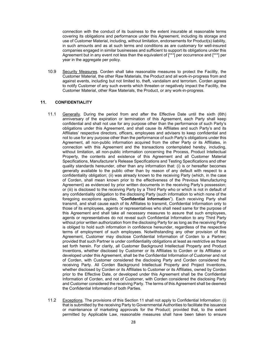 28 connection with the conduct of its business to the extent insurable at reasonable terms covering its obligations and performance under this Agreement, including its storage and use of Customer Material, including, without limitation, endorsements for Product(s) liability, in such amounts and as at such terms and conditions as are customary for well-insured companies engaged in similar businesses and sufficient to support its obligations under this Agreement but in any event not less than the equivalent of [***] per occurrence and [***] per year in the aggregate per policy. 10.9 Security Measures. Corden shall take reasonable measures to protect the Facility, the Customer Material, the other Raw Materials, the Product and all work-in-progress from and against events, including but not limited to, theft, vandalism and terrorism. Corden agrees to notify Customer of any such events which threaten or negatively impact the Facility, the Customer Material, other Raw Materials, the Product, or any work-in-progress. 11. CONFIDENTIALITY 11.1 Generally. During the period from and after the Effective Date until the sixth (6th) anniversary of the expiration or termination of this Agreement, each Party shall keep confidential and shall not use for any purpose other than the performance of such Party’s obligations under this Agreement, and shall cause its Affiliates and such Party’s and its Affiliates’ respective directors, officers, employees and advisers to keep confidential and not to use for any purpose other than the performance of such Party’s obligations under this Agreement, all non-public information acquired from the other Party or its Affiliates, in connection with this Agreement and the transactions contemplated hereby, including, without limitation, all non-public information concerning the Process, Product Intellectual Property, the contents and existence of this Agreement and all Customer Material Specifications, Manufacturer’s Release Specifications and Testing Specifications and other quality standards hereunder, other than any information that: (i) is or hereafter becomes generally available to the public other than by reason of any default with respect to a confidentiality obligation; (ii) was already known to the receiving Party (which, in the case of Corden, shall mean known prior to the effectiveness of the Previous Manufacturing Agreement) as evidenced by prior written documents in the receiving Party’s possession; or (iii) is disclosed to the receiving Party by a Third Party who or which is not in default of any confidentiality obligation to the disclosing Party (such information to which none of the foregoing exceptions applies, “Confidential Information”). Each receiving Party shall transmit, and shall cause each of its Affiliates to transmit, Confidential Information only to those of its employees, agents or representatives who shall need same for the purpose of this Agreement and shall take all necessary measures to assure that such employees, agents or representatives do not reveal such Confidential Information to any Third Party without prior written authorization from the disclosing Party for as long as the receiving Party is obliged to hold such information in confidence hereunder, regardless of the respective terms of employment of such employees. Notwithstanding any other provision of this Agreement, Customer may disclose Confidential Information of Corden to a Partner; provided that such Partner is under confidentiality obligations at least as restrictive as those set forth herein. For clarity, all Customer Background Intellectual Property and Product Inventions, whether disclosed by Customer or its Affiliates to Corden or its Affiliates or developed under this Agreement, shall be the Confidential Information of Customer and not of Corden, with Customer considered the disclosing Party and Corden considered the receiving Party. All Corden Background Intellectual Property and Project Inventions, whether disclosed by Corden or its Affiliates to Customer or its Affiliates, owned by Corden prior to the Effective Date, or developed under this Agreement shall be the Confidential Information of Corden, and not of Customer, with Corden considered the disclosing Party and Customer considered the receiving Party. The terms of this Agreement shall be deemed the Confidential Information of both Parties. 11.2 Exceptions. The provisions of this Section 11 shall not apply to Confidential Information: (i) that is submitted by the receiving Party to Governmental Authorities to facilitate the issuance or maintenance of marketing approvals for the Product; provided that, to the extent permitted by Applicable Law, reasonable measures shall have been taken to ensure