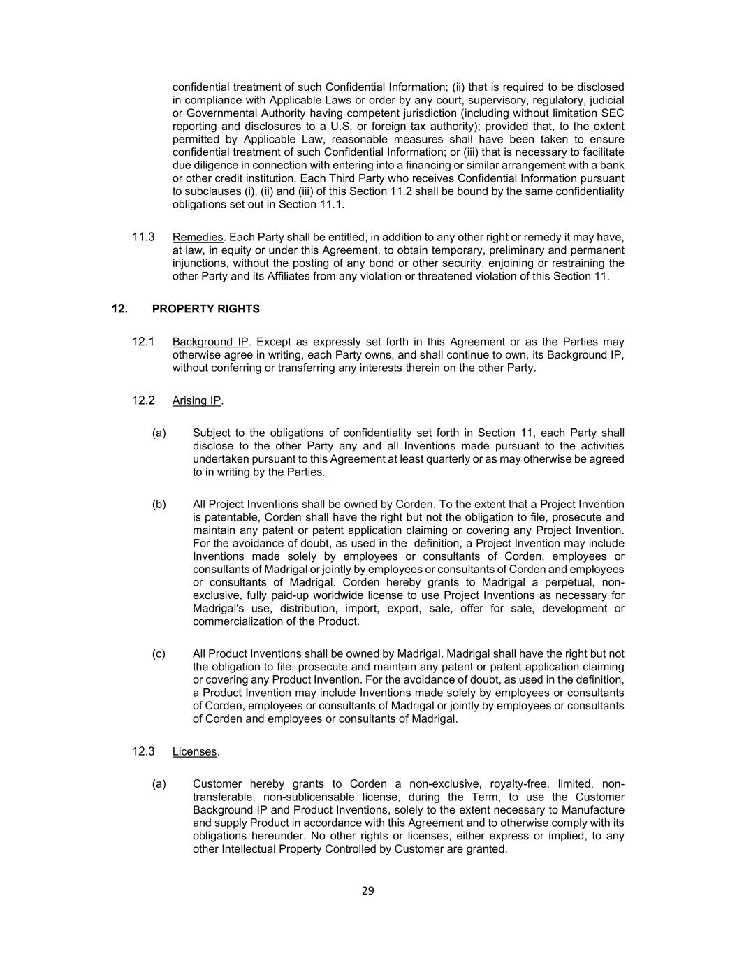 29 confidential treatment of such Confidential Information; (ii) that is required to be disclosed in compliance with Applicable Laws or order by any court, supervisory, regulatory, judicial or Governmental Authority having competent jurisdiction (including without limitation SEC reporting and disclosures to a U.S. or foreign tax authority); provided that, to the extent permitted by Applicable Law, reasonable measures shall have been taken to ensure confidential treatment of such Confidential Information; or (iii) that is necessary to facilitate due diligence in connection with entering into a financing or similar arrangement with a bank or other credit institution. Each Third Party who receives Confidential Information pursuant to subclauses (i), (ii) and (iii) of this Section 11.2 shall be bound by the same confidentiality obligations set out in Section 11.1. 11.3 Remedies. Each Party shall be entitled, in addition to any other right or remedy it may have, at law, in equity or under this Agreement, to obtain temporary, preliminary and permanent injunctions, without the posting of any bond or other security, enjoining or restraining the other Party and its Affiliates from any violation or threatened violation of this Section 11. 12. PROPERTY RIGHTS 12.1 Background IP. Except as expressly set forth in this Agreement or as the Parties may otherwise agree in writing, each Party owns, and shall continue to own, its Background IP, without conferring or transferring any interests therein on the other Party. 12.2 Arising IP. (a) Subject to the obligations of confidentiality set forth in Section 11, each Party shall disclose to the other Party any and all Inventions made pursuant to the activities undertaken pursuant to this Agreement at least quarterly or as may otherwise be agreed to in writing by the Parties. (b) All Project Inventions shall be owned by Corden. To the extent that a Project Invention is patentable, Corden shall have the right but not the obligation to file, prosecute and maintain any patent or patent application claiming or covering any Project Invention. For the avoidance of doubt, as used in the definition, a Project Invention may include Inventions made solely by employees or consultants of Corden, employees or consultants of Madrigal or jointly by employees or consultants of Corden and employees or consultants of Madrigal. Corden hereby grants to Madrigal a perpetual, non- exclusive, fully paid-up worldwide license to use Project Inventions as necessary for Madrigal's use, distribution, import, export, sale, offer for sale, development or commercialization of the Product. (c) All Product Inventions shall be owned by Madrigal. Madrigal shall have the right but not the obligation to file, prosecute and maintain any patent or patent application claiming or covering any Product Invention. For the avoidance of doubt, as used in the definition, a Product Invention may include Inventions made solely by employees or consultants of Corden, employees or consultants of Madrigal or jointly by employees or consultants of Corden and employees or consultants of Madrigal. 12.3 Licenses. (a) Customer hereby grants to Corden a non-exclusive, royalty-free, limited, non- transferable, non-sublicensable license, during the Term, to use the Customer Background IP and Product Inventions, solely to the extent necessary to Manufacture and supply Product in accordance with this Agreement and to otherwise comply with its obligations hereunder. No other rights or licenses, either express or implied, to any other Intellectual Property Controlled by Customer are granted.