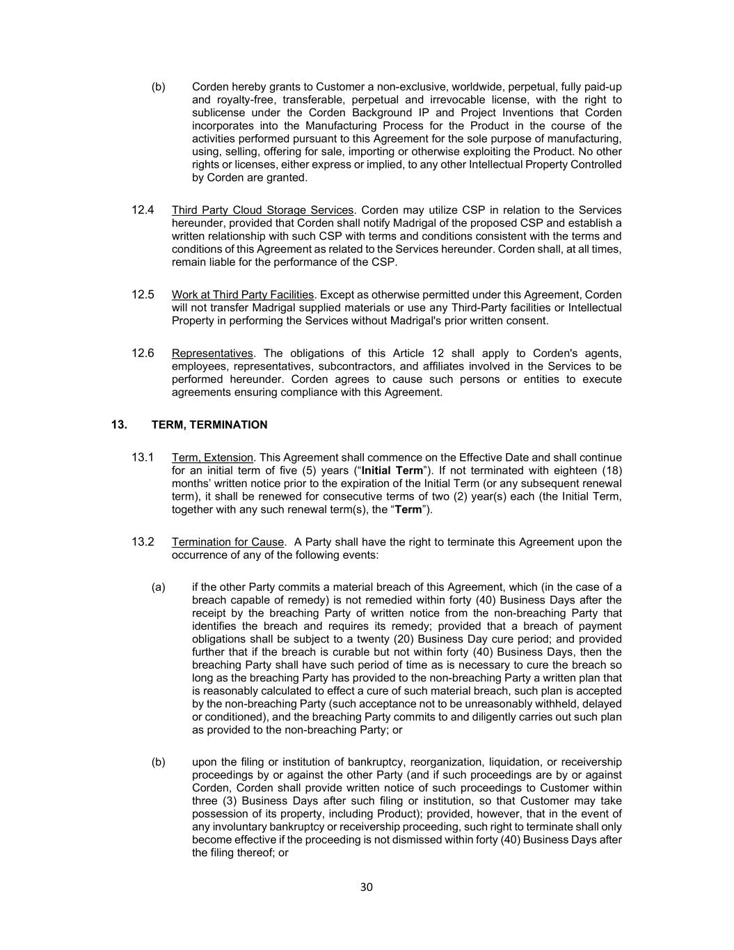 30 (b) Corden hereby grants to Customer a non-exclusive, worldwide, perpetual, fully paid-up and royalty-free, transferable, perpetual and irrevocable license, with the right to sublicense under the Corden Background IP and Project Inventions that Corden incorporates into the Manufacturing Process for the Product in the course of the activities performed pursuant to this Agreement for the sole purpose of manufacturing, using, selling, offering for sale, importing or otherwise exploiting the Product. No other rights or licenses, either express or implied, to any other Intellectual Property Controlled by Corden are granted. 12.4 Third Party Cloud Storage Services. Corden may utilize CSP in relation to the Services hereunder, provided that Corden shall notify Madrigal of the proposed CSP and establish a written relationship with such CSP with terms and conditions consistent with the terms and conditions of this Agreement as related to the Services hereunder. Corden shall, at all times, remain liable for the performance of the CSP. 12.5 Work at Third Party Facilities. Except as otherwise permitted under this Agreement, Corden will not transfer Madrigal supplied materials or use any Third-Party facilities or Intellectual Property in performing the Services without Madrigal's prior written consent. 12.6 Representatives. The obligations of this Article 12 shall apply to Corden's agents, employees, representatives, subcontractors, and affiliates involved in the Services to be performed hereunder. Corden agrees to cause such persons or entities to execute agreements ensuring compliance with this Agreement. 13. TERM, TERMINATION 13.1 Term, Extension. This Agreement shall commence on the Effective Date and shall continue for an initial term of five (5) years (“Initial Term”). If not terminated with eighteen (18) months’ written notice prior to the expiration of the Initial Term (or any subsequent renewal term), it shall be renewed for consecutive terms of two (2) year(s) each (the Initial Term, together with any such renewal term(s), the “Term”). 13.2 Termination for Cause. A Party shall have the right to terminate this Agreement upon the occurrence of any of the following events: (a) if the other Party commits a material breach of this Agreement, which (in the case of a breach capable of remedy) is not remedied within forty (40) Business Days after the receipt by the breaching Party of written notice from the non-breaching Party that identifies the breach and requires its remedy; provided that a breach of payment obligations shall be subject to a twenty (20) Business Day cure period; and provided further that if the breach is curable but not within forty (40) Business Days, then the breaching Party shall have such period of time as is necessary to cure the breach so long as the breaching Party has provided to the non-breaching Party a written plan that is reasonably calculated to effect a cure of such material breach, such plan is accepted by the non-breaching Party (such acceptance not to be unreasonably withheld, delayed or conditioned), and the breaching Party commits to and diligently carries out such plan as provided to the non-breaching Party; or (b) upon the filing or institution of bankruptcy, reorganization, liquidation, or receivership proceedings by or against the other Party (and if such proceedings are by or against Corden, Corden shall provide written notice of such proceedings to Customer within three (3) Business Days after such filing or institution, so that Customer may take possession of its property, including Product); provided, however, that in the event of any involuntary bankruptcy or receivership proceeding, such right to terminate shall only become effective if the proceeding is not dismissed within forty (40) Business Days after the filing thereof; or