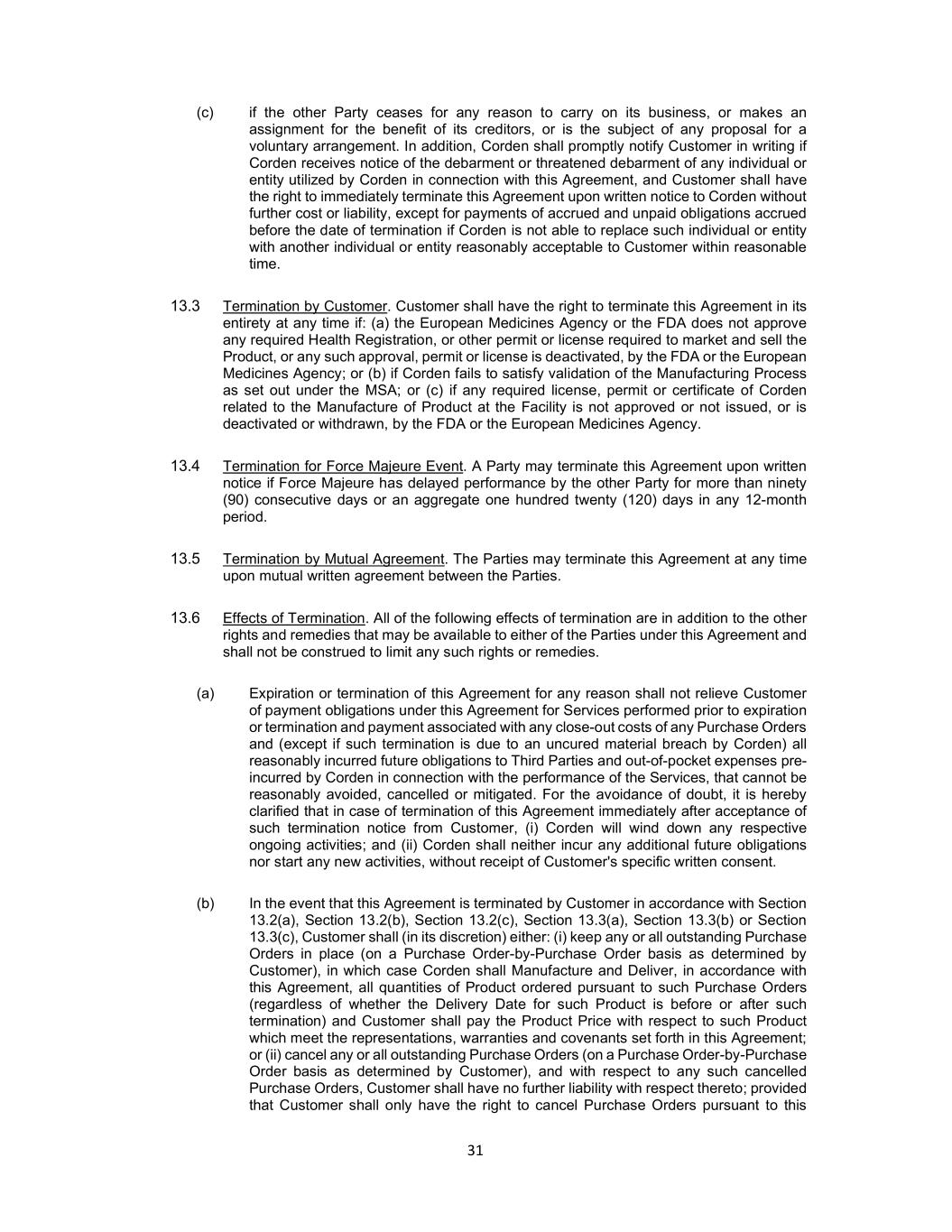 31 (c) if the other Party ceases for any reason to carry on its business, or makes an assignment for the benefit of its creditors, or is the subject of any proposal for a voluntary arrangement. In addition, Corden shall promptly notify Customer in writing if Corden receives notice of the debarment or threatened debarment of any individual or entity utilized by Corden in connection with this Agreement, and Customer shall have the right to immediately terminate this Agreement upon written notice to Corden without further cost or liability, except for payments of accrued and unpaid obligations accrued before the date of termination if Corden is not able to replace such individual or entity with another individual or entity reasonably acceptable to Customer within reasonable time. 13.3 Termination by Customer. Customer shall have the right to terminate this Agreement in its entirety at any time if: (a) the European Medicines Agency or the FDA does not approve any required Health Registration, or other permit or license required to market and sell the Product, or any such approval, permit or license is deactivated, by the FDA or the European Medicines Agency; or (b) if Corden fails to satisfy validation of the Manufacturing Process as set out under the MSA; or (c) if any required license, permit or certificate of Corden related to the Manufacture of Product at the Facility is not approved or not issued, or is deactivated or withdrawn, by the FDA or the European Medicines Agency. 13.4 Termination for Force Majeure Event. A Party may terminate this Agreement upon written notice if Force Majeure has delayed performance by the other Party for more than ninety (90) consecutive days or an aggregate one hundred twenty (120) days in any 12-month period. 13.5 Termination by Mutual Agreement. The Parties may terminate this Agreement at any time upon mutual written agreement between the Parties. 13.6 Effects of Termination. All of the following effects of termination are in addition to the other rights and remedies that may be available to either of the Parties under this Agreement and shall not be construed to limit any such rights or remedies. (a) Expiration or termination of this Agreement for any reason shall not relieve Customer of payment obligations under this Agreement for Services performed prior to expiration or termination and payment associated with any close-out costs of any Purchase Orders and (except if such termination is due to an uncured material breach by Corden) all reasonably incurred future obligations to Third Parties and out-of-pocket expenses pre- incurred by Corden in connection with the performance of the Services, that cannot be reasonably avoided, cancelled or mitigated. For the avoidance of doubt, it is hereby clarified that in case of termination of this Agreement immediately after acceptance of such termination notice from Customer, (i) Corden will wind down any respective ongoing activities; and (ii) Corden shall neither incur any additional future obligations nor start any new activities, without receipt of Customer's specific written consent. (b) In the event that this Agreement is terminated by Customer in accordance with Section 13.2(a), Section 13.2(b), Section 13.2(c), Section 13.3(a), Section 13.3(b) or Section 13.3(c), Customer shall (in its discretion) either: (i) keep any or all outstanding Purchase Orders in place (on a Purchase Order-by-Purchase Order basis as determined by Customer), in which case Corden shall Manufacture and Deliver, in accordance with this Agreement, all quantities of Product ordered pursuant to such Purchase Orders (regardless of whether the Delivery Date for such Product is before or after such termination) and Customer shall pay the Product Price with respect to such Product which meet the representations, warranties and covenants set forth in this Agreement; or (ii) cancel any or all outstanding Purchase Orders (on a Purchase Order-by-Purchase Order basis as determined by Customer), and with respect to any such cancelled Purchase Orders, Customer shall have no further liability with respect thereto; provided that Customer shall only have the right to cancel Purchase Orders pursuant to this