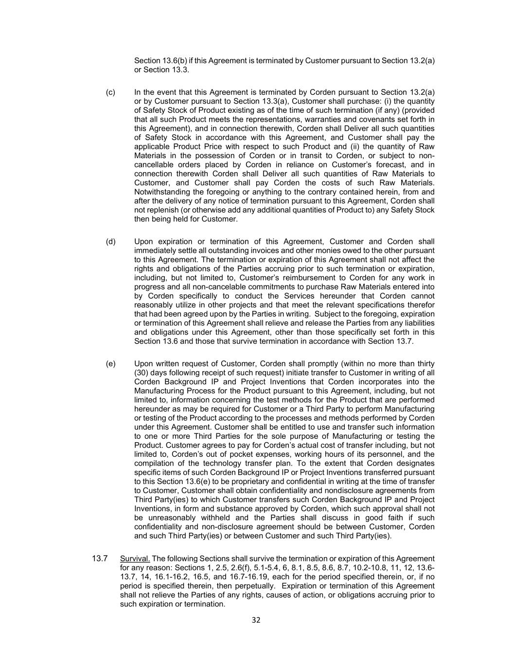 32 Section 13.6(b) if this Agreement is terminated by Customer pursuant to Section 13.2(a) or Section 13.3. (c) In the event that this Agreement is terminated by Corden pursuant to Section 13.2(a) or by Customer pursuant to Section 13.3(a), Customer shall purchase: (i) the quantity of Safety Stock of Product existing as of the time of such termination (if any) (provided that all such Product meets the representations, warranties and covenants set forth in this Agreement), and in connection therewith, Corden shall Deliver all such quantities of Safety Stock in accordance with this Agreement, and Customer shall pay the applicable Product Price with respect to such Product and (ii) the quantity of Raw Materials in the possession of Corden or in transit to Corden, or subject to non- cancellable orders placed by Corden in reliance on Customer’s forecast, and in connection therewith Corden shall Deliver all such quantities of Raw Materials to Customer, and Customer shall pay Corden the costs of such Raw Materials. Notwithstanding the foregoing or anything to the contrary contained herein, from and after the delivery of any notice of termination pursuant to this Agreement, Corden shall not replenish (or otherwise add any additional quantities of Product to) any Safety Stock then being held for Customer. (d) Upon expiration or termination of this Agreement, Customer and Corden shall immediately settle all outstanding invoices and other monies owed to the other pursuant to this Agreement. The termination or expiration of this Agreement shall not affect the rights and obligations of the Parties accruing prior to such termination or expiration, including, but not limited to, Customer’s reimbursement to Corden for any work in progress and all non-cancelable commitments to purchase Raw Materials entered into by Corden specifically to conduct the Services hereunder that Corden cannot reasonably utilize in other projects and that meet the relevant specifications therefor that had been agreed upon by the Parties in writing. Subject to the foregoing, expiration or termination of this Agreement shall relieve and release the Parties from any liabilities and obligations under this Agreement, other than those specifically set forth in this Section 13.6 and those that survive termination in accordance with Section 13.7. (e) Upon written request of Customer, Corden shall promptly (within no more than thirty (30) days following receipt of such request) initiate transfer to Customer in writing of all Corden Background IP and Project Inventions that Corden incorporates into the Manufacturing Process for the Product pursuant to this Agreement, including, but not limited to, information concerning the test methods for the Product that are performed hereunder as may be required for Customer or a Third Party to perform Manufacturing or testing of the Product according to the processes and methods performed by Corden under this Agreement. Customer shall be entitled to use and transfer such information to one or more Third Parties for the sole purpose of Manufacturing or testing the Product. Customer agrees to pay for Corden’s actual cost of transfer including, but not limited to, Corden’s out of pocket expenses, working hours of its personnel, and the compilation of the technology transfer plan. To the extent that Corden designates specific items of such Corden Background IP or Project Inventions transferred pursuant to this Section 13.6(e) to be proprietary and confidential in writing at the time of transfer to Customer, Customer shall obtain confidentiality and nondisclosure agreements from Third Party(ies) to which Customer transfers such Corden Background IP and Project Inventions, in form and substance approved by Corden, which such approval shall not be unreasonably withheld and the Parties shall discuss in good faith if such confidentiality and non-disclosure agreement should be between Customer, Corden and such Third Party(ies) or between Customer and such Third Party(ies). 13.7 Survival. The following Sections shall survive the termination or expiration of this Agreement for any reason: Sections 1, 2.5, 2.6(f), 5.1-5.4, 6, 8.1, 8.5, 8.6, 8.7, 10.2-10.8, 11, 12, 13.6- 13.7, 14, 16.1-16.2, 16.5, and 16.7-16.19, each for the period specified therein, or, if no period is specified therein, then perpetually. Expiration or termination of this Agreement shall not relieve the Parties of any rights, causes of action, or obligations accruing prior to such expiration or termination.