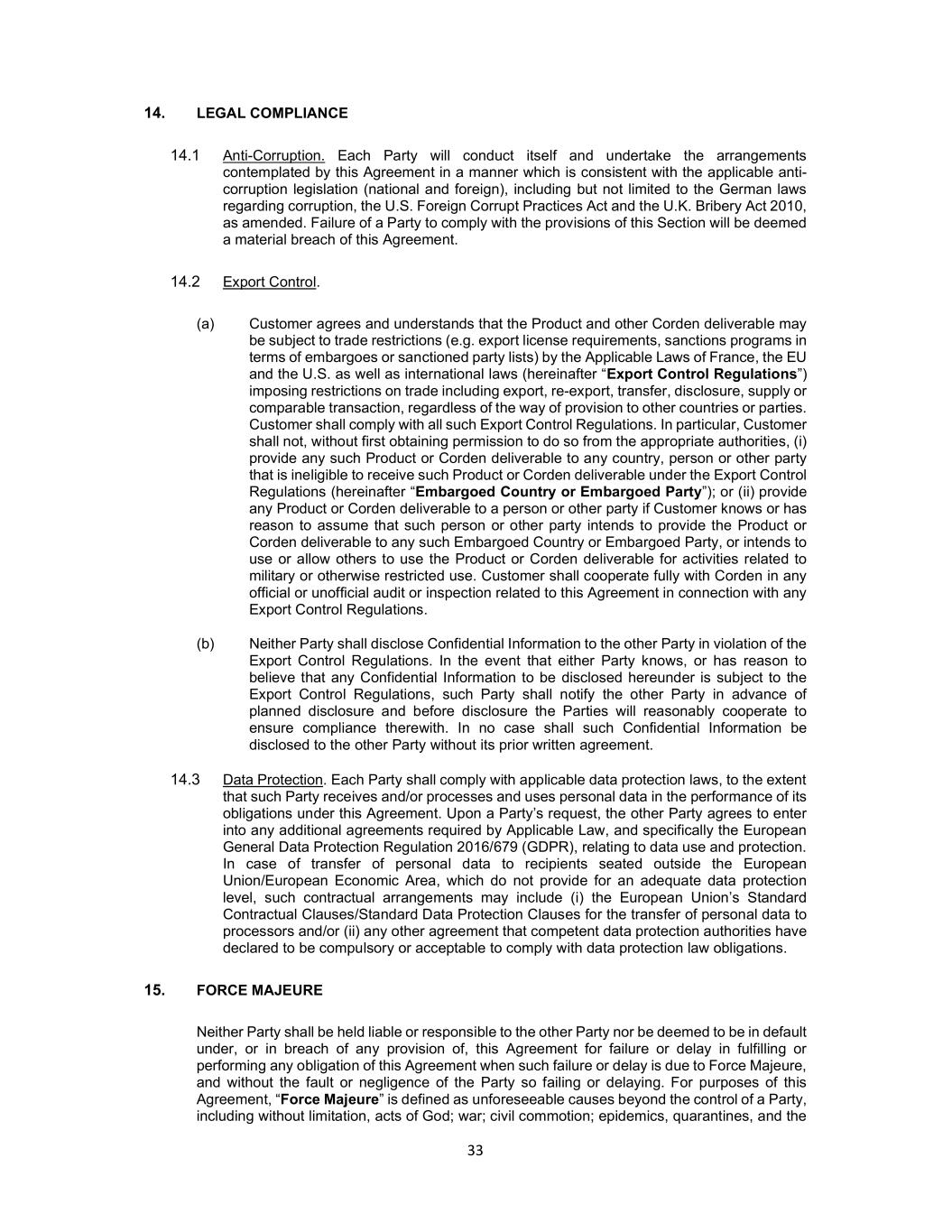 33 14. LEGAL COMPLIANCE 14.1 Anti-Corruption. Each Party will conduct itself and undertake the arrangements contemplated by this Agreement in a manner which is consistent with the applicable anti- corruption legislation (national and foreign), including but not limited to the German laws regarding corruption, the U.S. Foreign Corrupt Practices Act and the U.K. Bribery Act 2010, as amended. Failure of a Party to comply with the provisions of this Section will be deemed a material breach of this Agreement. 14.2 Export Control. (a) Customer agrees and understands that the Product and other Corden deliverable may be subject to trade restrictions (e.g. export license requirements, sanctions programs in terms of embargoes or sanctioned party lists) by the Applicable Laws of France, the EU and the U.S. as well as international laws (hereinafter “Export Control Regulations”) imposing restrictions on trade including export, re-export, transfer, disclosure, supply or comparable transaction, regardless of the way of provision to other countries or parties. Customer shall comply with all such Export Control Regulations. In particular, Customer shall not, without first obtaining permission to do so from the appropriate authorities, (i) provide any such Product or Corden deliverable to any country, person or other party that is ineligible to receive such Product or Corden deliverable under the Export Control Regulations (hereinafter “Embargoed Country or Embargoed Party”); or (ii) provide any Product or Corden deliverable to a person or other party if Customer knows or has reason to assume that such person or other party intends to provide the Product or Corden deliverable to any such Embargoed Country or Embargoed Party, or intends to use or allow others to use the Product or Corden deliverable for activities related to military or otherwise restricted use. Customer shall cooperate fully with Corden in any official or unofficial audit or inspection related to this Agreement in connection with any Export Control Regulations. (b) Neither Party shall disclose Confidential Information to the other Party in violation of the Export Control Regulations. In the event that either Party knows, or has reason to believe that any Confidential Information to be disclosed hereunder is subject to the Export Control Regulations, such Party shall notify the other Party in advance of planned disclosure and before disclosure the Parties will reasonably cooperate to ensure compliance therewith. In no case shall such Confidential Information be disclosed to the other Party without its prior written agreement. 14.3 Data Protection. Each Party shall comply with applicable data protection laws, to the extent that such Party receives and/or processes and uses personal data in the performance of its obligations under this Agreement. Upon a Party’s request, the other Party agrees to enter into any additional agreements required by Applicable Law, and specifically the European General Data Protection Regulation 2016/679 (GDPR), relating to data use and protection. In case of transfer of personal data to recipients seated outside the European Union/European Economic Area, which do not provide for an adequate data protection level, such contractual arrangements may include (i) the European Union’s Standard Contractual Clauses/Standard Data Protection Clauses for the transfer of personal data to processors and/or (ii) any other agreement that competent data protection authorities have declared to be compulsory or acceptable to comply with data protection law obligations. 15. FORCE MAJEURE Neither Party shall be held liable or responsible to the other Party nor be deemed to be in default under, or in breach of any provision of, this Agreement for failure or delay in fulfilling or performing any obligation of this Agreement when such failure or delay is due to Force Majeure, and without the fault or negligence of the Party so failing or delaying. For purposes of this Agreement, “Force Majeure” is defined as unforeseeable causes beyond the control of a Party, including without limitation, acts of God; war; civil commotion; epidemics, quarantines, and the