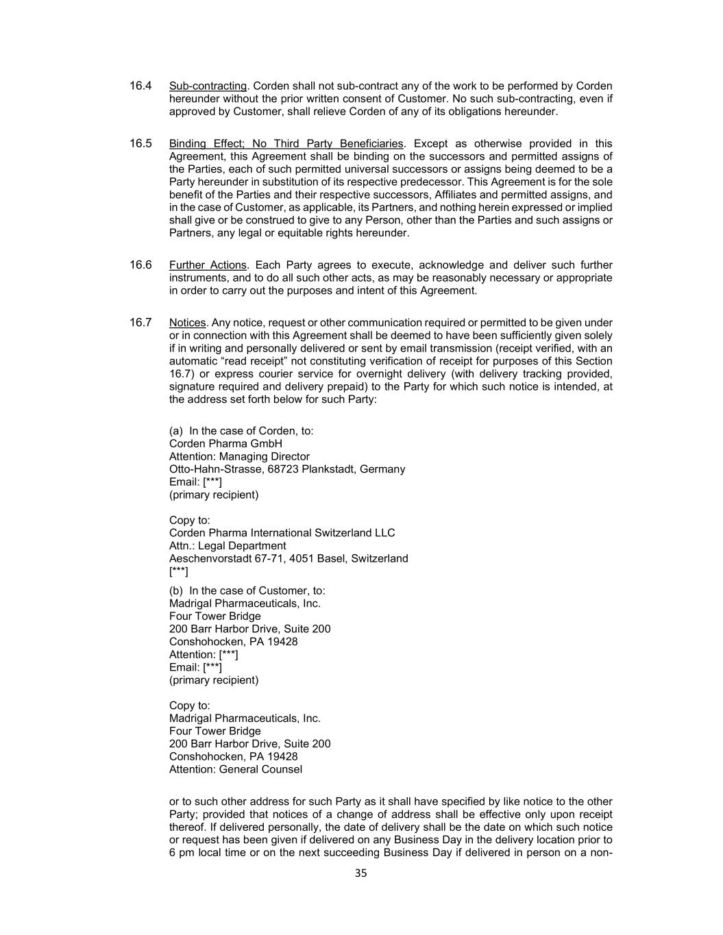35 16.4 Sub-contracting. Corden shall not sub-contract any of the work to be performed by Corden hereunder without the prior written consent of Customer. No such sub-contracting, even if approved by Customer, shall relieve Corden of any of its obligations hereunder. 16.5 Binding Effect; No Third Party Beneficiaries. Except as otherwise provided in this Agreement, this Agreement shall be binding on the successors and permitted assigns of the Parties, each of such permitted universal successors or assigns being deemed to be a Party hereunder in substitution of its respective predecessor. This Agreement is for the sole benefit of the Parties and their respective successors, Affiliates and permitted assigns, and in the case of Customer, as applicable, its Partners, and nothing herein expressed or implied shall give or be construed to give to any Person, other than the Parties and such assigns or Partners, any legal or equitable rights hereunder. 16.6 Further Actions. Each Party agrees to execute, acknowledge and deliver such further instruments, and to do all such other acts, as may be reasonably necessary or appropriate in order to carry out the purposes and intent of this Agreement. 16.7 Notices. Any notice, request or other communication required or permitted to be given under or in connection with this Agreement shall be deemed to have been sufficiently given solely if in writing and personally delivered or sent by email transmission (receipt verified, with an automatic “read receipt” not constituting verification of receipt for purposes of this Section 16.7) or express courier service for overnight delivery (with delivery tracking provided, signature required and delivery prepaid) to the Party for which such notice is intended, at the address set forth below for such Party: (a) In the case of Corden, to: Corden Pharma GmbH Attention: Managing Director Otto-Hahn-Strasse, 68723 Plankstadt, Germany Email: [***] (primary recipient) Copy to: Corden Pharma International Switzerland LLC Attn.: Legal Department Aeschenvorstadt 67-71, 4051 Basel, Switzerland [***] (b) In the case of Customer, to: Madrigal Pharmaceuticals, Inc. Four Tower Bridge 200 Barr Harbor Drive, Suite 200 Conshohocken, PA 19428 Attention: [***] Email: [***] (primary recipient) Copy to: Madrigal Pharmaceuticals, Inc. Four Tower Bridge 200 Barr Harbor Drive, Suite 200 Conshohocken, PA 19428 Attention: General Counsel or to such other address for such Party as it shall have specified by like notice to the other Party; provided that notices of a change of address shall be effective only upon receipt thereof. If delivered personally, the date of delivery shall be the date on which such notice or request has been given if delivered on any Business Day in the delivery location prior to 6 pm local time or on the next succeeding Business Day if delivered in person on a non-