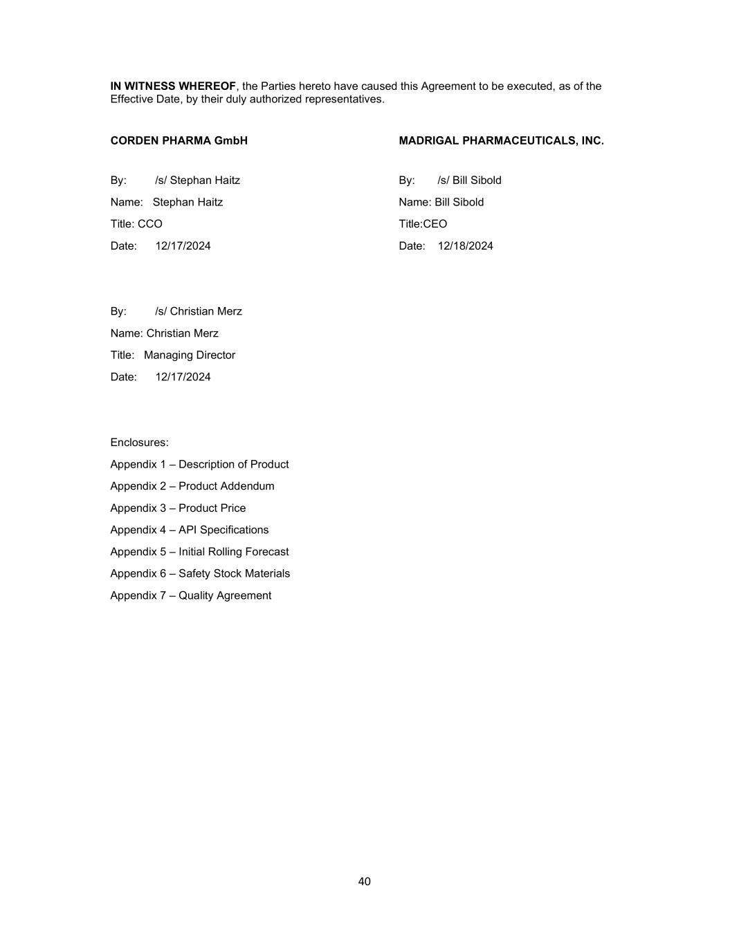 40 IN WITNESS WHEREOF, the Parties hereto have caused this Agreement to be executed, as of the Effective Date, by their duly authorized representatives. CORDEN PHARMA GmbH MADRIGAL PHARMACEUTICALS, INC. By: /s/ Stephan Haitz By: /s/ Bill Sibold Name: Stephan Haitz Name: Bill Sibold Title: CCO Date: 12/17/2024 Title:CEO Date: 12/18/2024 By: /s/ Christian Merz Name: Christian Merz Title: Managing Director Date: 12/17/2024 Enclosures: Appendix 1 – Description of Product Appendix 2 – Product Addendum Appendix 3 – Product Price Appendix 4 – API Specifications Appendix 5 – Initial Rolling Forecast Appendix 6 – Safety Stock Materials Appendix 7 – Quality Agreement