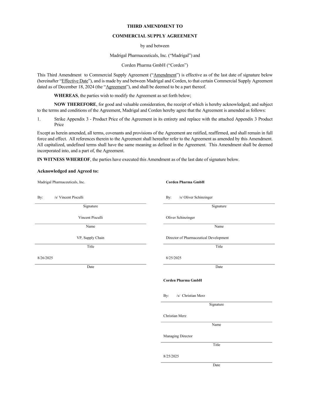 THIRD AMENDMENT TO COMMERCIAL SUPPLY AGREEMENT by and between Madrigal Pharmaceuticals, Inc. (“Madrigal”) and Corden Pharma GmbH (“Corden”) This Third Amendment to Commercial Supply Agreement (“Amendment”) is effective as of the last date of signature below (hereinafter “Effective Date”), and is made by and between Madrigal and Corden, to that certain Commercial Supply Agreement dated as of December 18, 2024 (the “Agreement”), and shall be deemed to be a part thereof. WHEREAS, the parties wish to modify the Agreement as set forth below; NOW THEREFORE, for good and valuable consideration, the receipt of which is hereby acknowledged; and subject to the terms and conditions of the Agreement, Madrigal and Corden hereby agree that the Agreement is amended as follows: 1. Strike Appendix 3 - Product Price of the Agreement in its entirety and replace with the attached Appendix 3 Product Price Except as herein amended, all terms, covenants and provisions of the Agreement are ratified, reaffirmed, and shall remain in full force and effect. All references therein to the Agreement shall hereafter refer to the Agreement as amended by this Amendment. All capitalized, undefined terms shall have the same meaning as defined in the Agreement. This Amendment shall be deemed incorporated into, and a part of, the Agreement. IN WITNESS WHEREOF, the parties have executed this Amendment as of the last date of signature below. Acknowledged and Agreed to: Madrigal Pharmaceuticals, Inc. Corden Pharma GmbH By: /s/ Vincent Pisculli By: /s/ Oliver Schinzinger Signature Signature Vincent Pisculli Oliver Schinzinger Name Name VP, Supply Chain Director of Pharmaceutical Development Title Title 8/26/2025 8/25/2025 Date Date Corden Pharma GmbH By: /s/ Christian Merz Signature Christian Merz Name Managing Director Title 8/25/2025 Date