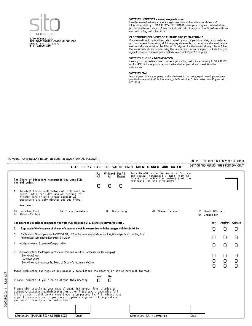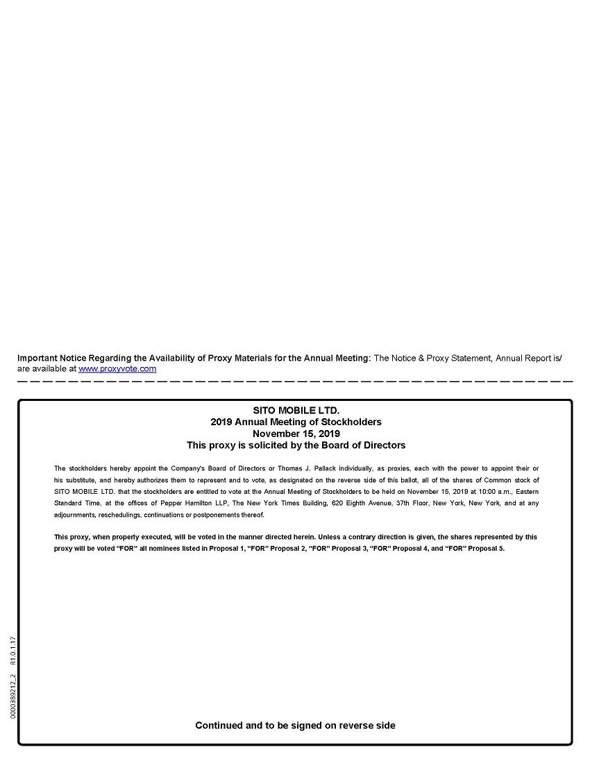 We cordially invite you to attend the Annual Meeting of Stockholders of SITO Mobile, Ltd. to be held on November 15, 2019 at 10:00 a.m., Eastern Standard Time, at the offices of Pepper Hamilton LLP, The New York Times Building, 620 Eighth Avenue, 37th Floor, New York, New York.