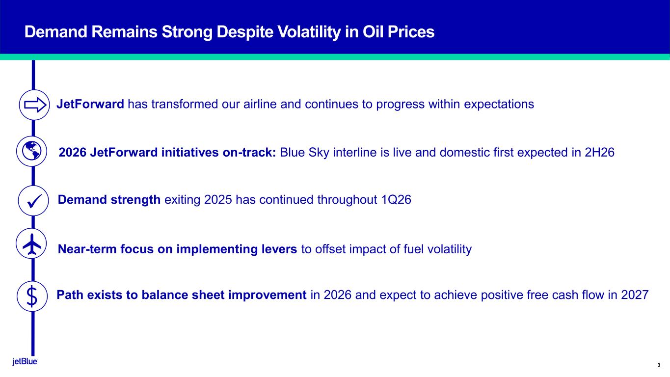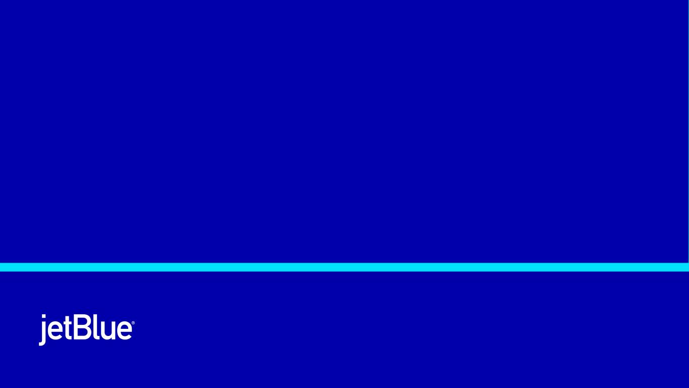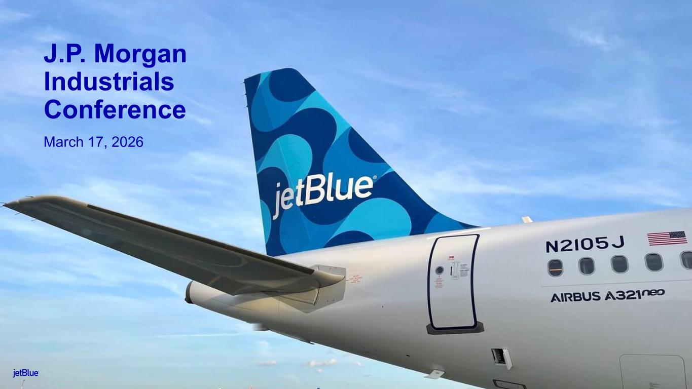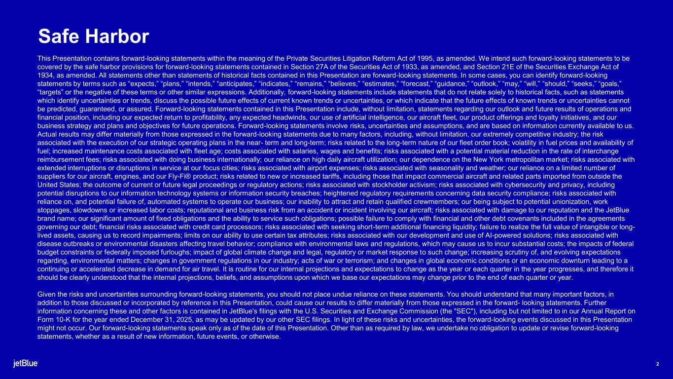 The JetBlue Way Forward | Our Strategic Evolution | Returning to Historical Earnings Power Safe Harbor This Presentation contains forward-looking statements within the meaning of the Private Securities Litigation Reform Act of 1995, as amended. We intend such forward-looking statements to be covered by the safe harbor provisions for forward-looking statements contained in Section 27A of the Securities Act of 1933, as amended, and Section 21E of the Securities Exchange Act of 1934, as amended. All statements other than statements of historical facts contained in this Presentation are forward-looking statements. In some cases, you can identify forward-looking statements by terms such as “expects,” “plans,” “intends,” “anticipates,” “indicates,” “remains,” “believes,” “estimates,” “forecast,” “guidance,” “outlook,” “may,” “will,” “should,” “seeks,” “goals,” “targets” or the negative of these terms or other similar expressions. Additionally, forward-looking statements include statements that do not relate solely to historical facts, such as statements which identify uncertainties or trends, discuss the possible future effects of current known trends or uncertainties, or which indicate that the future effects of known trends or uncertainties cannot be predicted, guaranteed, or assured. Forward-looking statements contained in this Presentation include, without limitation, statements regarding our outlook and future results of operations and financial position, including our expected return to profitability, any expected headwinds, our use of artificial intelligence, our aircraft fleet, our product offerings and loyalty initiatives, and our business strategy and plans and objectives for future operations. Forward-looking statements involve risks, uncertainties and assumptions, and are based on information currently available to us. Actual results may differ materially from those expressed in the forward-looking statements due to many factors, including, without limitation, our extremely competitive industry; the risk associated with the execution of our strategic operating plans in the near- term and long-term; risks related to the long-term nature of our fleet order book; volatility in fuel prices and availability of fuel; increased maintenance costs associated with fleet age; costs associated with salaries, wages and benefits; risks associated with a potential material reduction in the rate of interchange reimbursement fees; risks associated with doing business internationally; our reliance on high daily aircraft utilization; our dependence on the New York metropolitan market; risks associated with extended interruptions or disruptions in service at our focus cities; risks associated with airport expenses; risks associated with seasonality and weather; our reliance on a limited number of suppliers for our aircraft, engines, and our Fly-Fi® product; risks related to new or increased tariffs, including those that impact commercial aircraft and related parts imported from outside the United States; the outcome of current or future legal proceedings or regulatory actions; risks associated with stockholder activism; risks associated with cybersecurity and privacy, including potential disruptions to our information technology systems or information security breaches; heightened regulatory requirements concerning data security compliance; risks associated with reliance on, and potential failure of, automated systems to operate our business; our inability to attract and retain qualified crewmembers; our being subject to potential unionization, work stoppages, slowdowns or increased labor costs; reputational and business risk from an accident or incident involving our aircraft; risks associated with damage to our reputation and the JetBlue brand name; our significant amount of fixed obligations and the ability to service such obligations; possible failure to comply with financial and other debt covenants included in the agreements governing our debt; financial risks associated with credit card processors; risks associated with seeking short-term additional financing liquidity; failure to realize the full value of intangible or long- lived assets, causing us to record impairments; limits on our ability to use certain tax attributes; risks associated with our development and use of AI-powered solutions; risks associated with disease outbreaks or environmental disasters affecting travel behavior; compliance with environmental laws and regulations, which may cause us to incur substantial costs; the impacts of federal budget constraints or federally imposed furloughs; impact of global climate change and legal, regulatory or market response to such change; increasing scrutiny of, and evolving expectations regarding, environmental matters; changes in government regulations in our industry; acts of war or terrorism; and changes in global economic conditions or an economic downturn leading to a continuing or accelerated decrease in demand for air travel. It is routine for our internal projections and expectations to change as the year or each quarter in the year progresses, and therefore it should be clearly understood that the internal projections, beliefs, and assumptions upon which we base our expectations may change prior to the end of each quarter or year. Given the risks and uncertainties surrounding forward-looking statements, you should not place undue reliance on these statements. You should understand that many important factors, in addition to those discussed or incorporated by reference in this Presentation, could cause our results to differ materially from those expressed in the forward- looking statements. Further information concerning these and other factors is contained in JetBlue's filings with the U.S. Securities and Exchange Commission (the "SEC"), including but not limited to in our Annual Report on Form 10-K for the year