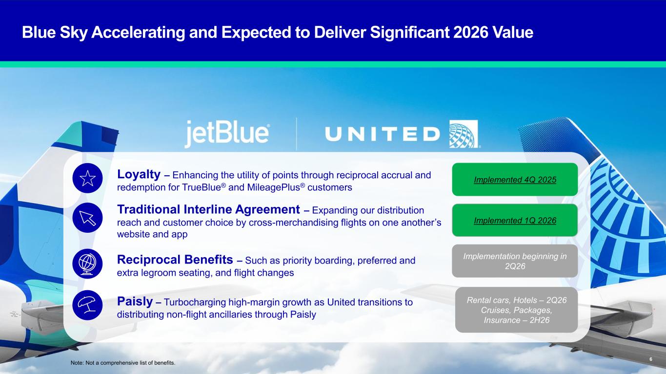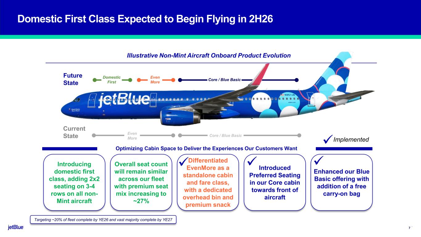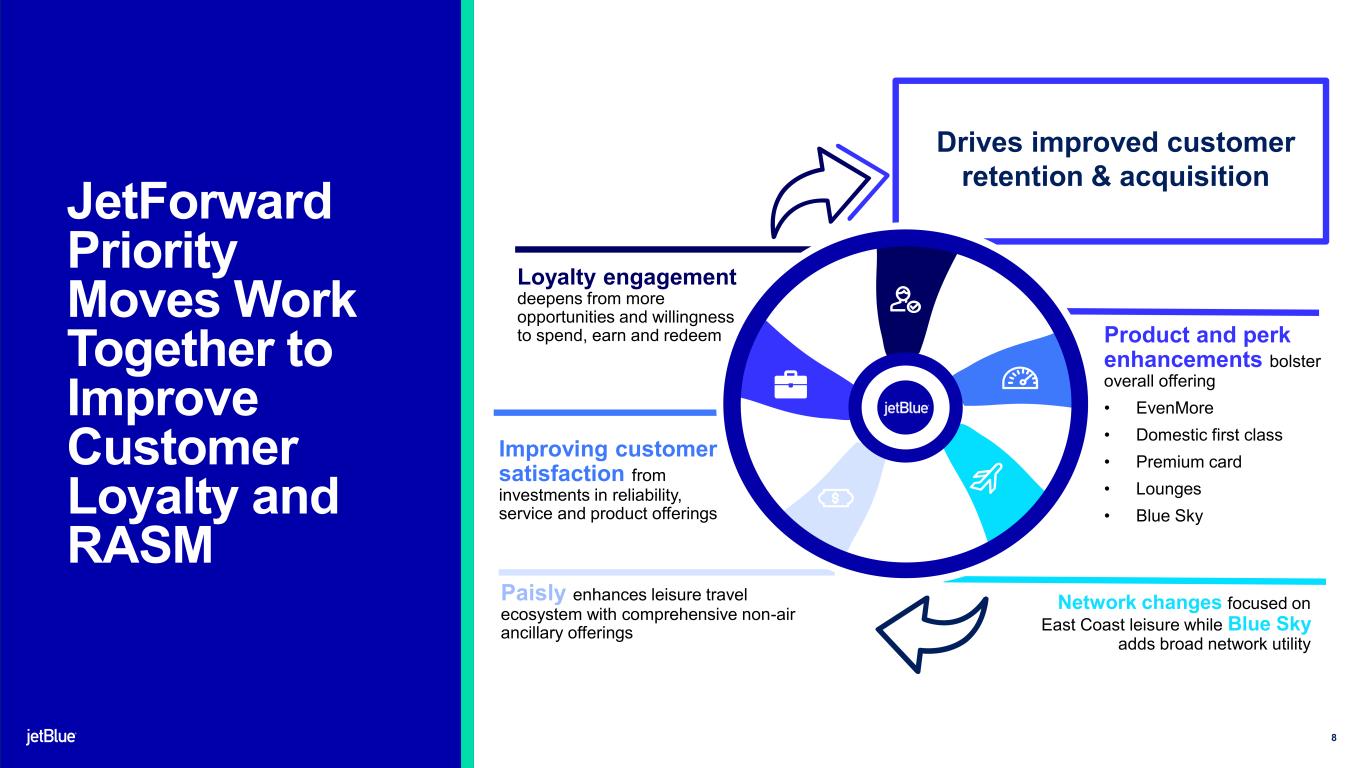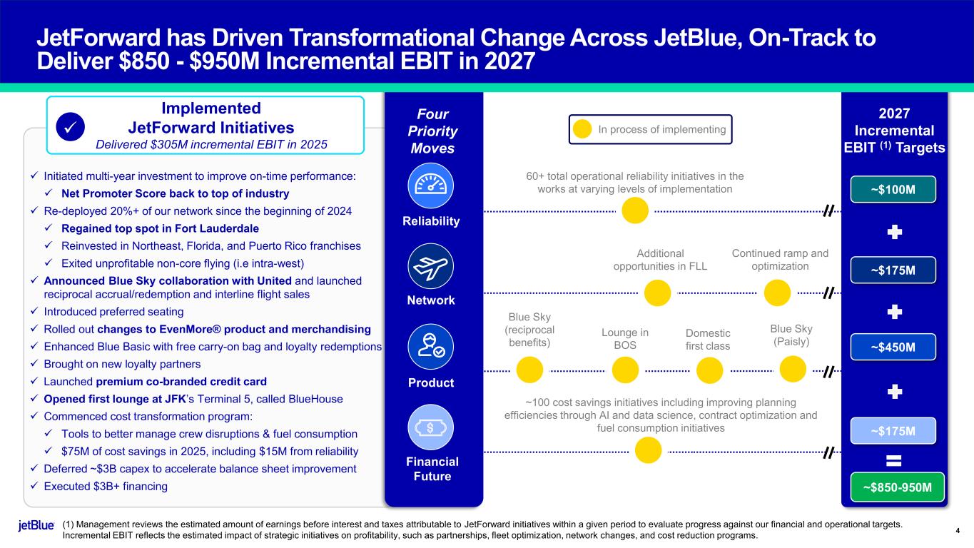 The JetBlue Way Forward | Our Strategic Evolution | Returning to Historical Earnings Power Safe Harbor This Presentation contains forward-looking statements within the meaning of the Private Securities Litigation Reform Act of 1995, as amended. We intend such forward-looking statements to be covered by the safe harbor provisions for forward-looking statements contained in Section 27A of the Securities Act of 1933, as amended, and Section 21E of the Securities Exchange Act of 1934, as amended. All statements other than statements of historical facts contained in this Presentation are forward-looking statements. In some cases, you can identify forward-looking statements by terms such as “expects,” “plans,” “intends,” “anticipates,” “indicates,” “remains,” “believes,” “estimates,” “forecast,” “guidance,” “outlook,” “may,” “will,” “should,” “seeks,” “goals,” “targets” or the negative of these terms or other similar expressions. Additionally, forward-looking statements include statements that do not relate solely to historical facts, such as statements which identify uncertainties or trends, discuss the possible future effects of current known trends or uncertainties, or which indicate that the future effects of known trends or uncertainties cannot be predicted, guaranteed, or assured. Forward-looking statements contained in this Presentation include, without limitation, statements regarding our outlook and future results of operations and financial position, including our expected return to profitability, any expected headwinds, our use of artificial intelligence, our aircraft fleet, our product offerings and loyalty initiatives, and our business strategy and plans and objectives for future operations. Forward-looking statements involve risks, uncertainties and assumptions, and are based on information currently available to us. Actual results may differ materially from those expressed in the forward-looking statements due to many factors, including, without limitation, our extremely competitive industry; the risk associated with the execution of our strategic operating plans in the near- term and long-term; risks related to the long-term nature of our fleet order book; volatility in fuel prices and availability of fuel; increased maintenance costs associated with fleet age; costs associated with salaries, wages and benefits; risks associated with a potential material reduction in the rate of interchange reimbursement fees; risks associated with doing business internationally; our reliance on high daily aircraft utilization; our dependence on the New York metropolitan market; risks associated with extended interruptions or disruptions in service at our focus cities; risks associated with airport expenses; risks associated with seasonality and weather; our reliance on a limited number of suppliers for our aircraft, engines, and our Fly-Fi® product; risks related to new or increased tariffs, including those that impact commercial aircraft and related parts imported from outside the United States; the outcome of current or future legal proceedings or regulatory actions; risks associated with stockholder activism; risks associated with cybersecurity and privacy, including potential disruptions to our information technology systems or information security breaches; heightened regulatory requirements concerning data security compliance; risks associated with reliance on, and potential failure of, automated systems to operate our business; our inability to attract and retain qualified crewmembers; our being subject to potential unionization, work stoppages, slowdowns or increased labor costs; reputational and business risk from an accident or incident involving our aircraft; risks associated with damage to our reputation and the JetBlue brand name; our significant amount of fixed obligations and the ability to service such obligations; possible failure to comply with financial and other debt covenants included in the agreements governing our debt; financial risks associated with credit card processors; risks associated with seeking short-term additional financing liquidity; failure to realize the full value of intangible or long- lived assets, causing us to record impairments; limits on our ability to use certain tax attributes; risks associated with our development and use of AI-powered solutions; risks associated with disease outbreaks or environmental disasters affecting travel behavior; compliance with environmental laws and regulations, which may cause us to incur substantial costs; the impacts of federal budget constraints or federally imposed furloughs; impact of global climate change and legal, regulatory or market response to such change; increasing scrutiny of, and evolving expectations regarding, environmental matters; changes in government regulations in our industry; acts of war or terrorism; and changes in global economic conditions or an economic downturn leading to a continuing or accelerated decrease in demand for air travel. It is routine for our internal projections and expectations to change as the year or each quarter in the year progresses, and therefore it should be clearly understood that the internal projections, beliefs, and assumptions upon which we base our expectations may change prior to the end of each quarter or year. Given the risks and uncertainties surrounding forward-looking statements, you should not place undue reliance on these statements. You should understand that many important factors, in addition to those discussed or incorporated by reference in this Presentation, could cause our results to differ materially from those expressed in the forward- looking statements. Further information concerning these and other factors is contained in JetBlue's filings with the U.S. Securities and Exchange Commission (the "SEC"), including but not limited to in our Annual Report on Form 10-K for the year