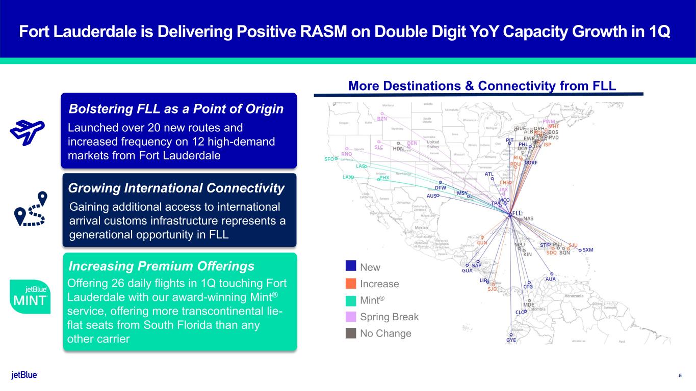 JetForward has Driven Transformational Change Across JetBlue, On-Track to Deliver $850 - $950M Incremental EBIT in 2027 Product Reliability Financial Future Four Priority Moves ~$175M ~$450M ~$100M 2027 Incremental EBIT (1) Targets Network ~$175M ~$850-950M ✓ Initiated multi-year investment to improve on-time performance: ✓ Net Promoter Score back to top of industry ✓ Re-deployed 20%+ of our network since the beginning of 2024 ✓ Regained top spot in Fort Lauderdale ✓ Reinvested in Northeast, Florida, and Puerto Rico franchises ✓ Exited unprofitable non-core flying (i.e intra-west) ✓ Announced Blue Sky collaboration with United and launched reciprocal accrual/redemption and interline flight sales ✓ Introduced preferred seating ✓ Rolled out changes to EvenMore® product and merchandising ✓ Enhanced Blue Basic with free carry-on bag and loyalty redemptions ✓ Brought on new loyalty partners ✓ Launched premium co-branded credit card ✓ Opened first lounge at JFK’s Terminal 5, called BlueHouse ✓ Commenced cost transformation program: ✓ Tools to better manage crew disruptions & fuel consumption ✓ $75M of cost savings in 2025, including $15M from reliability ✓ Deferred ~$3B capex to accelerate balance sheet improvement ✓ Executed $3B+ financing In process of implementing 60+ total operational reliability initiatives in the works at varying levels of implementation Lounge in BOS Domestic first class ~100 cost savings initiatives including improving planning efficiencies through AI and data science, contract optimization and fuel consumption initiatives Additional opportunities in FLL Implemented JetForward Initiatives Delivered $305M incremental EBIT in 2025 ✓ (1) Management reviews the estimated amount of earnings before interest and taxes attributable to JetForward initiatives within a given period to evaluate progress against our financial and operational targets. Incremental EBIT reflects the estimated impact of strategic initiatives on profitability, such as partnerships, fleet optimization, network changes, and cost reduction programs. Blue Sky (reciprocal benefits) Continued ramp and optimization Blue Sky (Paisly) 4
