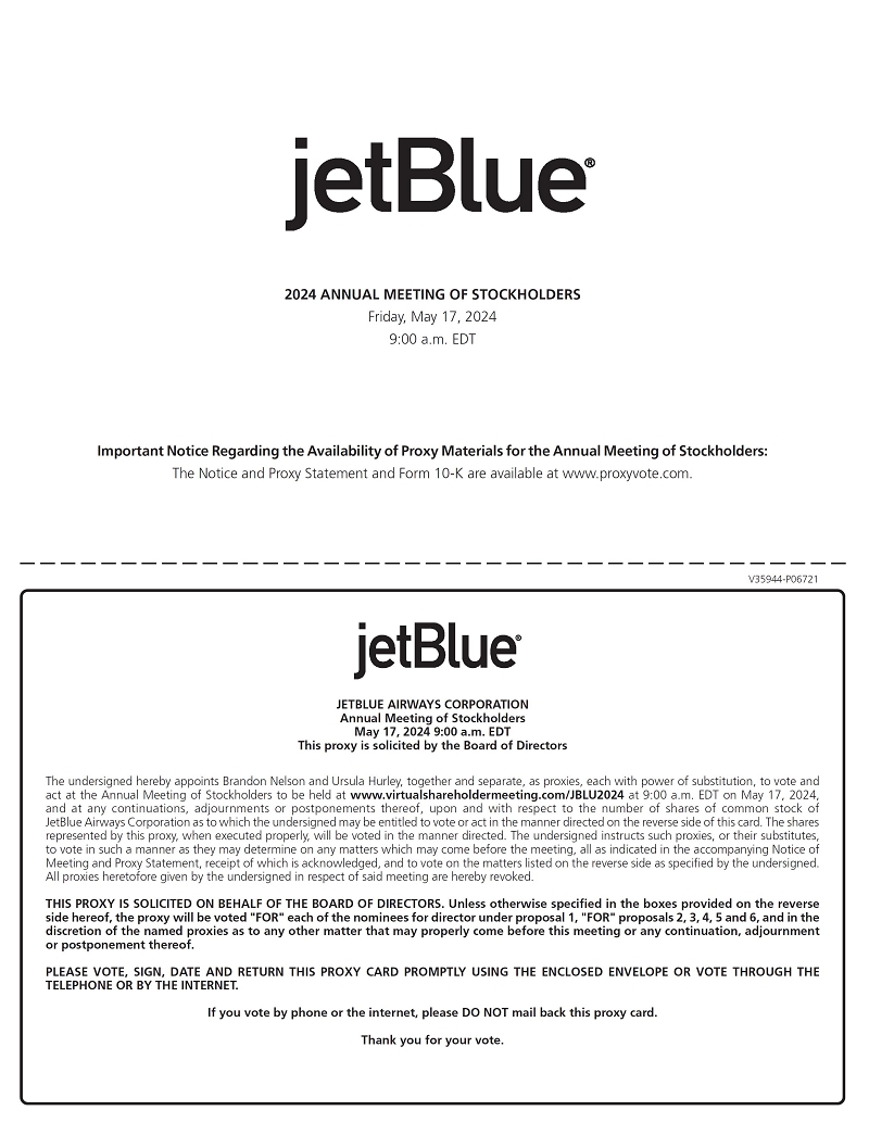 This notice of annual meeting, proxy statement and form of proxy for JetBlue Airways Corporation (“JetBlue” or the “Company”) are being distributed and made available on or about April 1, 2024.