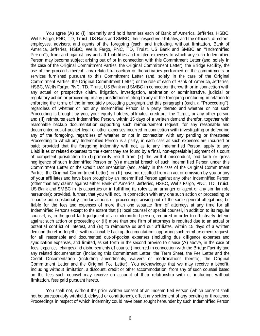 6 You agree (A) to (i) indemnify and hold harmless each of Bank of America, Jefferies, HSBC, Wells Fargo, PNC, TD, Truist, US Bank and SMBC, their respective affiliates, and the officers, directors, employees, advisors, and agents of the foregoing (each, and including, without limitation, Bank of America, Jefferies, HSBC, Wells Fargo, PNC, TD, Truist, US Bank and SMBC an “Indemnified Person”), from and against any and all Liabilities and related expenses to which any such Indemnified Person may become subject arising out of or in connection with this Commitment Letter (and, solely in the case of the Original Commitment Parties, the Original Commitment Letter), the Bridge Facility, the use of the proceeds thereof, any related transaction or the activities performed or the commitments or services furnished pursuant to this Commitment Letter (and, solely in the case of the Original Commitment Parties, the Original Commitment Letter) or the role of each of Bank of America, Jefferies, HSBC, Wells Fargo, PNC, TD, Truist, US Bank and SMBC in connection therewith or in connection with any actual or prospective claim, litigation, investigation, arbitration or administrative, judicial or regulatory action or proceeding in any jurisdiction relating to any of the foregoing (including in relation to enforcing the terms of the immediately preceding paragraph and this paragraph) (each, a “Proceeding”), regardless of whether or not any Indemnified Person is a party thereto and whether or not such Proceeding is brought by you, your equity holders, affiliates, creditors, the Target, or any other person and (ii) reimburse each Indemnified Person, within 15 days of a written demand therefor, together with reasonable backup documentation supporting such reimbursement request, for any reasonable and documented out-of-pocket legal or other expenses incurred in connection with investigating or defending any of the foregoing, regardless of whether or not in connection with any pending or threatened Proceeding to which any Indemnified Person is a party, in each case as such expenses are incurred or paid; provided that the foregoing indemnity will not, as to any Indemnified Person, apply to any Liabilities or related expenses to the extent they are found by a final, non-appealable judgment of a court of competent jurisdiction to (I) primarily result from (x) the willful misconduct, bad faith or gross negligence of such Indemnified Person or (y) a material breach of such Indemnified Person under this Commitment Letter or the Credit Documentation (and, solely in the case of the Original Commitment Parties, the Original Commitment Letter), or (II) have not resulted from an act or omission by you or any of your affiliates and have been brought by an Indemnified Person against any other Indemnified Person (other than any claims against either Bank of America, Jefferies, HSBC, Wells Fargo, PNC, TD, Truist, US Bank and SMBC in its capacities or in fulfilling its roles as an arranger or agent or any similar role hereunder); provided, further, that you will not, in connection with any one such action or proceeding or separate but substantially similar actions or proceedings arising out of the same general allegations, be liable for the fees and expenses of more than one separate firm of attorneys at any time for all Indemnified Persons except to the extent that (i) local counsel or special counsel, in addition to its regular counsel, is, in the good faith judgment of an indemnified person, required in order to effectively defend against such action or proceeding or (ii) more than one firm of attorneys is required due to an actual or potential conflict of interest, and (B) to reimburse us and our affiliates, within 15 days of a written demand therefor, together with reasonable backup documentation supporting such reimbursement request, for all reasonable and documented out-of-pocket expenses (including due diligence expenses and syndication expenses, and limited, as set forth in the second proviso to clause (A) above, in the case of fees, expenses, charges and disbursements of counsel) incurred in connection with the Bridge Facility and any related documentation (including this Commitment Letter, the Term Sheet, the Fee Letter and the Credit Documentation (including amendments, waivers or modifications thereto), the Original Commitment Letter and the Original Fee Letter). You acknowledge that we may receive a benefit, including without limitation, a discount, credit or other accommodation, from any of such counsel based on the fees such counsel may receive on account of their relationship with us including, without limitation, fees paid pursuant hereto. You shall not, without the prior written consent of an Indemnified Person (which consent shall not be unreasonably withheld, delayed or conditioned), effect any settlement of any pending or threatened Proceedings in respect of which indemnity could have been sought hereunder by such Indemnified Person