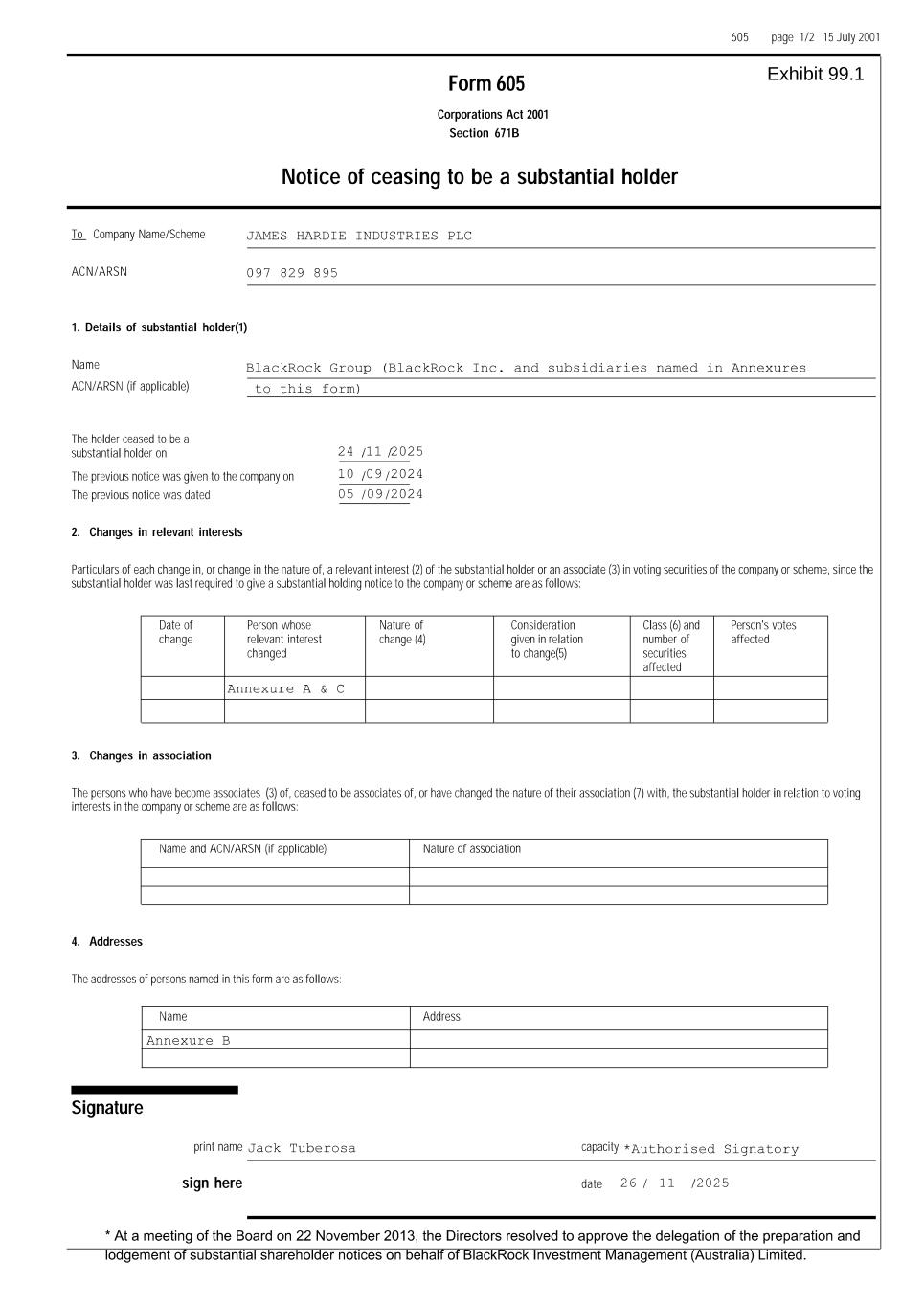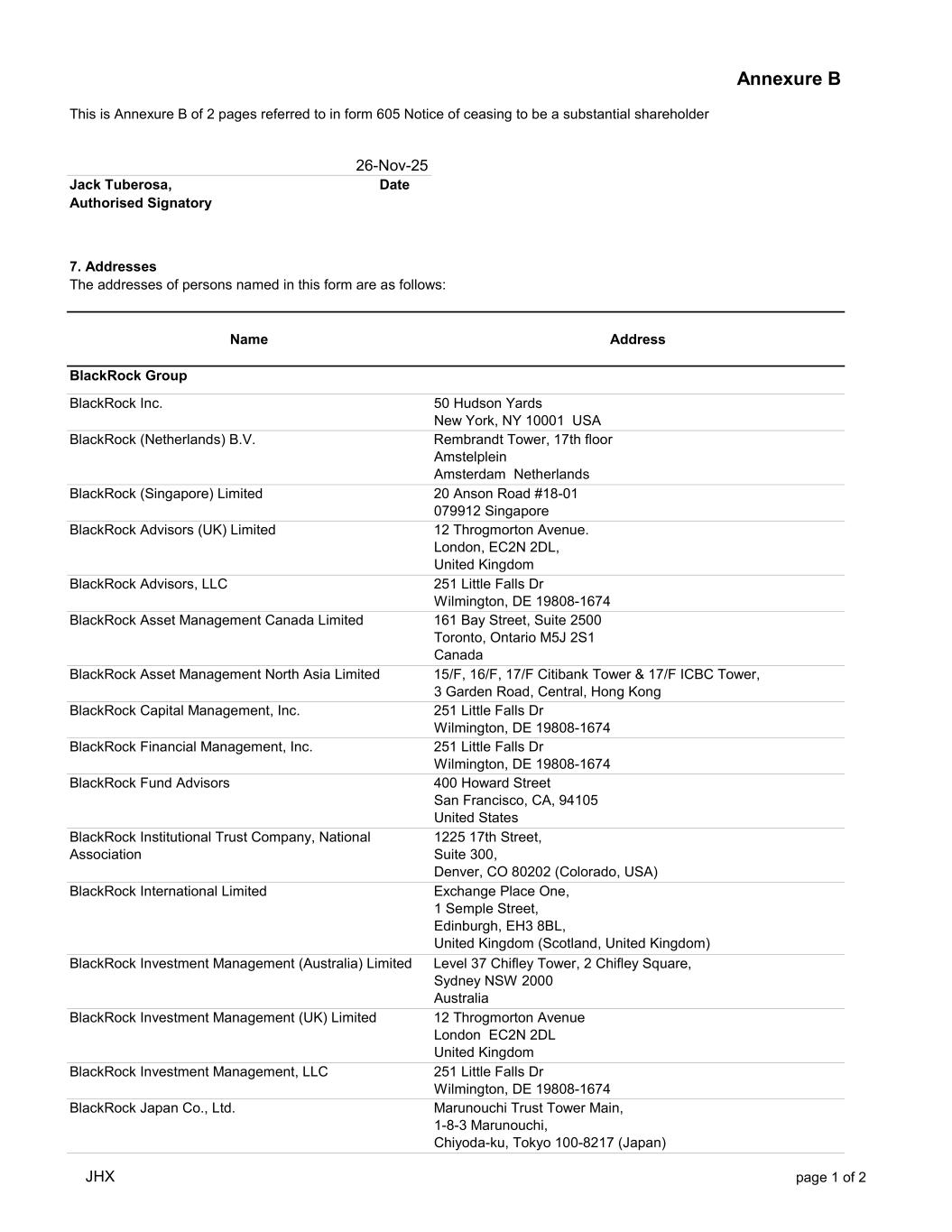 Annexure B This is Annexure B of 2 pages referred to in form 605 Notice of ceasing to be a substantial shareholder 26-Nov-25 Jack Tuberosa, Date Authorised Signatory 7. Addresses The addresses of persons named in this form are as follows: Name Address BlackRock Group BlackRock Inc. 50 Hudson Yards New York, NY 10001 USA BlackRock (Netherlands) B.V. Rembrandt Tower, 17th floor Amstelplein Amsterdam Netherlands BlackRock (Singapore) Limited 20 Anson Road #18-01 079912 Singapore BlackRock Advisors (UK) Limited 12 Throgmorton Avenue. London, EC2N 2DL, United Kingdom BlackRock Advisors, LLC 251 Little Falls Dr Wilmington, DE 19808-1674 BlackRock Asset Management Canada Limited 161 Bay Street, Suite 2500 Toronto, Ontario M5J 2S1 Canada BlackRock Asset Management North Asia Limited 15/F, 16/F, 17/F Citibank Tower & 17/F ICBC Tower, 3 Garden Road, Central, Hong Kong BlackRock Capital Management, Inc. 251 Little Falls Dr Wilmington, DE 19808-1674 BlackRock Financial Management, Inc. 251 Little Falls Dr Wilmington, DE 19808-1674 BlackRock Fund Advisors 400 Howard Street San Francisco, CA, 94105 United States BlackRock Institutional Trust Company, National Association 1225 17th Street, Suite 300, Denver, CO 80202 (Colorado, USA) BlackRock International Limited Exchange Place One, 1 Semple Street, Edinburgh, EH3 8BL, United Kingdom (Scotland, United Kingdom) BlackRock Investment Management (Australia) Limited Level 37 Chifley Tower, 2 Chifley Square, Sydney NSW 2000 Australia BlackRock Investment Management (UK) Limited 12 Throgmorton Avenue London EC2N 2DL United Kingdom BlackRock Investment Management, LLC 251 Little Falls Dr Wilmington, DE 19808-1674 BlackRock Japan Co., Ltd. Marunouchi Trust Tower Main, 1-8-3 Marunouchi, Chiyoda-ku, Tokyo 100-8217 (Japan) JHX page 1 of 2