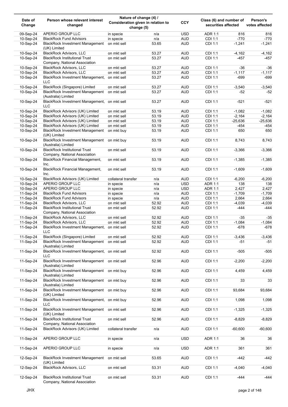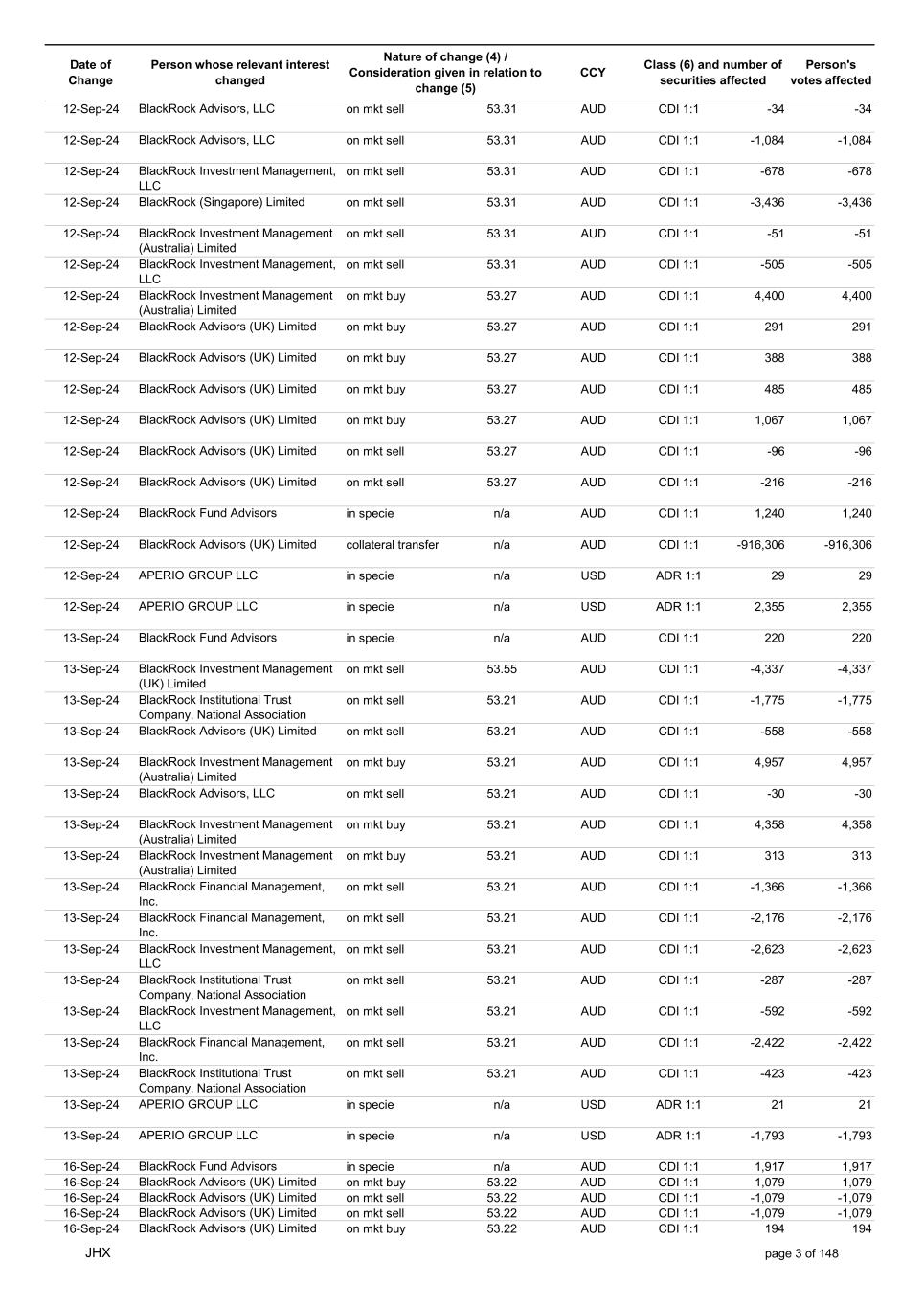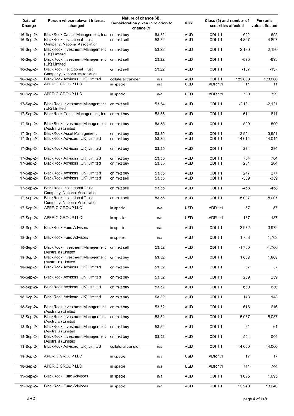 Date of Change Person whose relevant interest changed Nature of change (4) / Consideration given in relation to change (5) Class (6) and number of securities affected Person's votes affected CCY 12-Sep-24 BlackRock Advisors, LLC on mkt sell 53.31 AUD CDI 1:1 -34 -34 12-Sep-24 BlackRock Advisors, LLC on mkt sell 53.31 AUD CDI 1:1 -1,084 -1,084 12-Sep-24 BlackRock Investment Management, LLC on mkt sell 53.31 AUD CDI 1:1 -678 -678 12-Sep-24 BlackRock (Singapore) Limited on mkt sell 53.31 AUD CDI 1:1 -3,436 -3,436 12-Sep-24 BlackRock Investment Management (Australia) Limited on mkt sell 53.31 AUD CDI 1:1 -51 -51 12-Sep-24 BlackRock Investment Management, LLC on mkt sell 53.31 AUD CDI 1:1 -505 -505 12-Sep-24 BlackRock Investment Management (Australia) Limited on mkt buy 53.27 AUD CDI 1:1 4,400 4,400 12-Sep-24 BlackRock Advisors (UK) Limited on mkt buy 53.27 AUD CDI 1:1 291 291 12-Sep-24 BlackRock Advisors (UK) Limited on mkt buy 53.27 AUD CDI 1:1 388 388 12-Sep-24 BlackRock Advisors (UK) Limited on mkt buy 53.27 AUD CDI 1:1 485 485 12-Sep-24 BlackRock Advisors (UK) Limited on mkt buy 53.27 AUD CDI 1:1 1,067 1,067 12-Sep-24 BlackRock Advisors (UK) Limited on mkt sell 53.27 AUD CDI 1:1 -96 -96 12-Sep-24 BlackRock Advisors (UK) Limited on mkt sell 53.27 AUD CDI 1:1 -216 -216 12-Sep-24 BlackRock Fund Advisors in specie n/a AUD CDI 1:1 1,240 1,240 12-Sep-24 BlackRock Advisors (UK) Limited collateral transfer n/a AUD CDI 1:1 -916,306 -916,306 12-Sep-24 APERIO GROUP LLC in specie n/a USD ADR 1:1 29 29 12-Sep-24 APERIO GROUP LLC in specie n/a USD ADR 1:1 2,355 2,355 13-Sep-24 BlackRock Fund Advisors in specie n/a AUD CDI 1:1 220 220 13-Sep-24 BlackRock Investment Management (UK) Limited on mkt sell 53.55 AUD CDI 1:1 -4,337 -4,337 13-Sep-24 BlackRock Institutional Trust Company, National Association on mkt sell 53.21 AUD CDI 1:1 -1,775 -1,775 13-Sep-24 BlackRock Advisors (UK) Limited on mkt sell 53.21 AUD CDI 1:1 -558 -558 13-Sep-24 BlackRock Investment Management (Australia) Limited on mkt buy 53.21 AUD CDI 1:1 4,957 4,957 13-Sep-24 BlackRock Advisors, LLC on mkt sell 53.21 AUD CDI 1:1 -30 -30 13-Sep-24 BlackRock Investment Management (Australia) Limited on mkt buy 53.21 AUD CDI 1:1 4,358 4,358 13-Sep-24 BlackRock Investment Management (Australia) Limited on mkt buy 53.21 AUD CDI 1:1 313 313 13-Sep-24 BlackRock Financial Management, Inc. on mkt sell 53.21 AUD CDI 1:1 -1,366 -1,366 13-Sep-24 BlackRock Financial Management, Inc. on mkt sell 53.21 AUD CDI 1:1 -2,176 -2,176 13-Sep-24 BlackRock Investment Management, LLC on mkt sell 53.21 AUD CDI 1:1 -2,623 -2,623 13-Sep-24 BlackRock Institutional Trust Company, National Association on mkt sell 53.21 AUD CDI 1:1 -287 -287 13-Sep-24 BlackRock Investment Management, LLC on mkt sell 53.21 AUD CDI 1:1 -592 -592 13-Sep-24 BlackRock Financial Management, Inc. on mkt sell 53.21 AUD CDI 1:1 -2,422 -2,422 13-Sep-24 BlackRock Institutional Trust Company, National Association on mkt sell 53.21 AUD CDI 1:1 -423 -423 13-Sep-24 APERIO GROUP LLC in specie n/a USD ADR 1:1 21 21 13-Sep-24 APERIO GROUP LLC in specie n/a USD ADR 1:1 -1,793 -1,793 16-Sep-24 BlackRock Fund Advisors in specie n/a AUD CDI 1:1 1,917 1,917 16-Sep-24 BlackRock Advisors (UK) Limited on mkt buy 53.22 AUD CDI 1:1 1,079 1,079 16-Sep-24 BlackRock Advisors (UK) Limited on mkt sell 53.22 AUD CDI 1:1 -1,079 -1,079 16-Sep-24 BlackRock Advisors (UK) Limited on mkt sell 53.22 AUD CDI 1:1 -1,079 -1,079 16-Sep-24 BlackRock Advisors (UK) Limited on mkt buy 53.22 AUD CDI 1:1 194 194 JHX page 3 of 148