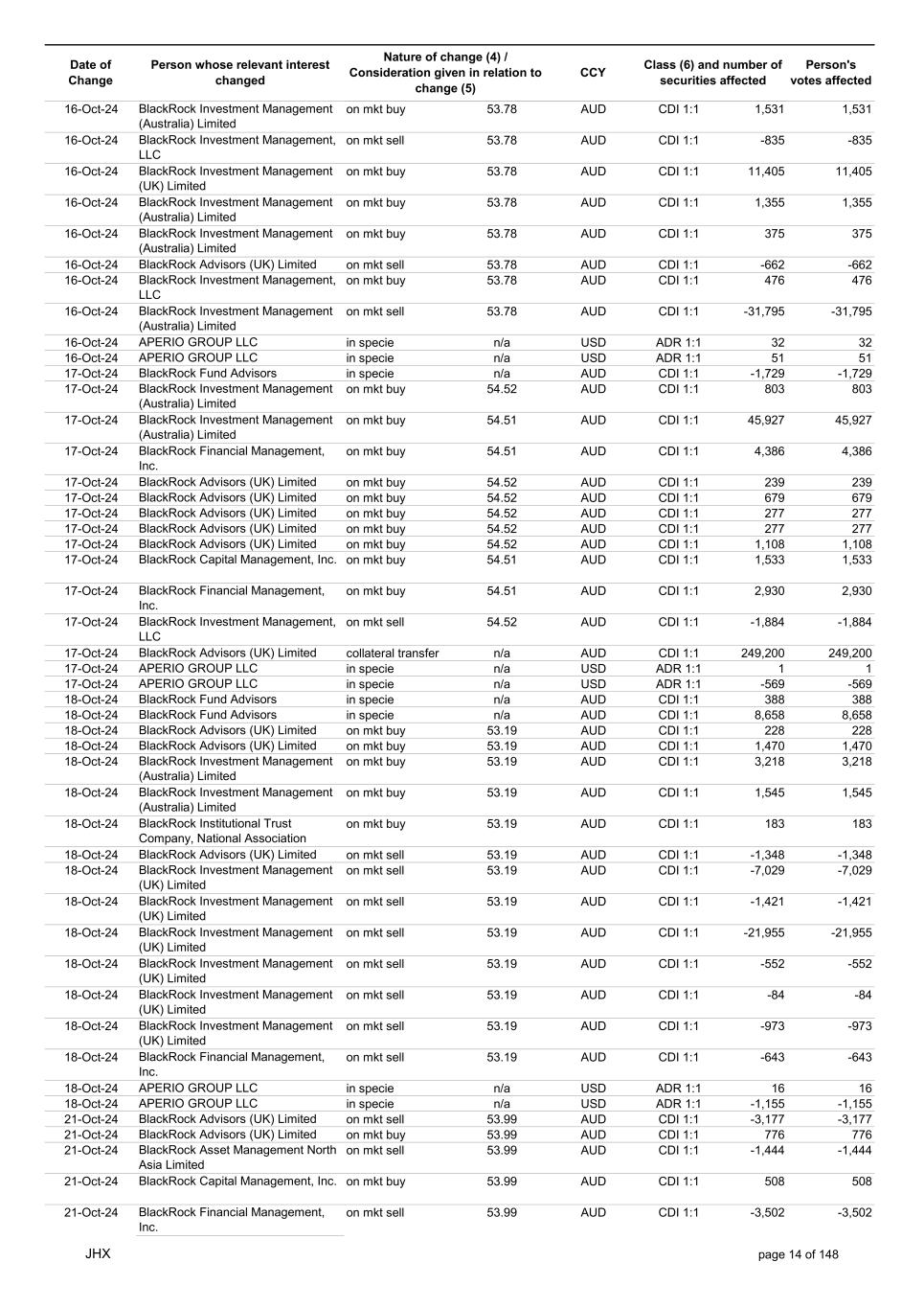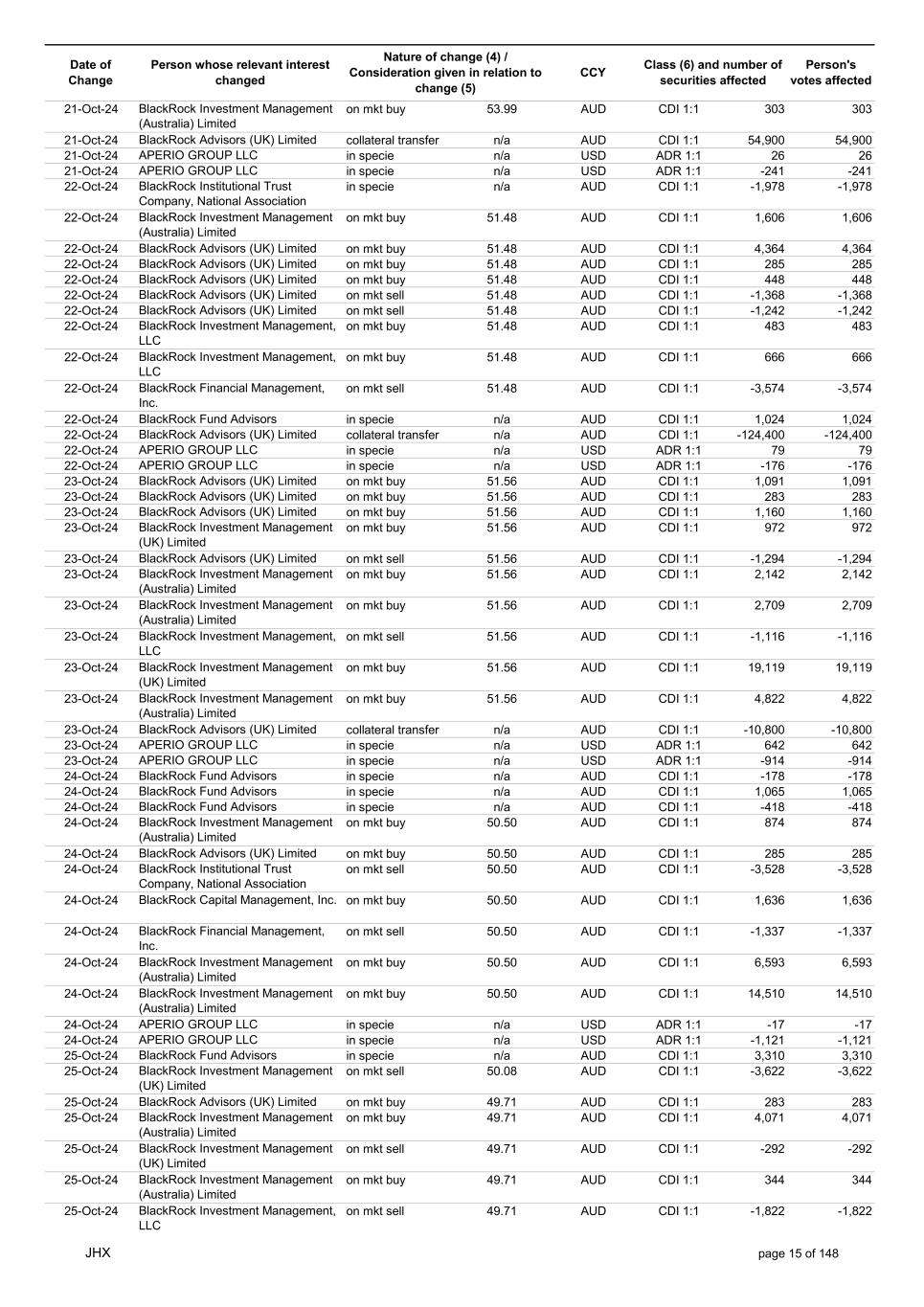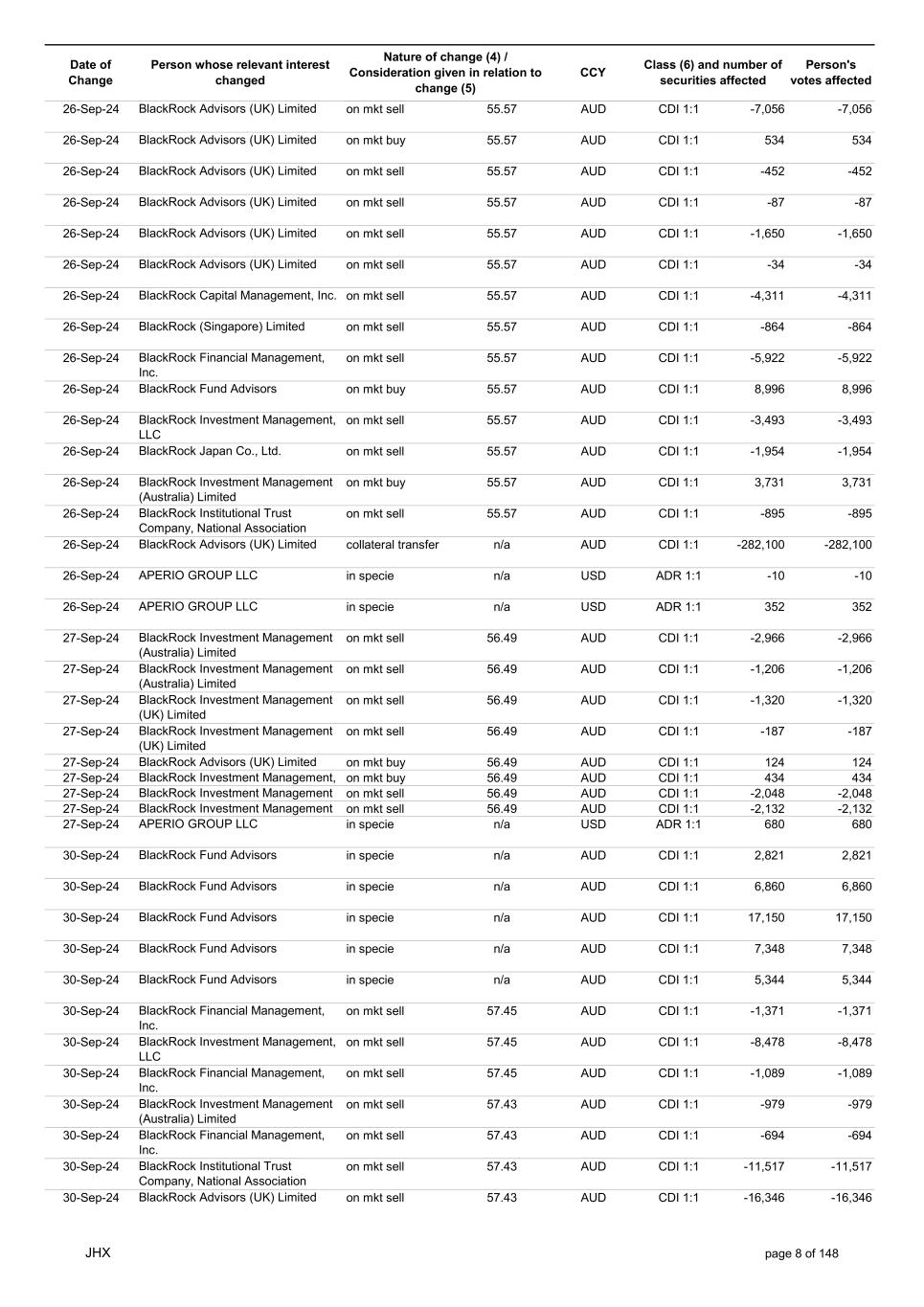 Date of Change Person whose relevant interest changed Nature of change (4) / Consideration given in relation to change (5) Class (6) and number of securities affected Person's votes affected CCY 12-Sep-24 BlackRock Advisors, LLC on mkt sell 53.31 AUD CDI 1:1 -34 -34 12-Sep-24 BlackRock Advisors, LLC on mkt sell 53.31 AUD CDI 1:1 -1,084 -1,084 12-Sep-24 BlackRock Investment Management, LLC on mkt sell 53.31 AUD CDI 1:1 -678 -678 12-Sep-24 BlackRock (Singapore) Limited on mkt sell 53.31 AUD CDI 1:1 -3,436 -3,436 12-Sep-24 BlackRock Investment Management (Australia) Limited on mkt sell 53.31 AUD CDI 1:1 -51 -51 12-Sep-24 BlackRock Investment Management, LLC on mkt sell 53.31 AUD CDI 1:1 -505 -505 12-Sep-24 BlackRock Investment Management (Australia) Limited on mkt buy 53.27 AUD CDI 1:1 4,400 4,400 12-Sep-24 BlackRock Advisors (UK) Limited on mkt buy 53.27 AUD CDI 1:1 291 291 12-Sep-24 BlackRock Advisors (UK) Limited on mkt buy 53.27 AUD CDI 1:1 388 388 12-Sep-24 BlackRock Advisors (UK) Limited on mkt buy 53.27 AUD CDI 1:1 485 485 12-Sep-24 BlackRock Advisors (UK) Limited on mkt buy 53.27 AUD CDI 1:1 1,067 1,067 12-Sep-24 BlackRock Advisors (UK) Limited on mkt sell 53.27 AUD CDI 1:1 -96 -96 12-Sep-24 BlackRock Advisors (UK) Limited on mkt sell 53.27 AUD CDI 1:1 -216 -216 12-Sep-24 BlackRock Fund Advisors in specie n/a AUD CDI 1:1 1,240 1,240 12-Sep-24 BlackRock Advisors (UK) Limited collateral transfer n/a AUD CDI 1:1 -916,306 -916,306 12-Sep-24 APERIO GROUP LLC in specie n/a USD ADR 1:1 29 29 12-Sep-24 APERIO GROUP LLC in specie n/a USD ADR 1:1 2,355 2,355 13-Sep-24 BlackRock Fund Advisors in specie n/a AUD CDI 1:1 220 220 13-Sep-24 BlackRock Investment Management (UK) Limited on mkt sell 53.55 AUD CDI 1:1 -4,337 -4,337 13-Sep-24 BlackRock Institutional Trust Company, National Association on mkt sell 53.21 AUD CDI 1:1 -1,775 -1,775 13-Sep-24 BlackRock Advisors (UK) Limited on mkt sell 53.21 AUD CDI 1:1 -558 -558 13-Sep-24 BlackRock Investment Management (Australia) Limited on mkt buy 53.21 AUD CDI 1:1 4,957 4,957 13-Sep-24 BlackRock Advisors, LLC on mkt sell 53.21 AUD CDI 1:1 -30 -30 13-Sep-24 BlackRock Investment Management (Australia) Limited on mkt buy 53.21 AUD CDI 1:1 4,358 4,358 13-Sep-24 BlackRock Investment Management (Australia) Limited on mkt buy 53.21 AUD CDI 1:1 313 313 13-Sep-24 BlackRock Financial Management, Inc. on mkt sell 53.21 AUD CDI 1:1 -1,366 -1,366 13-Sep-24 BlackRock Financial Management, Inc. on mkt sell 53.21 AUD CDI 1:1 -2,176 -2,176 13-Sep-24 BlackRock Investment Management, LLC on mkt sell 53.21 AUD CDI 1:1 -2,623 -2,623 13-Sep-24 BlackRock Institutional Trust Company, National Association on mkt sell 53.21 AUD CDI 1:1 -287 -287 13-Sep-24 BlackRock Investment Management, LLC on mkt sell 53.21 AUD CDI 1:1 -592 -592 13-Sep-24 BlackRock Financial Management, Inc. on mkt sell 53.21 AUD CDI 1:1 -2,422 -2,422 13-Sep-24 BlackRock Institutional Trust Company, National Association on mkt sell 53.21 AUD CDI 1:1 -423 -423 13-Sep-24 APERIO GROUP LLC in specie n/a USD ADR 1:1 21 21 13-Sep-24 APERIO GROUP LLC in specie n/a USD ADR 1:1 -1,793 -1,793 16-Sep-24 BlackRock Fund Advisors in specie n/a AUD CDI 1:1 1,917 1,917 16-Sep-24 BlackRock Advisors (UK) Limited on mkt buy 53.22 AUD CDI 1:1 1,079 1,079 16-Sep-24 BlackRock Advisors (UK) Limited on mkt sell 53.22 AUD CDI 1:1 -1,079 -1,079 16-Sep-24 BlackRock Advisors (UK) Limited on mkt sell 53.22 AUD CDI 1:1 -1,079 -1,079 16-Sep-24 BlackRock Advisors (UK) Limited on mkt buy 53.22 AUD CDI 1:1 194 194 JHX page 3 of 148