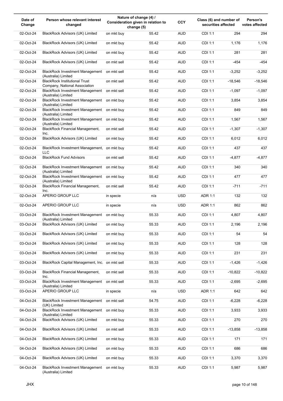 Date of Change Person whose relevant interest changed Nature of change (4) / Consideration given in relation to change (5) Class (6) and number of securities affected Person's votes affected CCY 02-Oct-24 BlackRock Advisors (UK) Limited on mkt buy 55.42 AUD CDI 1:1 294 294 02-Oct-24 BlackRock Advisors (UK) Limited on mkt buy 55.42 AUD CDI 1:1 1,176 1,176 02-Oct-24 BlackRock Advisors (UK) Limited on mkt buy 55.42 AUD CDI 1:1 281 281 02-Oct-24 BlackRock Advisors (UK) Limited on mkt sell 55.42 AUD CDI 1:1 -454 -454 02-Oct-24 BlackRock Investment Management (Australia) Limited on mkt sell 55.42 AUD CDI 1:1 -3,252 -3,252 02-Oct-24 BlackRock Institutional Trust Company, National Association on mkt sell 55.42 AUD CDI 1:1 -18,546 -18,546 02-Oct-24 BlackRock Investment Management (Australia) Limited on mkt sell 55.42 AUD CDI 1:1 -1,097 -1,097 02-Oct-24 BlackRock Investment Management (Australia) Limited on mkt buy 55.42 AUD CDI 1:1 3,854 3,854 02-Oct-24 BlackRock Investment Management (Australia) Limited on mkt buy 55.42 AUD CDI 1:1 849 849 02-Oct-24 BlackRock Investment Management (Australia) Limited on mkt buy 55.42 AUD CDI 1:1 1,567 1,567 02-Oct-24 BlackRock Financial Management, Inc. on mkt sell 55.42 AUD CDI 1:1 -1,307 -1,307 02-Oct-24 BlackRock Advisors (UK) Limited on mkt buy 55.42 AUD CDI 1:1 6,012 6,012 02-Oct-24 BlackRock Investment Management, LLC on mkt buy 55.42 AUD CDI 1:1 437 437 02-Oct-24 BlackRock Fund Advisors on mkt sell 55.42 AUD CDI 1:1 -4,877 -4,877 02-Oct-24 BlackRock Investment Management (Australia) Limited on mkt buy 55.42 AUD CDI 1:1 340 340 02-Oct-24 BlackRock Investment Management (Australia) Limited on mkt buy 55.42 AUD CDI 1:1 477 477 02-Oct-24 BlackRock Financial Management, Inc. on mkt sell 55.42 AUD CDI 1:1 -711 -711 02-Oct-24 APERIO GROUP LLC in specie n/a USD ADR 1:1 132 132 02-Oct-24 APERIO GROUP LLC in specie n/a USD ADR 1:1 862 862 03-Oct-24 BlackRock Investment Management (Australia) Limited on mkt buy 55.33 AUD CDI 1:1 4,807 4,807 03-Oct-24 BlackRock Advisors (UK) Limited on mkt buy 55.33 AUD CDI 1:1 2,196 2,196 03-Oct-24 BlackRock Advisors (UK) Limited on mkt buy 55.33 AUD CDI 1:1 54 54 03-Oct-24 BlackRock Advisors (UK) Limited on mkt buy 55.33 AUD CDI 1:1 128 128 03-Oct-24 BlackRock Advisors (UK) Limited on mkt buy 55.33 AUD CDI 1:1 231 231 03-Oct-24 BlackRock Capital Management, Inc. on mkt sell 55.33 AUD CDI 1:1 -1,426 -1,426 03-Oct-24 BlackRock Financial Management, Inc. on mkt sell 55.33 AUD CDI 1:1 -10,822 -10,822 03-Oct-24 BlackRock Investment Management (Australia) Limited on mkt sell 55.33 AUD CDI 1:1 -2,695 -2,695 03-Oct-24 APERIO GROUP LLC in specie n/a USD ADR 1:1 642 642 04-Oct-24 BlackRock Investment Management (UK) Limited on mkt sell 54.75 AUD CDI 1:1 -6,228 -6,228 04-Oct-24 BlackRock Investment Management (Australia) Limited on mkt buy 55.33 AUD CDI 1:1 3,933 3,933 04-Oct-24 BlackRock Advisors (UK) Limited on mkt buy 55.33 AUD CDI 1:1 270 270 04-Oct-24 BlackRock Advisors (UK) Limited on mkt sell 55.33 AUD CDI 1:1 -13,858 -13,858 04-Oct-24 BlackRock Advisors (UK) Limited on mkt buy 55.33 AUD CDI 1:1 171 171 04-Oct-24 BlackRock Advisors (UK) Limited on mkt buy 55.33 AUD CDI 1:1 686 686 04-Oct-24 BlackRock Advisors (UK) Limited on mkt buy 55.33 AUD CDI 1:1 3,370 3,370 04-Oct-24 BlackRock Investment Management (Australia) Limited on mkt buy 55.33 AUD CDI 1:1 5,987 5,987 JHX page 10 of 148