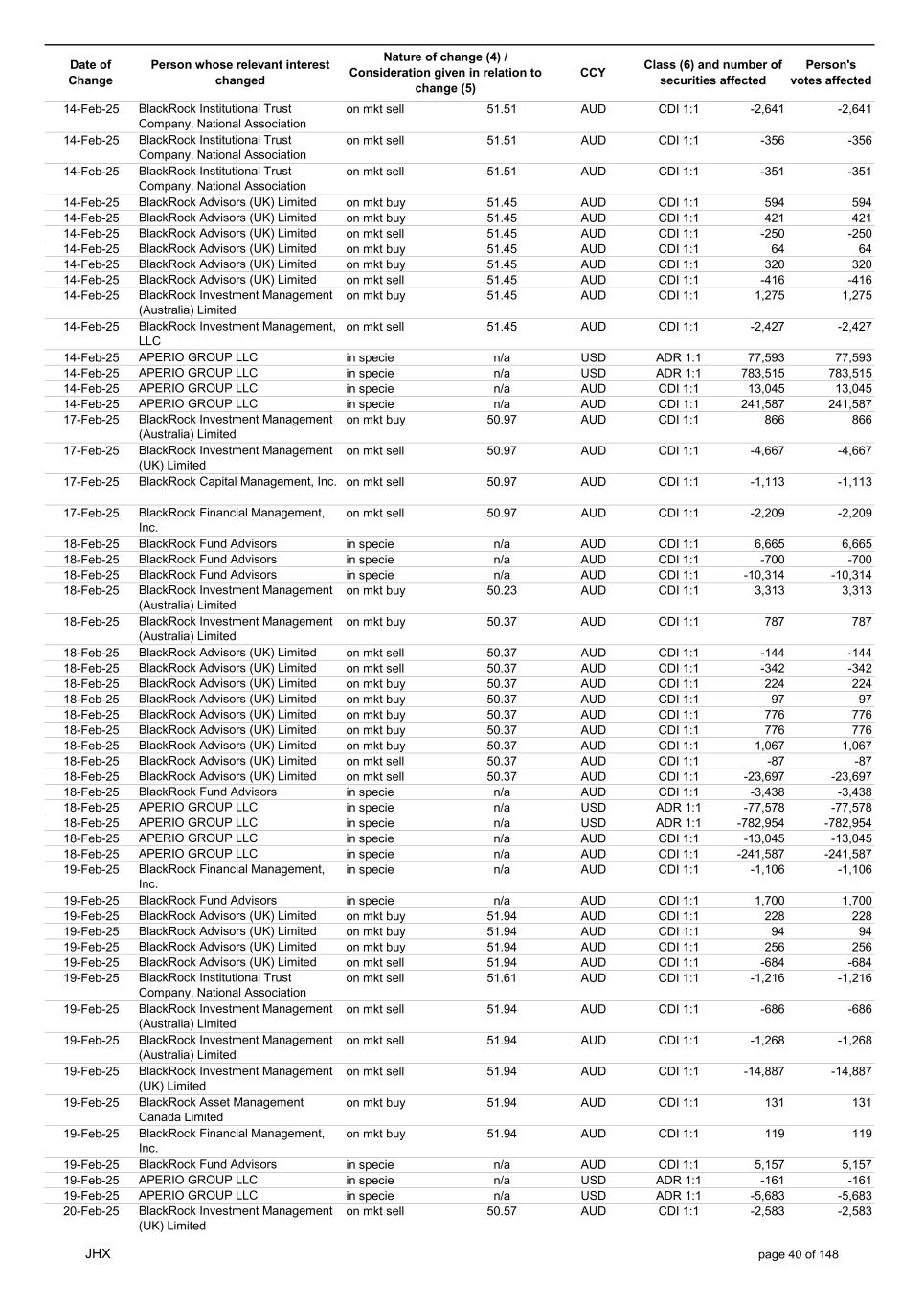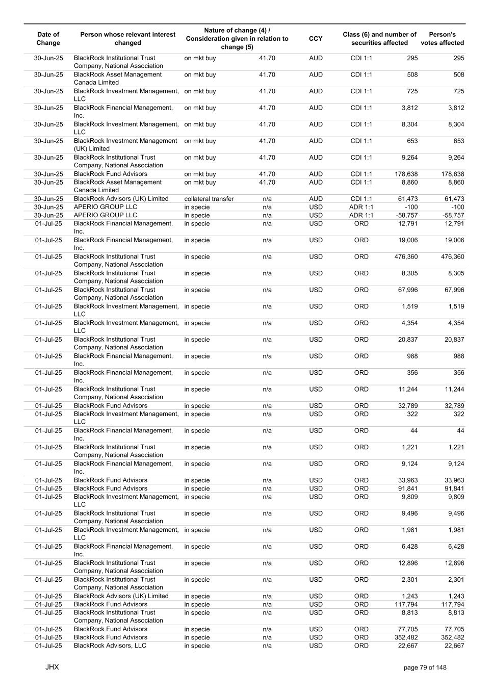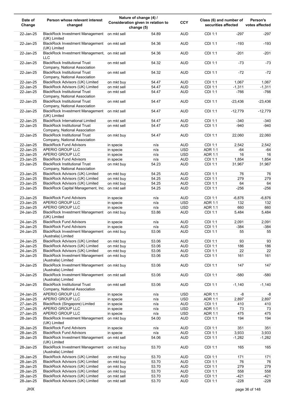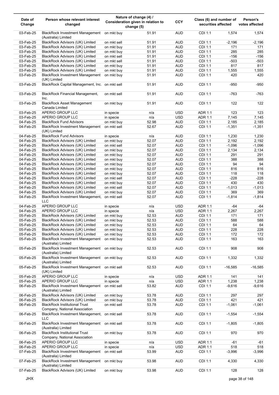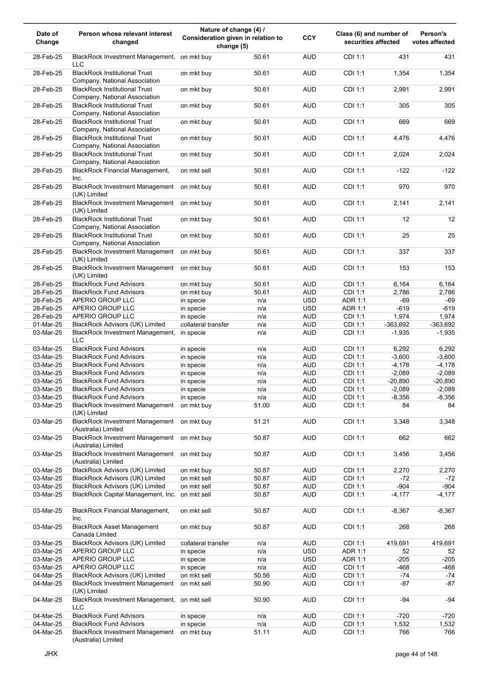 Date of Change Person whose relevant interest changed Nature of change (4) / Consideration given in relation to change (5) Class (6) and number of securities affected Person's votes affected CCY 20-Jun-25 BlackRock Investment Management, LLC on mkt sell 36.88 AUD CDI 1:1 -29,219 -29,219 20-Jun-25 BlackRock Investment Management (UK) Limited on mkt buy 36.88 AUD CDI 1:1 2,954 2,954 20-Jun-25 BlackRock Investment Management (UK) Limited on mkt buy 36.88 AUD CDI 1:1 12,706 12,706 20-Jun-25 BlackRock Investment Management (UK) Limited on mkt sell 36.88 AUD CDI 1:1 -1,224 -1,224 20-Jun-25 APERIO GROUP LLC in specie n/a USD ADR 1:1 -57,504 -57,504 20-Jun-25 APERIO GROUP LLC in specie n/a USD ADR 1:1 -714,219 -714,219 20-Jun-25 APERIO GROUP LLC in specie n/a AUD CDI 1:1 -13,045 -13,045 20-Jun-25 APERIO GROUP LLC in specie n/a AUD CDI 1:1 -183,704 -183,704 22-Jun-25 BlackRock Advisors (UK) Limited collateral transfer n/a AUD CDI 1:1 -686,000 -686,000 23-Jun-25 BlackRock Investment Management (UK) Limited on mkt sell 36.95 AUD CDI 1:1 -15,495 -15,495 23-Jun-25 BlackRock Investment Management, LLC on mkt buy 37.04 AUD CDI 1:1 1,045 1,045 23-Jun-25 BlackRock Investment Management (Australia) Limited on mkt sell 36.85 AUD CDI 1:1 -1,724 -1,724 23-Jun-25 BlackRock Advisors (UK) Limited on mkt sell 36.85 AUD CDI 1:1 -4,420 -4,420 23-Jun-25 BlackRock Advisors (UK) Limited on mkt sell 36.85 AUD CDI 1:1 -91 -91 23-Jun-25 BlackRock Capital Management, Inc. on mkt buy 36.85 AUD CDI 1:1 8,752 8,752 23-Jun-25 BlackRock Financial Management, Inc. on mkt buy 36.85 AUD CDI 1:1 4,340 4,340 23-Jun-25 BlackRock Asset Management Canada Limited on mkt buy 36.85 AUD CDI 1:1 233 233 23-Jun-25 BlackRock Advisors (UK) Limited collateral transfer n/a AUD CDI 1:1 461,097 461,097 23-Jun-25 APERIO GROUP LLC in specie n/a USD ADR 1:1 164 164 23-Jun-25 APERIO GROUP LLC in specie n/a USD ADR 1:1 -977 -977 24-Jun-25 BlackRock Advisors, LLC on mkt sell 37.89 AUD CDI 1:1 -3,056 -3,056 24-Jun-25 BlackRock Institutional Trust Company, National Association on mkt sell 37.89 AUD CDI 1:1 -426 -426 24-Jun-25 BlackRock Advisors, LLC on mkt sell 37.89 AUD CDI 1:1 -49 -49 24-Jun-25 BlackRock Advisors, LLC on mkt sell 37.89 AUD CDI 1:1 -782 -782 24-Jun-25 BlackRock Investment Management, LLC on mkt sell 37.89 AUD CDI 1:1 -496 -496 24-Jun-25 BlackRock Investment Management, LLC on mkt sell 37.99 AUD CDI 1:1 -1,593 -1,593 24-Jun-25 BlackRock (Singapore) Limited on mkt sell 37.89 AUD CDI 1:1 -2,970 -2,970 24-Jun-25 BlackRock Investment Management (Australia) Limited on mkt sell 37.89 AUD CDI 1:1 -35 -35 24-Jun-25 BlackRock Fund Advisors on mkt buy 37.99 AUD CDI 1:1 473 473 24-Jun-25 BlackRock Investment Management, LLC on mkt sell 37.89 AUD CDI 1:1 -393 -393 24-Jun-25 BlackRock Fund Advisors in specie n/a AUD CDI 1:1 -12,738 -12,738 24-Jun-25 BlackRock Advisors (UK) Limited on mkt sell 37.89 AUD CDI 1:1 -1,197 -1,197 24-Jun-25 BlackRock Advisors (UK) Limited on mkt buy 37.89 AUD CDI 1:1 1,180 1,180 24-Jun-25 BlackRock Advisors (UK) Limited on mkt sell 37.89 AUD CDI 1:1 -408 -408 24-Jun-25 BlackRock Advisors (UK) Limited on mkt sell 37.89 AUD CDI 1:1 -1,030 -1,030 24-Jun-25 BlackRock Asset Management Canada Limited on mkt buy 37.89 AUD CDI 1:1 206 206 24-Jun-25 BlackRock Advisors (UK) Limited on mkt buy 37.89 AUD CDI 1:1 229 229 24-Jun-25 BlackRock Institutional Trust Company, National Association on mkt buy 37.89 AUD CDI 1:1 33,796 33,796 24-Jun-25 BlackRock Advisors (UK) Limited collateral transfer n/a AUD CDI 1:1 224,903 224,903 24-Jun-25 APERIO GROUP LLC in specie n/a USD ADR 1:1 418 418 24-Jun-25 APERIO GROUP LLC in specie n/a USD ADR 1:1 2,134 2,134 25-Jun-25 BlackRock Fund Advisors in specie n/a AUD CDI 1:1 -11,842 -11,842 25-Jun-25 BlackRock Advisors, LLC on mkt sell 38.64 AUD CDI 1:1 -2,970 -2,970 25-Jun-25 BlackRock Institutional Trust Company, National Association on mkt sell 38.64 AUD CDI 1:1 -414 -414 25-Jun-25 BlackRock Advisors, LLC on mkt sell 38.64 AUD CDI 1:1 -35 -35 25-Jun-25 BlackRock Advisors, LLC on mkt sell 38.64 AUD CDI 1:1 -761 -761 25-Jun-25 BlackRock Investment Management, LLC on mkt sell 38.64 AUD CDI 1:1 -481 -481 25-Jun-25 BlackRock (Singapore) Limited on mkt sell 38.64 AUD CDI 1:1 -2,887 -2,887 25-Jun-25 BlackRock Investment Management (Australia) Limited on mkt sell 38.64 AUD CDI 1:1 -35 -35 25-Jun-25 BlackRock Investment Management, LLC on mkt sell 38.64 AUD CDI 1:1 -382 -382 25-Jun-25 BlackRock Fund Advisors in specie n/a AUD CDI 1:1 885 885 JHX page 75 of 148