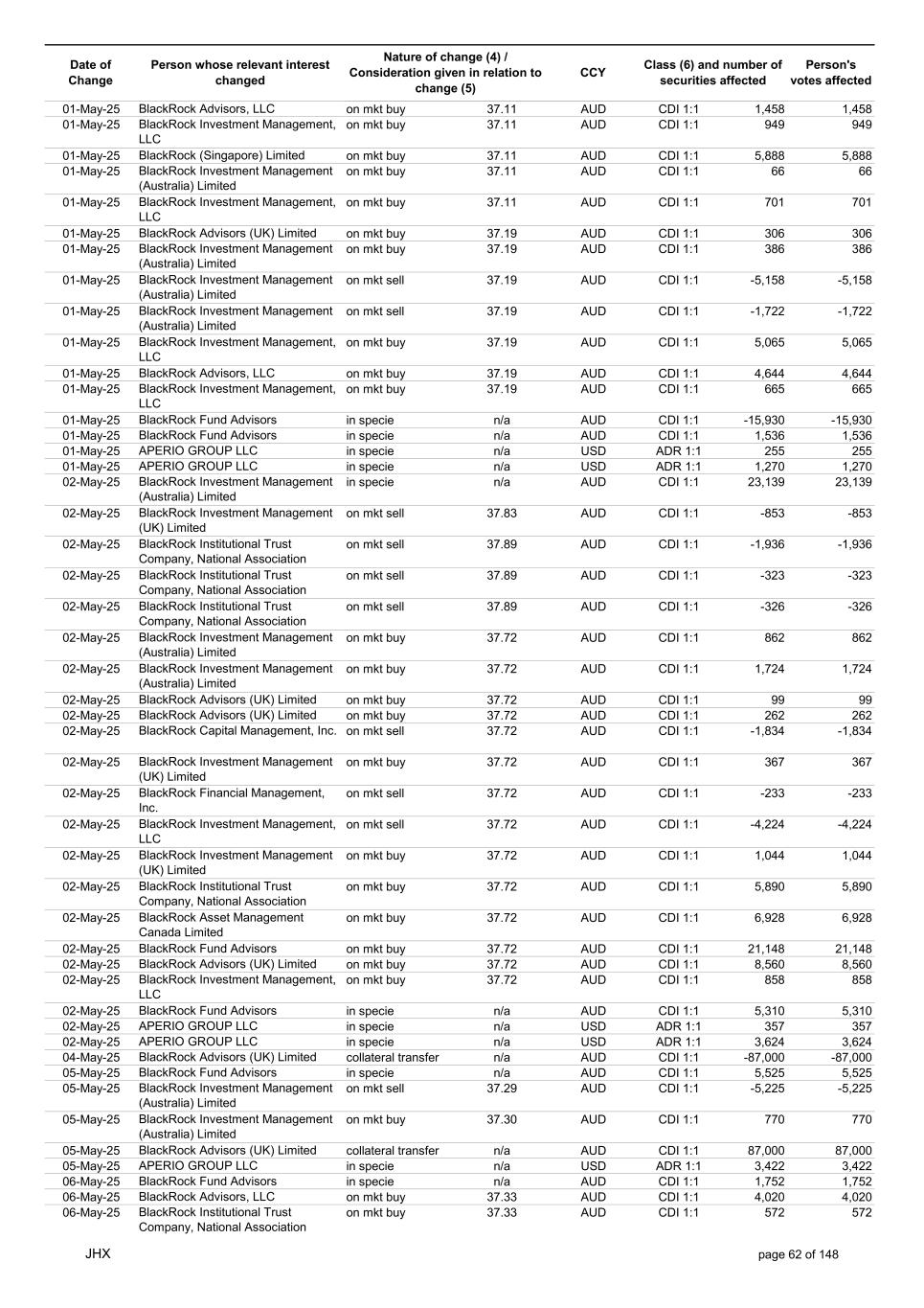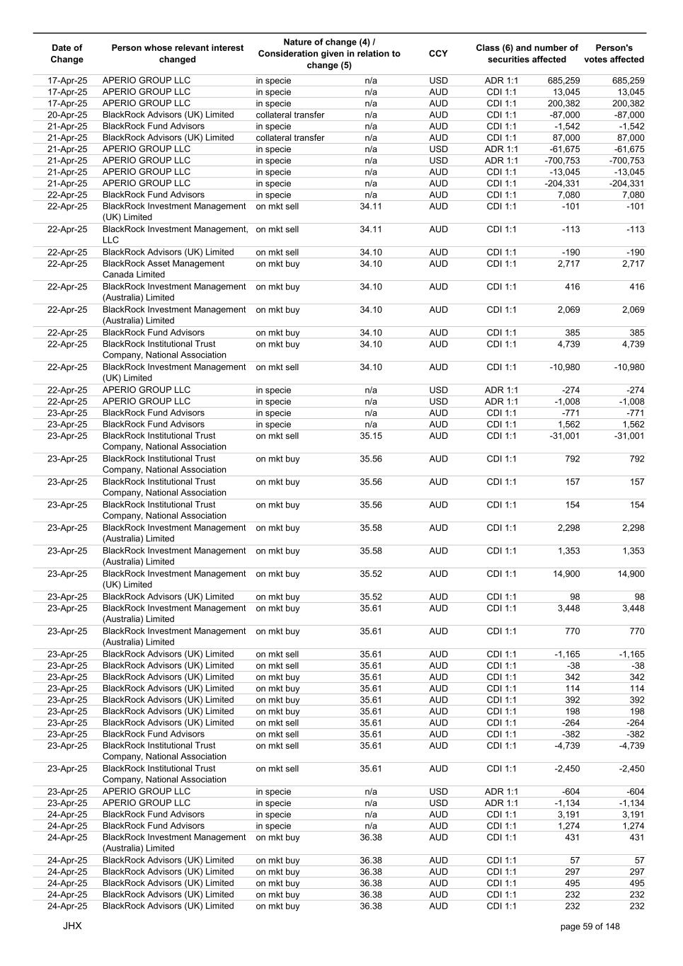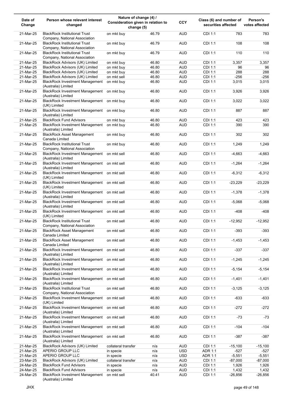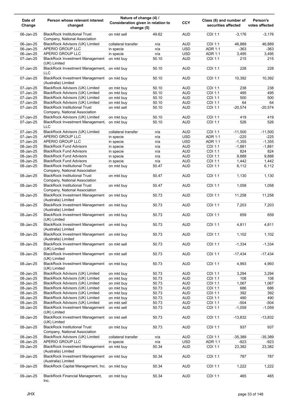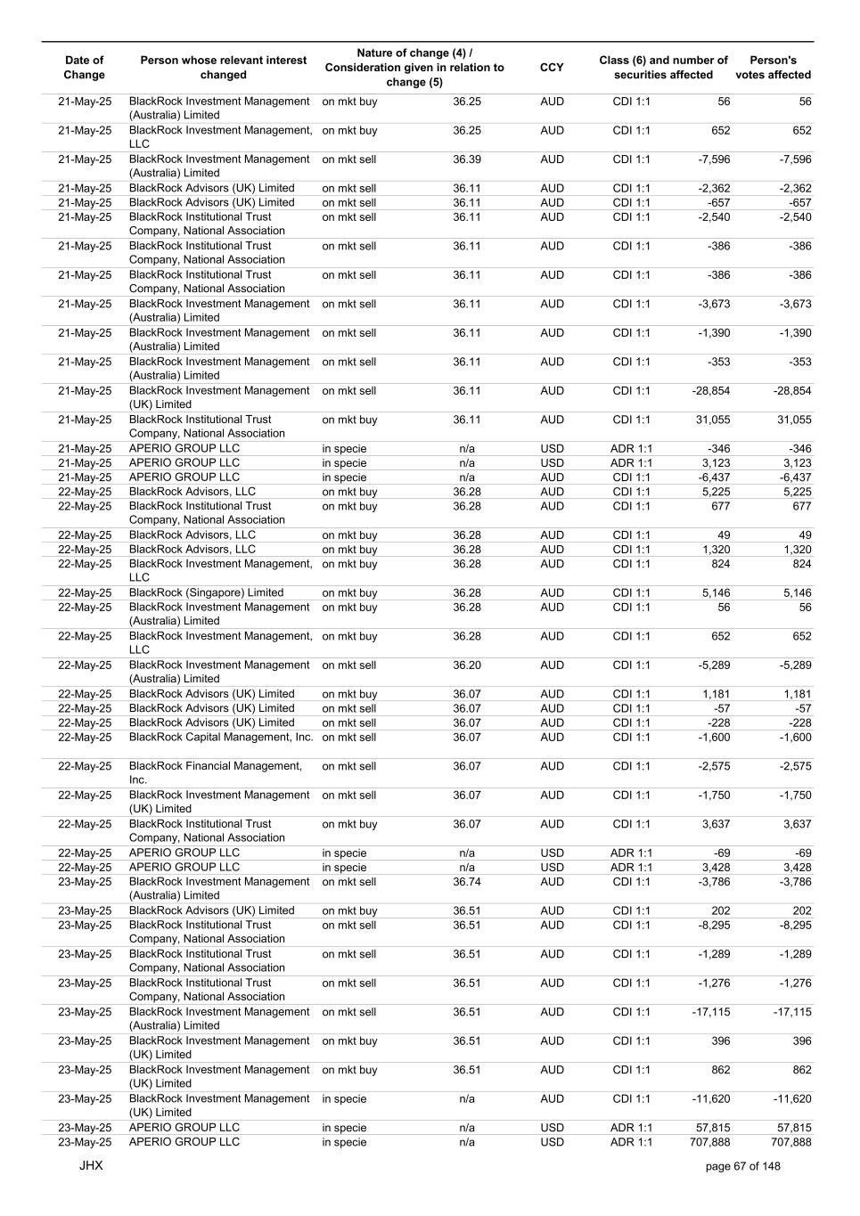 Date of Change Person whose relevant interest changed Nature of change (4) / Consideration given in relation to change (5) Class (6) and number of securities affected Person's votes affected CCY 20-Jun-25 BlackRock Investment Management, LLC on mkt sell 36.88 AUD CDI 1:1 -29,219 -29,219 20-Jun-25 BlackRock Investment Management (UK) Limited on mkt buy 36.88 AUD CDI 1:1 2,954 2,954 20-Jun-25 BlackRock Investment Management (UK) Limited on mkt buy 36.88 AUD CDI 1:1 12,706 12,706 20-Jun-25 BlackRock Investment Management (UK) Limited on mkt sell 36.88 AUD CDI 1:1 -1,224 -1,224 20-Jun-25 APERIO GROUP LLC in specie n/a USD ADR 1:1 -57,504 -57,504 20-Jun-25 APERIO GROUP LLC in specie n/a USD ADR 1:1 -714,219 -714,219 20-Jun-25 APERIO GROUP LLC in specie n/a AUD CDI 1:1 -13,045 -13,045 20-Jun-25 APERIO GROUP LLC in specie n/a AUD CDI 1:1 -183,704 -183,704 22-Jun-25 BlackRock Advisors (UK) Limited collateral transfer n/a AUD CDI 1:1 -686,000 -686,000 23-Jun-25 BlackRock Investment Management (UK) Limited on mkt sell 36.95 AUD CDI 1:1 -15,495 -15,495 23-Jun-25 BlackRock Investment Management, LLC on mkt buy 37.04 AUD CDI 1:1 1,045 1,045 23-Jun-25 BlackRock Investment Management (Australia) Limited on mkt sell 36.85 AUD CDI 1:1 -1,724 -1,724 23-Jun-25 BlackRock Advisors (UK) Limited on mkt sell 36.85 AUD CDI 1:1 -4,420 -4,420 23-Jun-25 BlackRock Advisors (UK) Limited on mkt sell 36.85 AUD CDI 1:1 -91 -91 23-Jun-25 BlackRock Capital Management, Inc. on mkt buy 36.85 AUD CDI 1:1 8,752 8,752 23-Jun-25 BlackRock Financial Management, Inc. on mkt buy 36.85 AUD CDI 1:1 4,340 4,340 23-Jun-25 BlackRock Asset Management Canada Limited on mkt buy 36.85 AUD CDI 1:1 233 233 23-Jun-25 BlackRock Advisors (UK) Limited collateral transfer n/a AUD CDI 1:1 461,097 461,097 23-Jun-25 APERIO GROUP LLC in specie n/a USD ADR 1:1 164 164 23-Jun-25 APERIO GROUP LLC in specie n/a USD ADR 1:1 -977 -977 24-Jun-25 BlackRock Advisors, LLC on mkt sell 37.89 AUD CDI 1:1 -3,056 -3,056 24-Jun-25 BlackRock Institutional Trust Company, National Association on mkt sell 37.89 AUD CDI 1:1 -426 -426 24-Jun-25 BlackRock Advisors, LLC on mkt sell 37.89 AUD CDI 1:1 -49 -49 24-Jun-25 BlackRock Advisors, LLC on mkt sell 37.89 AUD CDI 1:1 -782 -782 24-Jun-25 BlackRock Investment Management, LLC on mkt sell 37.89 AUD CDI 1:1 -496 -496 24-Jun-25 BlackRock Investment Management, LLC on mkt sell 37.99 AUD CDI 1:1 -1,593 -1,593 24-Jun-25 BlackRock (Singapore) Limited on mkt sell 37.89 AUD CDI 1:1 -2,970 -2,970 24-Jun-25 BlackRock Investment Management (Australia) Limited on mkt sell 37.89 AUD CDI 1:1 -35 -35 24-Jun-25 BlackRock Fund Advisors on mkt buy 37.99 AUD CDI 1:1 473 473 24-Jun-25 BlackRock Investment Management, LLC on mkt sell 37.89 AUD CDI 1:1 -393 -393 24-Jun-25 BlackRock Fund Advisors in specie n/a AUD CDI 1:1 -12,738 -12,738 24-Jun-25 BlackRock Advisors (UK) Limited on mkt sell 37.89 AUD CDI 1:1 -1,197 -1,197 24-Jun-25 BlackRock Advisors (UK) Limited on mkt buy 37.89 AUD CDI 1:1 1,180 1,180 24-Jun-25 BlackRock Advisors (UK) Limited on mkt sell 37.89 AUD CDI 1:1 -408 -408 24-Jun-25 BlackRock Advisors (UK) Limited on mkt sell 37.89 AUD CDI 1:1 -1,030 -1,030 24-Jun-25 BlackRock Asset Management Canada Limited on mkt buy 37.89 AUD CDI 1:1 206 206 24-Jun-25 BlackRock Advisors (UK) Limited on mkt buy 37.89 AUD CDI 1:1 229 229 24-Jun-25 BlackRock Institutional Trust Company, National Association on mkt buy 37.89 AUD CDI 1:1 33,796 33,796 24-Jun-25 BlackRock Advisors (UK) Limited collateral transfer n/a AUD CDI 1:1 224,903 224,903 24-Jun-25 APERIO GROUP LLC in specie n/a USD ADR 1:1 418 418 24-Jun-25 APERIO GROUP LLC in specie n/a USD ADR 1:1 2,134 2,134 25-Jun-25 BlackRock Fund Advisors in specie n/a AUD CDI 1:1 -11,842 -11,842 25-Jun-25 BlackRock Advisors, LLC on mkt sell 38.64 AUD CDI 1:1 -2,970 -2,970 25-Jun-25 BlackRock Institutional Trust Company, National Association on mkt sell 38.64 AUD CDI 1:1 -414 -414 25-Jun-25 BlackRock Advisors, LLC on mkt sell 38.64 AUD CDI 1:1 -35 -35 25-Jun-25 BlackRock Advisors, LLC on mkt sell 38.64 AUD CDI 1:1 -761 -761 25-Jun-25 BlackRock Investment Management, LLC on mkt sell 38.64 AUD CDI 1:1 -481 -481 25-Jun-25 BlackRock (Singapore) Limited on mkt sell 38.64 AUD CDI 1:1 -2,887 -2,887 25-Jun-25 BlackRock Investment Management (Australia) Limited on mkt sell 38.64 AUD CDI 1:1 -35 -35 25-Jun-25 BlackRock Investment Management, LLC on mkt sell 38.64 AUD CDI 1:1 -382 -382 25-Jun-25 BlackRock Fund Advisors in specie n/a AUD CDI 1:1 885 885 JHX page 75 of 148