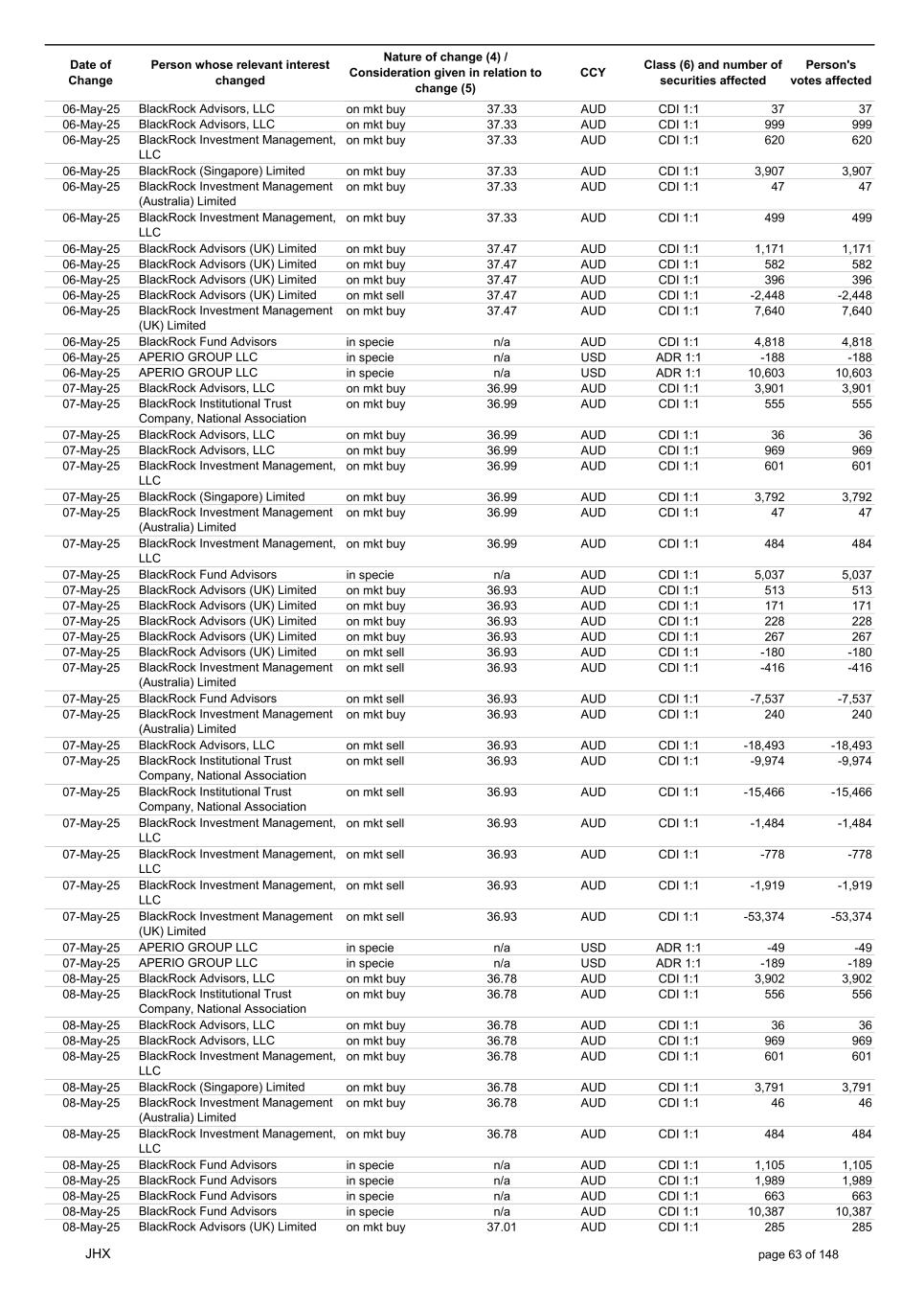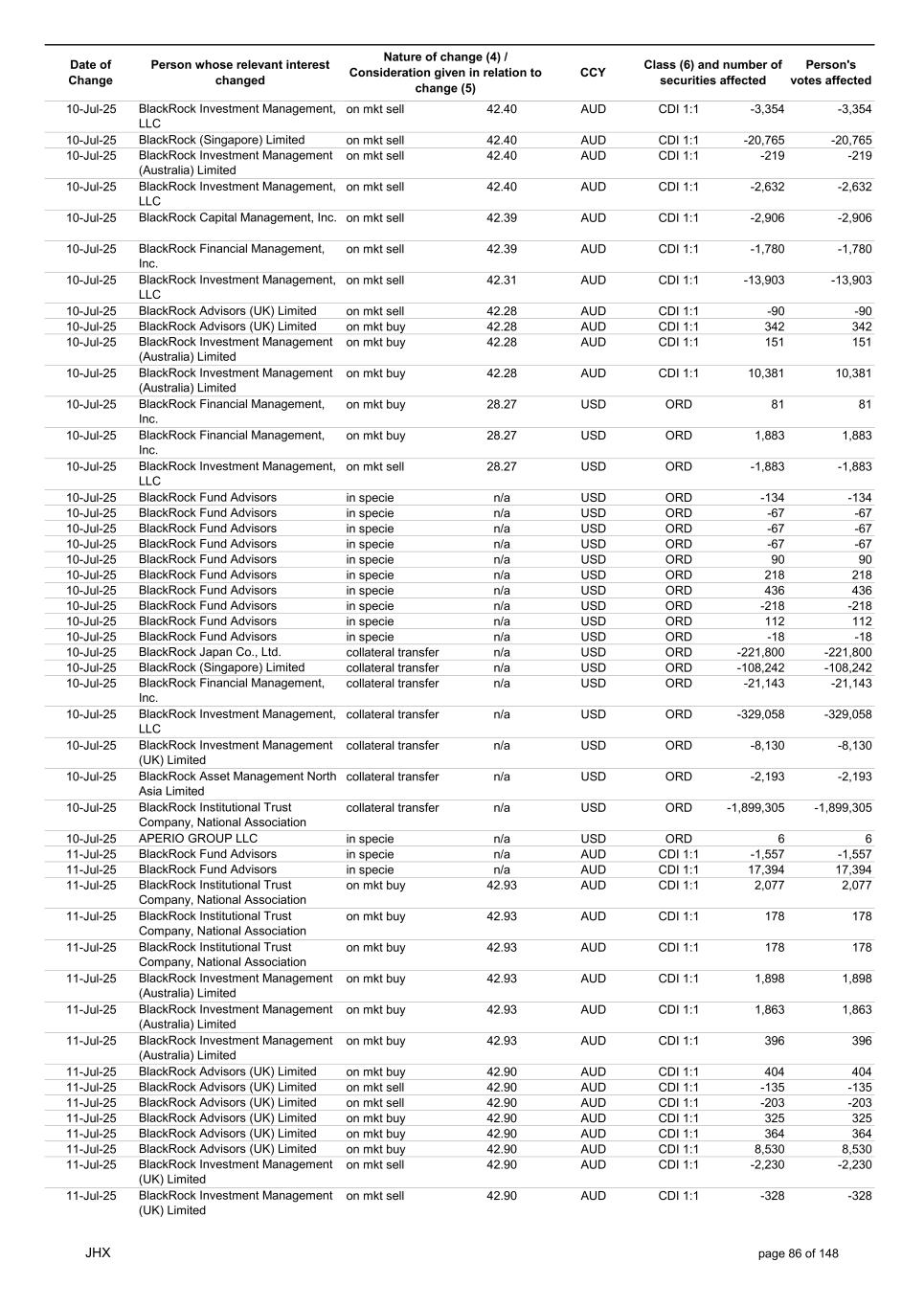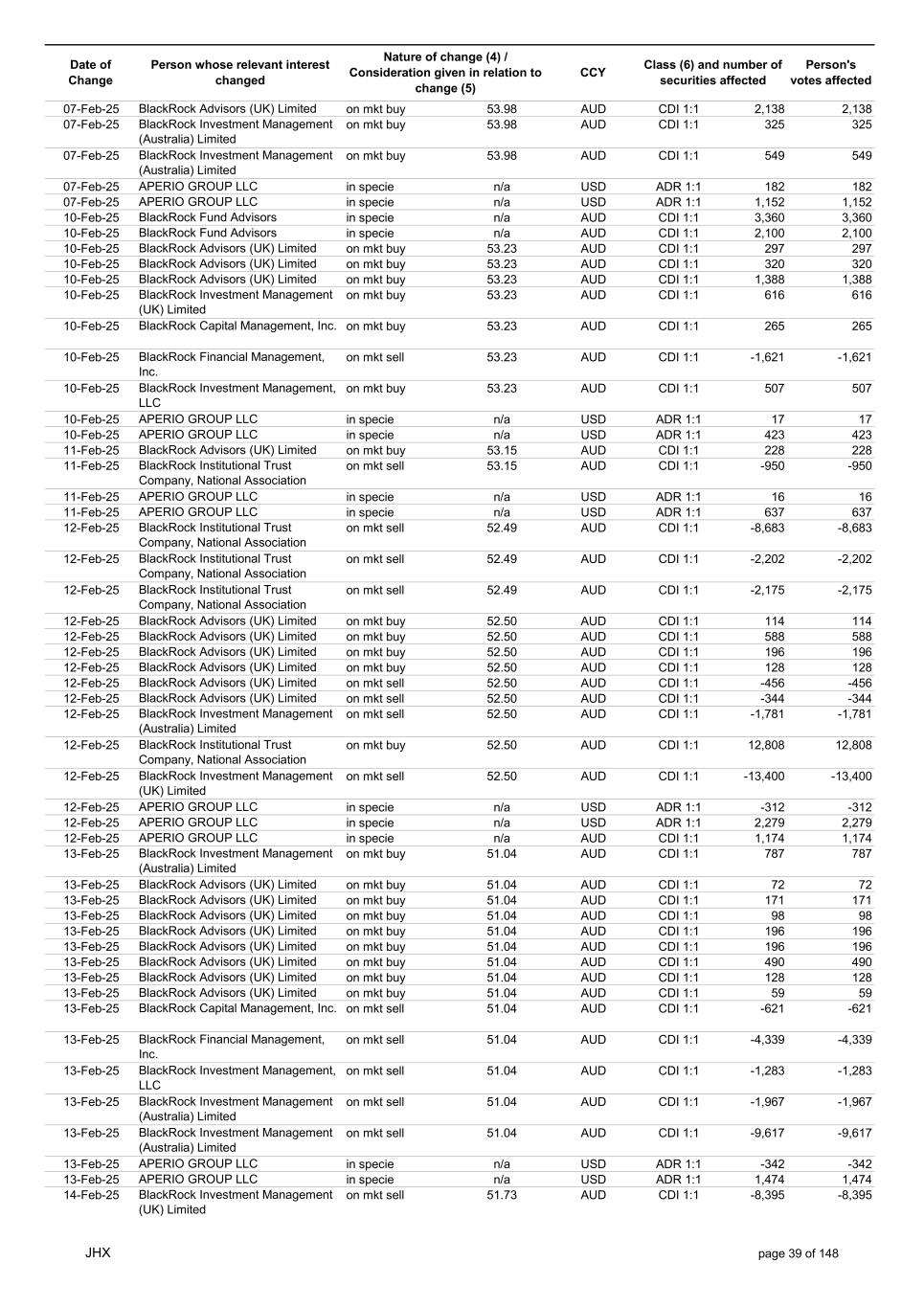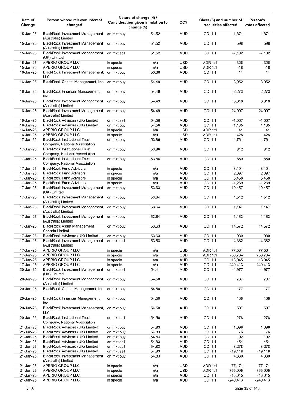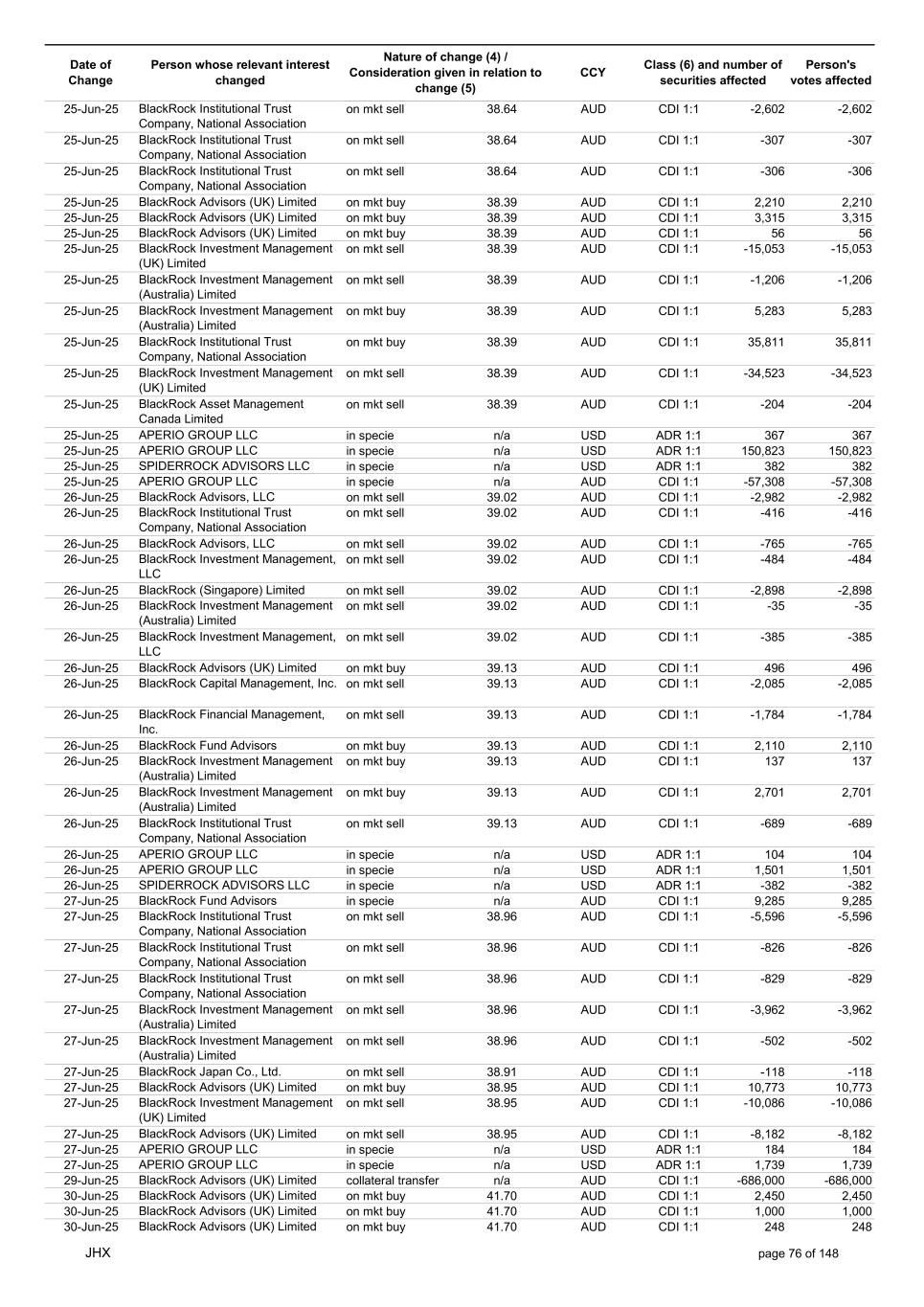 Date of Change Person whose relevant interest changed Nature of change (4) / Consideration given in relation to change (5) Class (6) and number of securities affected Person's votes affected CCY 20-Jun-25 BlackRock Investment Management, LLC on mkt sell 36.88 AUD CDI 1:1 -29,219 -29,219 20-Jun-25 BlackRock Investment Management (UK) Limited on mkt buy 36.88 AUD CDI 1:1 2,954 2,954 20-Jun-25 BlackRock Investment Management (UK) Limited on mkt buy 36.88 AUD CDI 1:1 12,706 12,706 20-Jun-25 BlackRock Investment Management (UK) Limited on mkt sell 36.88 AUD CDI 1:1 -1,224 -1,224 20-Jun-25 APERIO GROUP LLC in specie n/a USD ADR 1:1 -57,504 -57,504 20-Jun-25 APERIO GROUP LLC in specie n/a USD ADR 1:1 -714,219 -714,219 20-Jun-25 APERIO GROUP LLC in specie n/a AUD CDI 1:1 -13,045 -13,045 20-Jun-25 APERIO GROUP LLC in specie n/a AUD CDI 1:1 -183,704 -183,704 22-Jun-25 BlackRock Advisors (UK) Limited collateral transfer n/a AUD CDI 1:1 -686,000 -686,000 23-Jun-25 BlackRock Investment Management (UK) Limited on mkt sell 36.95 AUD CDI 1:1 -15,495 -15,495 23-Jun-25 BlackRock Investment Management, LLC on mkt buy 37.04 AUD CDI 1:1 1,045 1,045 23-Jun-25 BlackRock Investment Management (Australia) Limited on mkt sell 36.85 AUD CDI 1:1 -1,724 -1,724 23-Jun-25 BlackRock Advisors (UK) Limited on mkt sell 36.85 AUD CDI 1:1 -4,420 -4,420 23-Jun-25 BlackRock Advisors (UK) Limited on mkt sell 36.85 AUD CDI 1:1 -91 -91 23-Jun-25 BlackRock Capital Management, Inc. on mkt buy 36.85 AUD CDI 1:1 8,752 8,752 23-Jun-25 BlackRock Financial Management, Inc. on mkt buy 36.85 AUD CDI 1:1 4,340 4,340 23-Jun-25 BlackRock Asset Management Canada Limited on mkt buy 36.85 AUD CDI 1:1 233 233 23-Jun-25 BlackRock Advisors (UK) Limited collateral transfer n/a AUD CDI 1:1 461,097 461,097 23-Jun-25 APERIO GROUP LLC in specie n/a USD ADR 1:1 164 164 23-Jun-25 APERIO GROUP LLC in specie n/a USD ADR 1:1 -977 -977 24-Jun-25 BlackRock Advisors, LLC on mkt sell 37.89 AUD CDI 1:1 -3,056 -3,056 24-Jun-25 BlackRock Institutional Trust Company, National Association on mkt sell 37.89 AUD CDI 1:1 -426 -426 24-Jun-25 BlackRock Advisors, LLC on mkt sell 37.89 AUD CDI 1:1 -49 -49 24-Jun-25 BlackRock Advisors, LLC on mkt sell 37.89 AUD CDI 1:1 -782 -782 24-Jun-25 BlackRock Investment Management, LLC on mkt sell 37.89 AUD CDI 1:1 -496 -496 24-Jun-25 BlackRock Investment Management, LLC on mkt sell 37.99 AUD CDI 1:1 -1,593 -1,593 24-Jun-25 BlackRock (Singapore) Limited on mkt sell 37.89 AUD CDI 1:1 -2,970 -2,970 24-Jun-25 BlackRock Investment Management (Australia) Limited on mkt sell 37.89 AUD CDI 1:1 -35 -35 24-Jun-25 BlackRock Fund Advisors on mkt buy 37.99 AUD CDI 1:1 473 473 24-Jun-25 BlackRock Investment Management, LLC on mkt sell 37.89 AUD CDI 1:1 -393 -393 24-Jun-25 BlackRock Fund Advisors in specie n/a AUD CDI 1:1 -12,738 -12,738 24-Jun-25 BlackRock Advisors (UK) Limited on mkt sell 37.89 AUD CDI 1:1 -1,197 -1,197 24-Jun-25 BlackRock Advisors (UK) Limited on mkt buy 37.89 AUD CDI 1:1 1,180 1,180 24-Jun-25 BlackRock Advisors (UK) Limited on mkt sell 37.89 AUD CDI 1:1 -408 -408 24-Jun-25 BlackRock Advisors (UK) Limited on mkt sell 37.89 AUD CDI 1:1 -1,030 -1,030 24-Jun-25 BlackRock Asset Management Canada Limited on mkt buy 37.89 AUD CDI 1:1 206 206 24-Jun-25 BlackRock Advisors (UK) Limited on mkt buy 37.89 AUD CDI 1:1 229 229 24-Jun-25 BlackRock Institutional Trust Company, National Association on mkt buy 37.89 AUD CDI 1:1 33,796 33,796 24-Jun-25 BlackRock Advisors (UK) Limited collateral transfer n/a AUD CDI 1:1 224,903 224,903 24-Jun-25 APERIO GROUP LLC in specie n/a USD ADR 1:1 418 418 24-Jun-25 APERIO GROUP LLC in specie n/a USD ADR 1:1 2,134 2,134 25-Jun-25 BlackRock Fund Advisors in specie n/a AUD CDI 1:1 -11,842 -11,842 25-Jun-25 BlackRock Advisors, LLC on mkt sell 38.64 AUD CDI 1:1 -2,970 -2,970 25-Jun-25 BlackRock Institutional Trust Company, National Association on mkt sell 38.64 AUD CDI 1:1 -414 -414 25-Jun-25 BlackRock Advisors, LLC on mkt sell 38.64 AUD CDI 1:1 -35 -35 25-Jun-25 BlackRock Advisors, LLC on mkt sell 38.64 AUD CDI 1:1 -761 -761 25-Jun-25 BlackRock Investment Management, LLC on mkt sell 38.64 AUD CDI 1:1 -481 -481 25-Jun-25 BlackRock (Singapore) Limited on mkt sell 38.64 AUD CDI 1:1 -2,887 -2,887 25-Jun-25 BlackRock Investment Management (Australia) Limited on mkt sell 38.64 AUD CDI 1:1 -35 -35 25-Jun-25 BlackRock Investment Management, LLC on mkt sell 38.64 AUD CDI 1:1 -382 -382 25-Jun-25 BlackRock Fund Advisors in specie n/a AUD CDI 1:1 885 885 JHX page 75 of 148