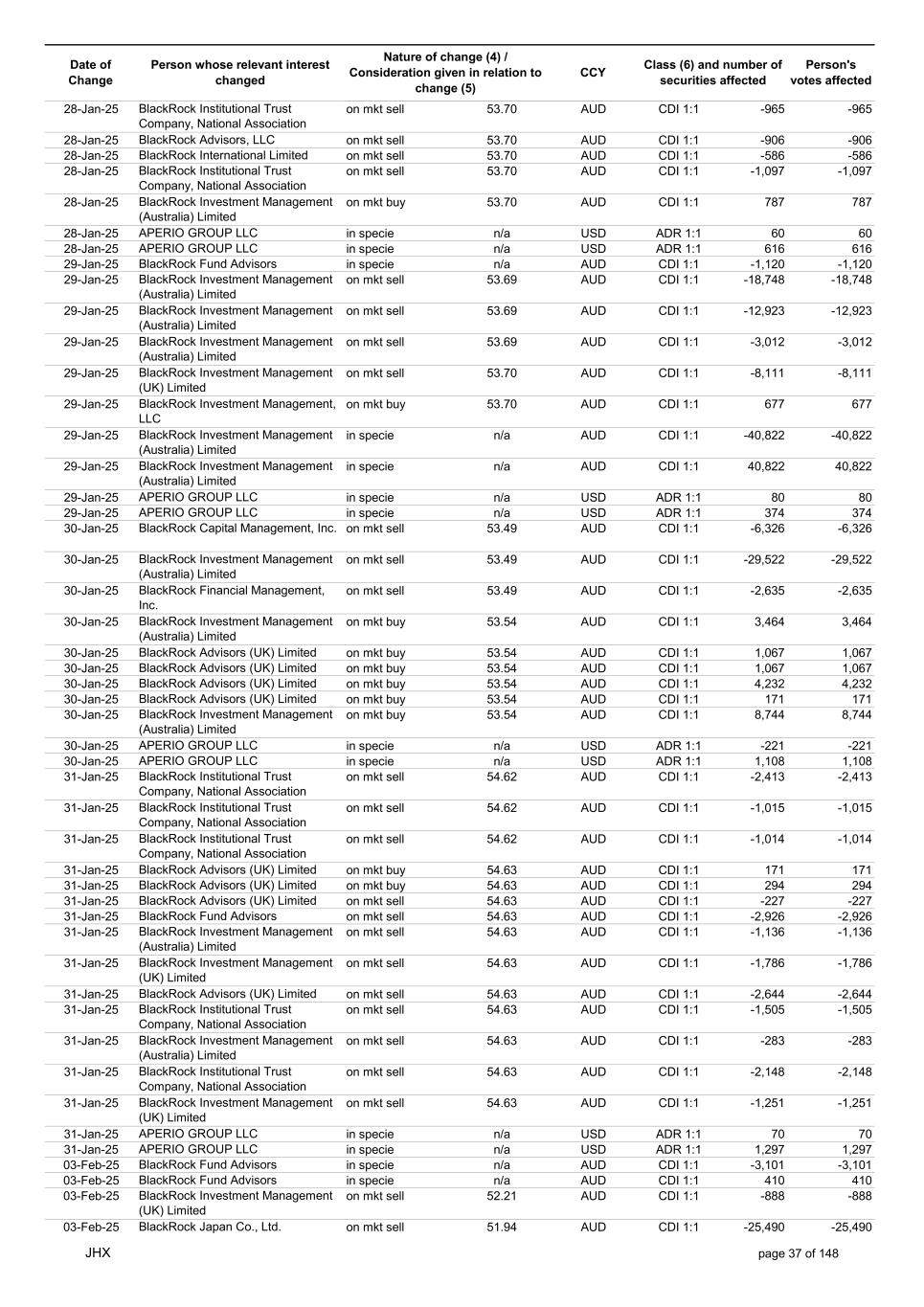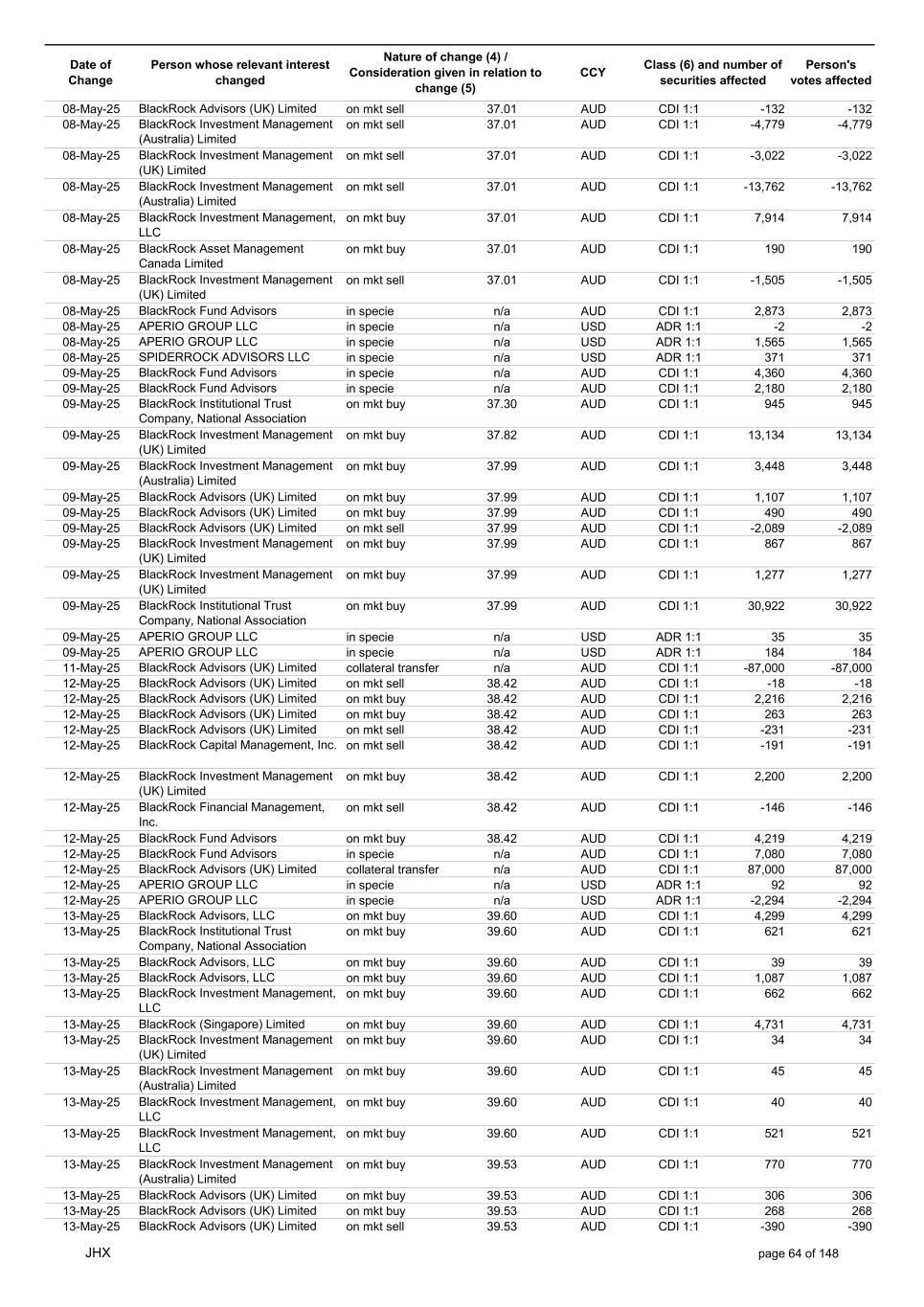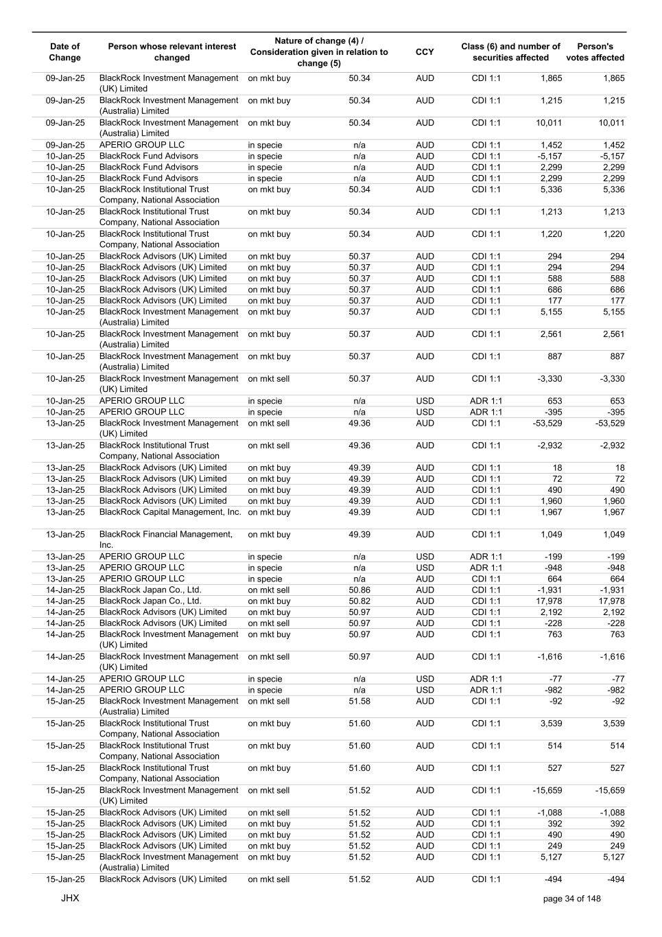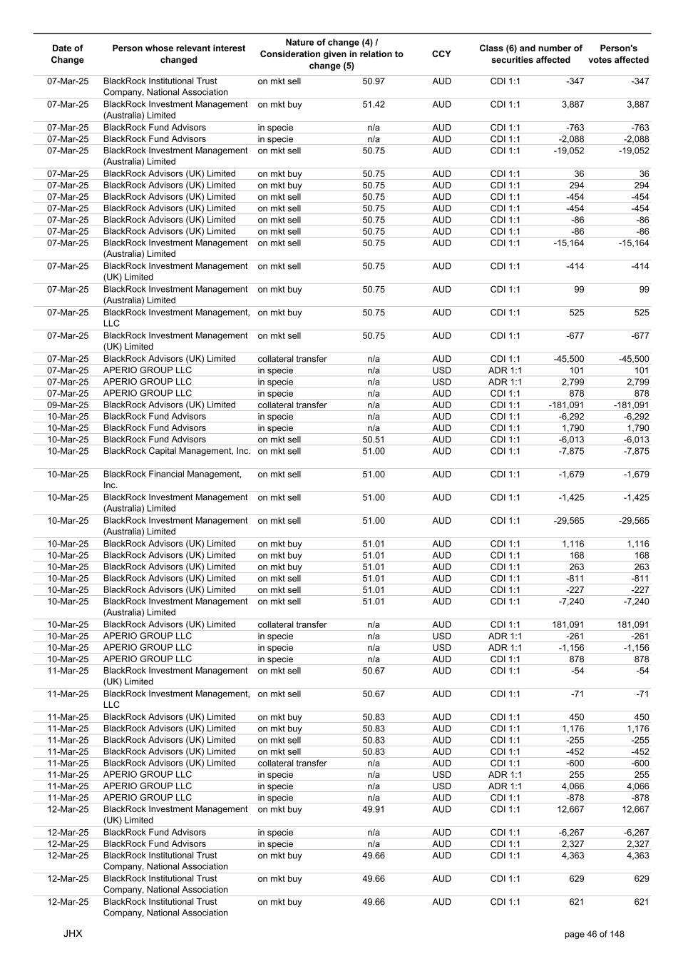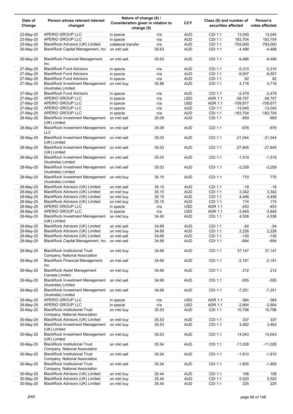 Date of Change Person whose relevant interest changed Nature of change (4) / Consideration given in relation to change (5) Class (6) and number of securities affected Person's votes affected CCY 20-Jun-25 BlackRock Investment Management, LLC on mkt sell 36.88 AUD CDI 1:1 -29,219 -29,219 20-Jun-25 BlackRock Investment Management (UK) Limited on mkt buy 36.88 AUD CDI 1:1 2,954 2,954 20-Jun-25 BlackRock Investment Management (UK) Limited on mkt buy 36.88 AUD CDI 1:1 12,706 12,706 20-Jun-25 BlackRock Investment Management (UK) Limited on mkt sell 36.88 AUD CDI 1:1 -1,224 -1,224 20-Jun-25 APERIO GROUP LLC in specie n/a USD ADR 1:1 -57,504 -57,504 20-Jun-25 APERIO GROUP LLC in specie n/a USD ADR 1:1 -714,219 -714,219 20-Jun-25 APERIO GROUP LLC in specie n/a AUD CDI 1:1 -13,045 -13,045 20-Jun-25 APERIO GROUP LLC in specie n/a AUD CDI 1:1 -183,704 -183,704 22-Jun-25 BlackRock Advisors (UK) Limited collateral transfer n/a AUD CDI 1:1 -686,000 -686,000 23-Jun-25 BlackRock Investment Management (UK) Limited on mkt sell 36.95 AUD CDI 1:1 -15,495 -15,495 23-Jun-25 BlackRock Investment Management, LLC on mkt buy 37.04 AUD CDI 1:1 1,045 1,045 23-Jun-25 BlackRock Investment Management (Australia) Limited on mkt sell 36.85 AUD CDI 1:1 -1,724 -1,724 23-Jun-25 BlackRock Advisors (UK) Limited on mkt sell 36.85 AUD CDI 1:1 -4,420 -4,420 23-Jun-25 BlackRock Advisors (UK) Limited on mkt sell 36.85 AUD CDI 1:1 -91 -91 23-Jun-25 BlackRock Capital Management, Inc. on mkt buy 36.85 AUD CDI 1:1 8,752 8,752 23-Jun-25 BlackRock Financial Management, Inc. on mkt buy 36.85 AUD CDI 1:1 4,340 4,340 23-Jun-25 BlackRock Asset Management Canada Limited on mkt buy 36.85 AUD CDI 1:1 233 233 23-Jun-25 BlackRock Advisors (UK) Limited collateral transfer n/a AUD CDI 1:1 461,097 461,097 23-Jun-25 APERIO GROUP LLC in specie n/a USD ADR 1:1 164 164 23-Jun-25 APERIO GROUP LLC in specie n/a USD ADR 1:1 -977 -977 24-Jun-25 BlackRock Advisors, LLC on mkt sell 37.89 AUD CDI 1:1 -3,056 -3,056 24-Jun-25 BlackRock Institutional Trust Company, National Association on mkt sell 37.89 AUD CDI 1:1 -426 -426 24-Jun-25 BlackRock Advisors, LLC on mkt sell 37.89 AUD CDI 1:1 -49 -49 24-Jun-25 BlackRock Advisors, LLC on mkt sell 37.89 AUD CDI 1:1 -782 -782 24-Jun-25 BlackRock Investment Management, LLC on mkt sell 37.89 AUD CDI 1:1 -496 -496 24-Jun-25 BlackRock Investment Management, LLC on mkt sell 37.99 AUD CDI 1:1 -1,593 -1,593 24-Jun-25 BlackRock (Singapore) Limited on mkt sell 37.89 AUD CDI 1:1 -2,970 -2,970 24-Jun-25 BlackRock Investment Management (Australia) Limited on mkt sell 37.89 AUD CDI 1:1 -35 -35 24-Jun-25 BlackRock Fund Advisors on mkt buy 37.99 AUD CDI 1:1 473 473 24-Jun-25 BlackRock Investment Management, LLC on mkt sell 37.89 AUD CDI 1:1 -393 -393 24-Jun-25 BlackRock Fund Advisors in specie n/a AUD CDI 1:1 -12,738 -12,738 24-Jun-25 BlackRock Advisors (UK) Limited on mkt sell 37.89 AUD CDI 1:1 -1,197 -1,197 24-Jun-25 BlackRock Advisors (UK) Limited on mkt buy 37.89 AUD CDI 1:1 1,180 1,180 24-Jun-25 BlackRock Advisors (UK) Limited on mkt sell 37.89 AUD CDI 1:1 -408 -408 24-Jun-25 BlackRock Advisors (UK) Limited on mkt sell 37.89 AUD CDI 1:1 -1,030 -1,030 24-Jun-25 BlackRock Asset Management Canada Limited on mkt buy 37.89 AUD CDI 1:1 206 206 24-Jun-25 BlackRock Advisors (UK) Limited on mkt buy 37.89 AUD CDI 1:1 229 229 24-Jun-25 BlackRock Institutional Trust Company, National Association on mkt buy 37.89 AUD CDI 1:1 33,796 33,796 24-Jun-25 BlackRock Advisors (UK) Limited collateral transfer n/a AUD CDI 1:1 224,903 224,903 24-Jun-25 APERIO GROUP LLC in specie n/a USD ADR 1:1 418 418 24-Jun-25 APERIO GROUP LLC in specie n/a USD ADR 1:1 2,134 2,134 25-Jun-25 BlackRock Fund Advisors in specie n/a AUD CDI 1:1 -11,842 -11,842 25-Jun-25 BlackRock Advisors, LLC on mkt sell 38.64 AUD CDI 1:1 -2,970 -2,970 25-Jun-25 BlackRock Institutional Trust Company, National Association on mkt sell 38.64 AUD CDI 1:1 -414 -414 25-Jun-25 BlackRock Advisors, LLC on mkt sell 38.64 AUD CDI 1:1 -35 -35 25-Jun-25 BlackRock Advisors, LLC on mkt sell 38.64 AUD CDI 1:1 -761 -761 25-Jun-25 BlackRock Investment Management, LLC on mkt sell 38.64 AUD CDI 1:1 -481 -481 25-Jun-25 BlackRock (Singapore) Limited on mkt sell 38.64 AUD CDI 1:1 -2,887 -2,887 25-Jun-25 BlackRock Investment Management (Australia) Limited on mkt sell 38.64 AUD CDI 1:1 -35 -35 25-Jun-25 BlackRock Investment Management, LLC on mkt sell 38.64 AUD CDI 1:1 -382 -382 25-Jun-25 BlackRock Fund Advisors in specie n/a AUD CDI 1:1 885 885 JHX page 75 of 148