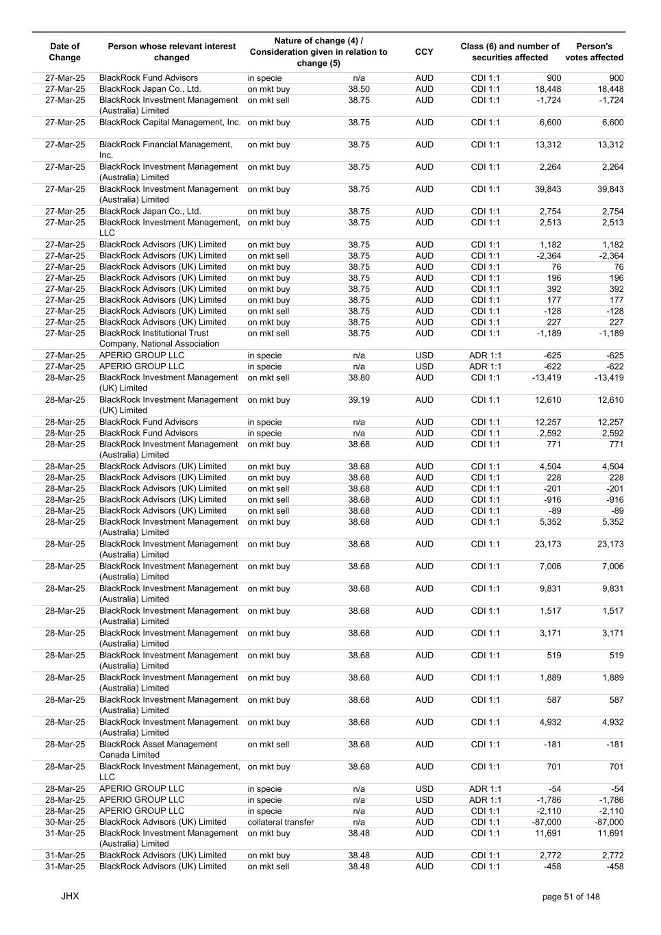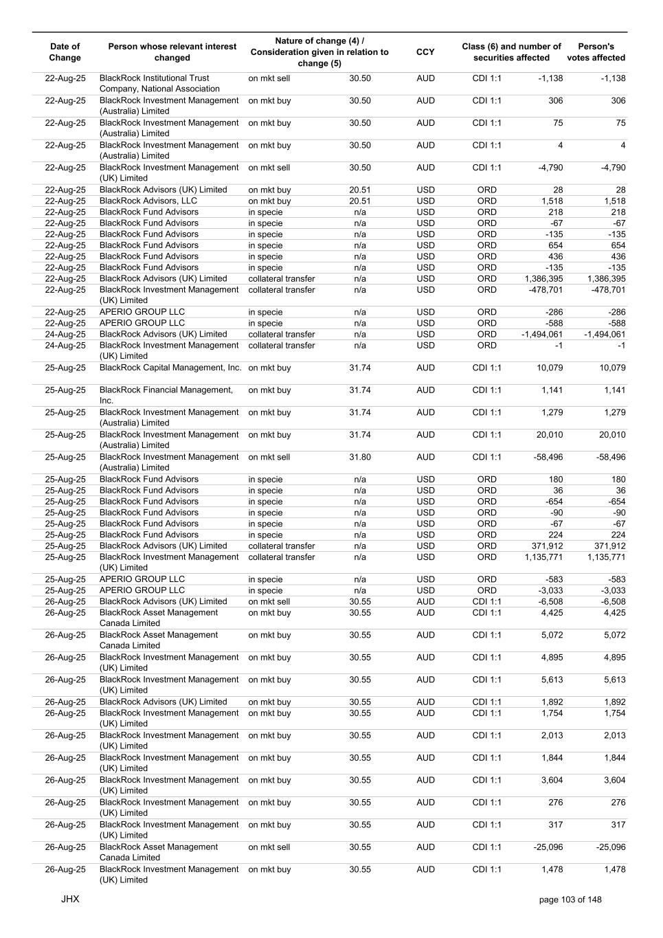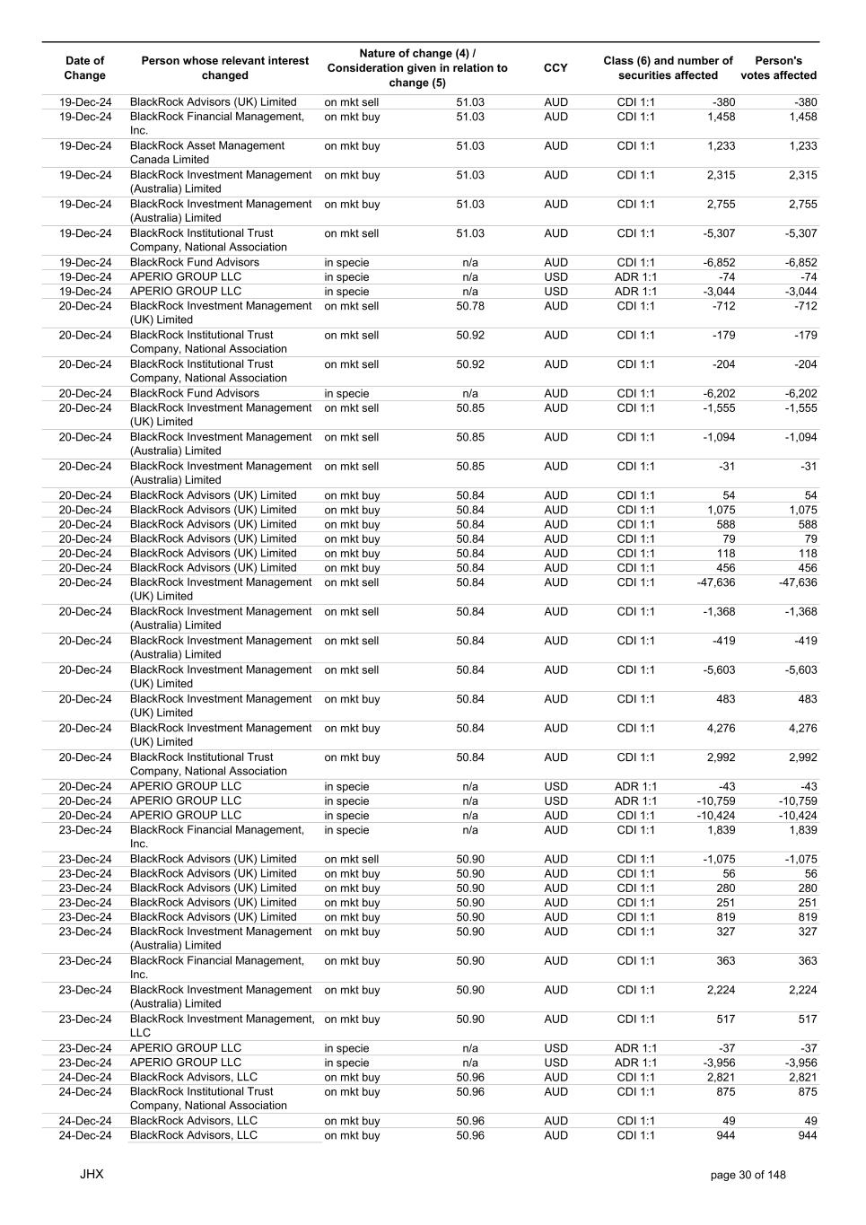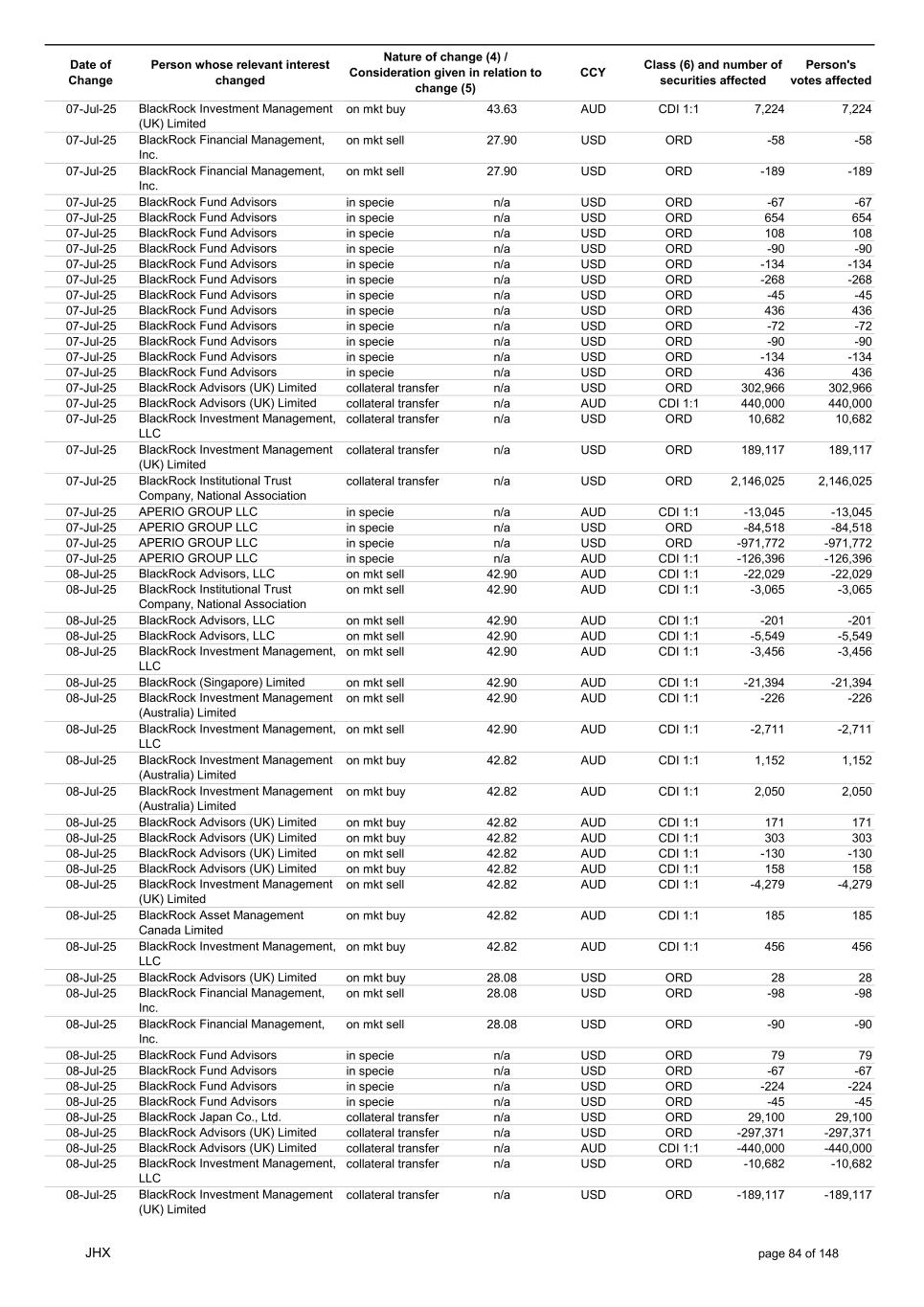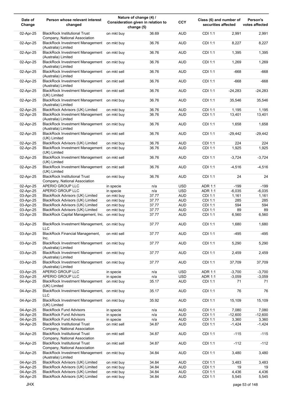 Date of Change Person whose relevant interest changed Nature of change (4) / Consideration given in relation to change (5) Class (6) and number of securities affected Person's votes affected CCY 20-Jun-25 BlackRock Investment Management, LLC on mkt sell 36.88 AUD CDI 1:1 -29,219 -29,219 20-Jun-25 BlackRock Investment Management (UK) Limited on mkt buy 36.88 AUD CDI 1:1 2,954 2,954 20-Jun-25 BlackRock Investment Management (UK) Limited on mkt buy 36.88 AUD CDI 1:1 12,706 12,706 20-Jun-25 BlackRock Investment Management (UK) Limited on mkt sell 36.88 AUD CDI 1:1 -1,224 -1,224 20-Jun-25 APERIO GROUP LLC in specie n/a USD ADR 1:1 -57,504 -57,504 20-Jun-25 APERIO GROUP LLC in specie n/a USD ADR 1:1 -714,219 -714,219 20-Jun-25 APERIO GROUP LLC in specie n/a AUD CDI 1:1 -13,045 -13,045 20-Jun-25 APERIO GROUP LLC in specie n/a AUD CDI 1:1 -183,704 -183,704 22-Jun-25 BlackRock Advisors (UK) Limited collateral transfer n/a AUD CDI 1:1 -686,000 -686,000 23-Jun-25 BlackRock Investment Management (UK) Limited on mkt sell 36.95 AUD CDI 1:1 -15,495 -15,495 23-Jun-25 BlackRock Investment Management, LLC on mkt buy 37.04 AUD CDI 1:1 1,045 1,045 23-Jun-25 BlackRock Investment Management (Australia) Limited on mkt sell 36.85 AUD CDI 1:1 -1,724 -1,724 23-Jun-25 BlackRock Advisors (UK) Limited on mkt sell 36.85 AUD CDI 1:1 -4,420 -4,420 23-Jun-25 BlackRock Advisors (UK) Limited on mkt sell 36.85 AUD CDI 1:1 -91 -91 23-Jun-25 BlackRock Capital Management, Inc. on mkt buy 36.85 AUD CDI 1:1 8,752 8,752 23-Jun-25 BlackRock Financial Management, Inc. on mkt buy 36.85 AUD CDI 1:1 4,340 4,340 23-Jun-25 BlackRock Asset Management Canada Limited on mkt buy 36.85 AUD CDI 1:1 233 233 23-Jun-25 BlackRock Advisors (UK) Limited collateral transfer n/a AUD CDI 1:1 461,097 461,097 23-Jun-25 APERIO GROUP LLC in specie n/a USD ADR 1:1 164 164 23-Jun-25 APERIO GROUP LLC in specie n/a USD ADR 1:1 -977 -977 24-Jun-25 BlackRock Advisors, LLC on mkt sell 37.89 AUD CDI 1:1 -3,056 -3,056 24-Jun-25 BlackRock Institutional Trust Company, National Association on mkt sell 37.89 AUD CDI 1:1 -426 -426 24-Jun-25 BlackRock Advisors, LLC on mkt sell 37.89 AUD CDI 1:1 -49 -49 24-Jun-25 BlackRock Advisors, LLC on mkt sell 37.89 AUD CDI 1:1 -782 -782 24-Jun-25 BlackRock Investment Management, LLC on mkt sell 37.89 AUD CDI 1:1 -496 -496 24-Jun-25 BlackRock Investment Management, LLC on mkt sell 37.99 AUD CDI 1:1 -1,593 -1,593 24-Jun-25 BlackRock (Singapore) Limited on mkt sell 37.89 AUD CDI 1:1 -2,970 -2,970 24-Jun-25 BlackRock Investment Management (Australia) Limited on mkt sell 37.89 AUD CDI 1:1 -35 -35 24-Jun-25 BlackRock Fund Advisors on mkt buy 37.99 AUD CDI 1:1 473 473 24-Jun-25 BlackRock Investment Management, LLC on mkt sell 37.89 AUD CDI 1:1 -393 -393 24-Jun-25 BlackRock Fund Advisors in specie n/a AUD CDI 1:1 -12,738 -12,738 24-Jun-25 BlackRock Advisors (UK) Limited on mkt sell 37.89 AUD CDI 1:1 -1,197 -1,197 24-Jun-25 BlackRock Advisors (UK) Limited on mkt buy 37.89 AUD CDI 1:1 1,180 1,180 24-Jun-25 BlackRock Advisors (UK) Limited on mkt sell 37.89 AUD CDI 1:1 -408 -408 24-Jun-25 BlackRock Advisors (UK) Limited on mkt sell 37.89 AUD CDI 1:1 -1,030 -1,030 24-Jun-25 BlackRock Asset Management Canada Limited on mkt buy 37.89 AUD CDI 1:1 206 206 24-Jun-25 BlackRock Advisors (UK) Limited on mkt buy 37.89 AUD CDI 1:1 229 229 24-Jun-25 BlackRock Institutional Trust Company, National Association on mkt buy 37.89 AUD CDI 1:1 33,796 33,796 24-Jun-25 BlackRock Advisors (UK) Limited collateral transfer n/a AUD CDI 1:1 224,903 224,903 24-Jun-25 APERIO GROUP LLC in specie n/a USD ADR 1:1 418 418 24-Jun-25 APERIO GROUP LLC in specie n/a USD ADR 1:1 2,134 2,134 25-Jun-25 BlackRock Fund Advisors in specie n/a AUD CDI 1:1 -11,842 -11,842 25-Jun-25 BlackRock Advisors, LLC on mkt sell 38.64 AUD CDI 1:1 -2,970 -2,970 25-Jun-25 BlackRock Institutional Trust Company, National Association on mkt sell 38.64 AUD CDI 1:1 -414 -414 25-Jun-25 BlackRock Advisors, LLC on mkt sell 38.64 AUD CDI 1:1 -35 -35 25-Jun-25 BlackRock Advisors, LLC on mkt sell 38.64 AUD CDI 1:1 -761 -761 25-Jun-25 BlackRock Investment Management, LLC on mkt sell 38.64 AUD CDI 1:1 -481 -481 25-Jun-25 BlackRock (Singapore) Limited on mkt sell 38.64 AUD CDI 1:1 -2,887 -2,887 25-Jun-25 BlackRock Investment Management (Australia) Limited on mkt sell 38.64 AUD CDI 1:1 -35 -35 25-Jun-25 BlackRock Investment Management, LLC on mkt sell 38.64 AUD CDI 1:1 -382 -382 25-Jun-25 BlackRock Fund Advisors in specie n/a AUD CDI 1:1 885 885 JHX page 75 of 148