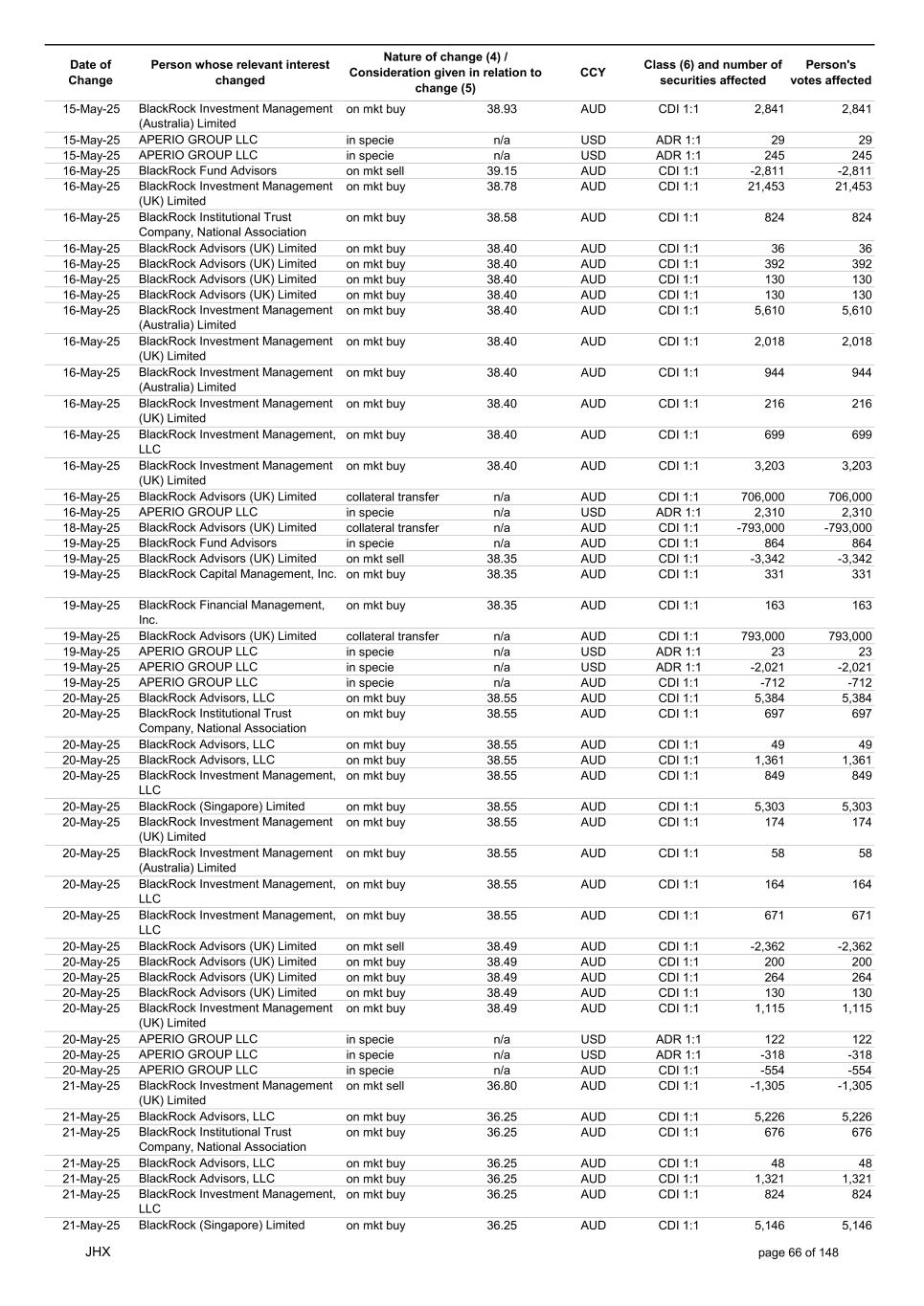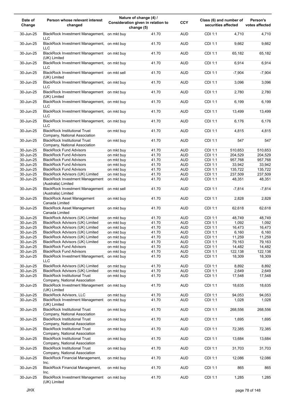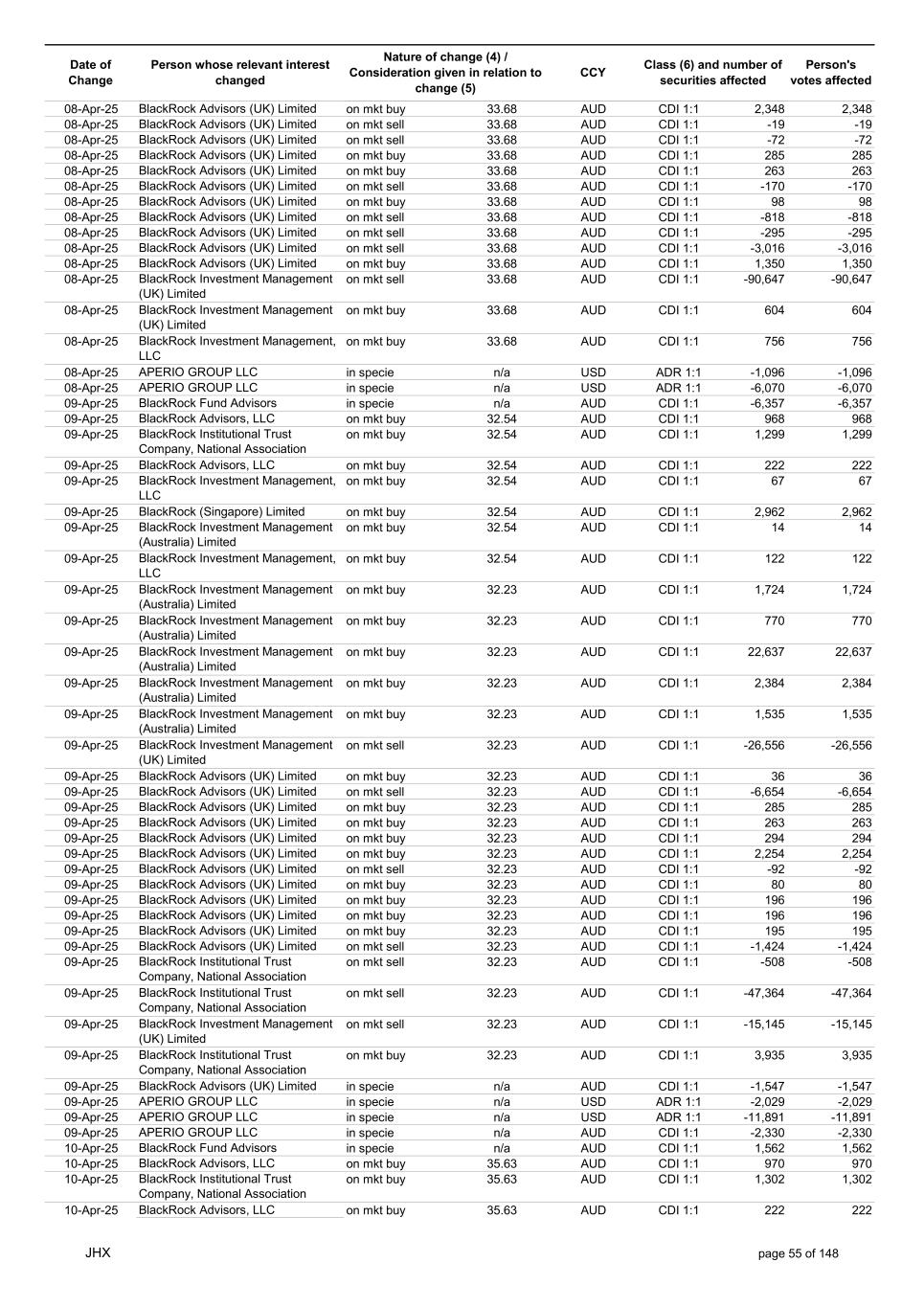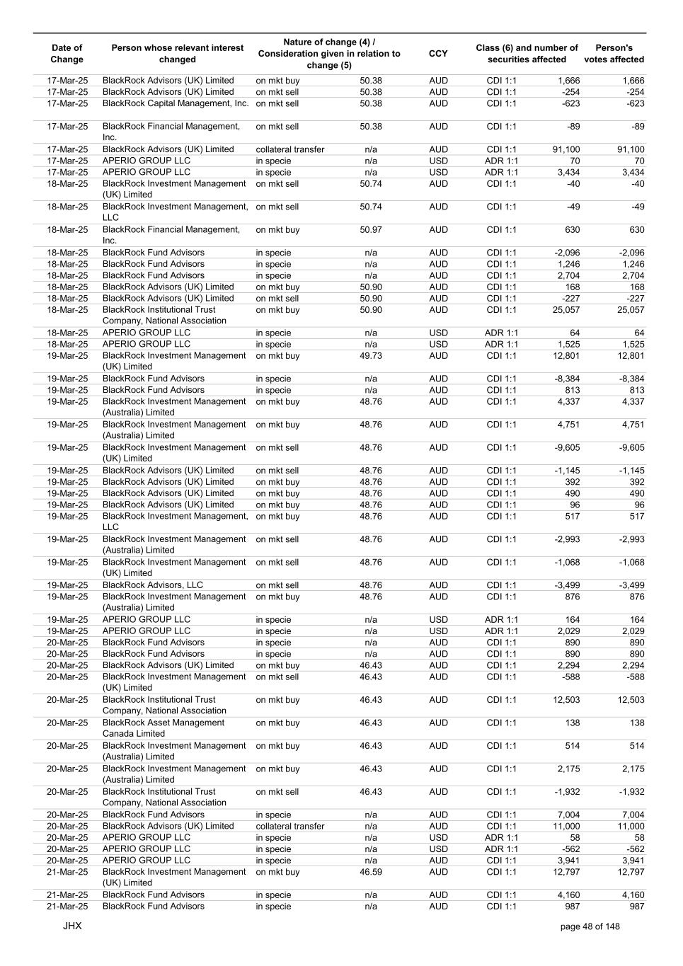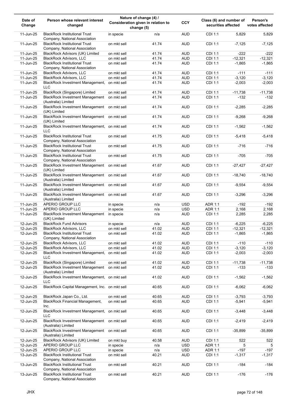 Date of Change Person whose relevant interest changed Nature of change (4) / Consideration given in relation to change (5) Class (6) and number of securities affected Person's votes affected CCY 20-Jun-25 BlackRock Investment Management, LLC on mkt sell 36.88 AUD CDI 1:1 -29,219 -29,219 20-Jun-25 BlackRock Investment Management (UK) Limited on mkt buy 36.88 AUD CDI 1:1 2,954 2,954 20-Jun-25 BlackRock Investment Management (UK) Limited on mkt buy 36.88 AUD CDI 1:1 12,706 12,706 20-Jun-25 BlackRock Investment Management (UK) Limited on mkt sell 36.88 AUD CDI 1:1 -1,224 -1,224 20-Jun-25 APERIO GROUP LLC in specie n/a USD ADR 1:1 -57,504 -57,504 20-Jun-25 APERIO GROUP LLC in specie n/a USD ADR 1:1 -714,219 -714,219 20-Jun-25 APERIO GROUP LLC in specie n/a AUD CDI 1:1 -13,045 -13,045 20-Jun-25 APERIO GROUP LLC in specie n/a AUD CDI 1:1 -183,704 -183,704 22-Jun-25 BlackRock Advisors (UK) Limited collateral transfer n/a AUD CDI 1:1 -686,000 -686,000 23-Jun-25 BlackRock Investment Management (UK) Limited on mkt sell 36.95 AUD CDI 1:1 -15,495 -15,495 23-Jun-25 BlackRock Investment Management, LLC on mkt buy 37.04 AUD CDI 1:1 1,045 1,045 23-Jun-25 BlackRock Investment Management (Australia) Limited on mkt sell 36.85 AUD CDI 1:1 -1,724 -1,724 23-Jun-25 BlackRock Advisors (UK) Limited on mkt sell 36.85 AUD CDI 1:1 -4,420 -4,420 23-Jun-25 BlackRock Advisors (UK) Limited on mkt sell 36.85 AUD CDI 1:1 -91 -91 23-Jun-25 BlackRock Capital Management, Inc. on mkt buy 36.85 AUD CDI 1:1 8,752 8,752 23-Jun-25 BlackRock Financial Management, Inc. on mkt buy 36.85 AUD CDI 1:1 4,340 4,340 23-Jun-25 BlackRock Asset Management Canada Limited on mkt buy 36.85 AUD CDI 1:1 233 233 23-Jun-25 BlackRock Advisors (UK) Limited collateral transfer n/a AUD CDI 1:1 461,097 461,097 23-Jun-25 APERIO GROUP LLC in specie n/a USD ADR 1:1 164 164 23-Jun-25 APERIO GROUP LLC in specie n/a USD ADR 1:1 -977 -977 24-Jun-25 BlackRock Advisors, LLC on mkt sell 37.89 AUD CDI 1:1 -3,056 -3,056 24-Jun-25 BlackRock Institutional Trust Company, National Association on mkt sell 37.89 AUD CDI 1:1 -426 -426 24-Jun-25 BlackRock Advisors, LLC on mkt sell 37.89 AUD CDI 1:1 -49 -49 24-Jun-25 BlackRock Advisors, LLC on mkt sell 37.89 AUD CDI 1:1 -782 -782 24-Jun-25 BlackRock Investment Management, LLC on mkt sell 37.89 AUD CDI 1:1 -496 -496 24-Jun-25 BlackRock Investment Management, LLC on mkt sell 37.99 AUD CDI 1:1 -1,593 -1,593 24-Jun-25 BlackRock (Singapore) Limited on mkt sell 37.89 AUD CDI 1:1 -2,970 -2,970 24-Jun-25 BlackRock Investment Management (Australia) Limited on mkt sell 37.89 AUD CDI 1:1 -35 -35 24-Jun-25 BlackRock Fund Advisors on mkt buy 37.99 AUD CDI 1:1 473 473 24-Jun-25 BlackRock Investment Management, LLC on mkt sell 37.89 AUD CDI 1:1 -393 -393 24-Jun-25 BlackRock Fund Advisors in specie n/a AUD CDI 1:1 -12,738 -12,738 24-Jun-25 BlackRock Advisors (UK) Limited on mkt sell 37.89 AUD CDI 1:1 -1,197 -1,197 24-Jun-25 BlackRock Advisors (UK) Limited on mkt buy 37.89 AUD CDI 1:1 1,180 1,180 24-Jun-25 BlackRock Advisors (UK) Limited on mkt sell 37.89 AUD CDI 1:1 -408 -408 24-Jun-25 BlackRock Advisors (UK) Limited on mkt sell 37.89 AUD CDI 1:1 -1,030 -1,030 24-Jun-25 BlackRock Asset Management Canada Limited on mkt buy 37.89 AUD CDI 1:1 206 206 24-Jun-25 BlackRock Advisors (UK) Limited on mkt buy 37.89 AUD CDI 1:1 229 229 24-Jun-25 BlackRock Institutional Trust Company, National Association on mkt buy 37.89 AUD CDI 1:1 33,796 33,796 24-Jun-25 BlackRock Advisors (UK) Limited collateral transfer n/a AUD CDI 1:1 224,903 224,903 24-Jun-25 APERIO GROUP LLC in specie n/a USD ADR 1:1 418 418 24-Jun-25 APERIO GROUP LLC in specie n/a USD ADR 1:1 2,134 2,134 25-Jun-25 BlackRock Fund Advisors in specie n/a AUD CDI 1:1 -11,842 -11,842 25-Jun-25 BlackRock Advisors, LLC on mkt sell 38.64 AUD CDI 1:1 -2,970 -2,970 25-Jun-25 BlackRock Institutional Trust Company, National Association on mkt sell 38.64 AUD CDI 1:1 -414 -414 25-Jun-25 BlackRock Advisors, LLC on mkt sell 38.64 AUD CDI 1:1 -35 -35 25-Jun-25 BlackRock Advisors, LLC on mkt sell 38.64 AUD CDI 1:1 -761 -761 25-Jun-25 BlackRock Investment Management, LLC on mkt sell 38.64 AUD CDI 1:1 -481 -481 25-Jun-25 BlackRock (Singapore) Limited on mkt sell 38.64 AUD CDI 1:1 -2,887 -2,887 25-Jun-25 BlackRock Investment Management (Australia) Limited on mkt sell 38.64 AUD CDI 1:1 -35 -35 25-Jun-25 BlackRock Investment Management, LLC on mkt sell 38.64 AUD CDI 1:1 -382 -382 25-Jun-25 BlackRock Fund Advisors in specie n/a AUD CDI 1:1 885 885 JHX page 75 of 148