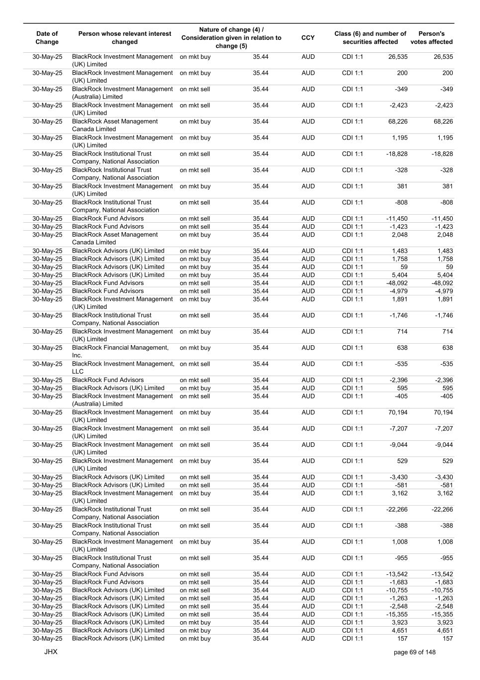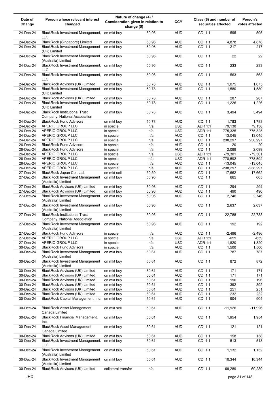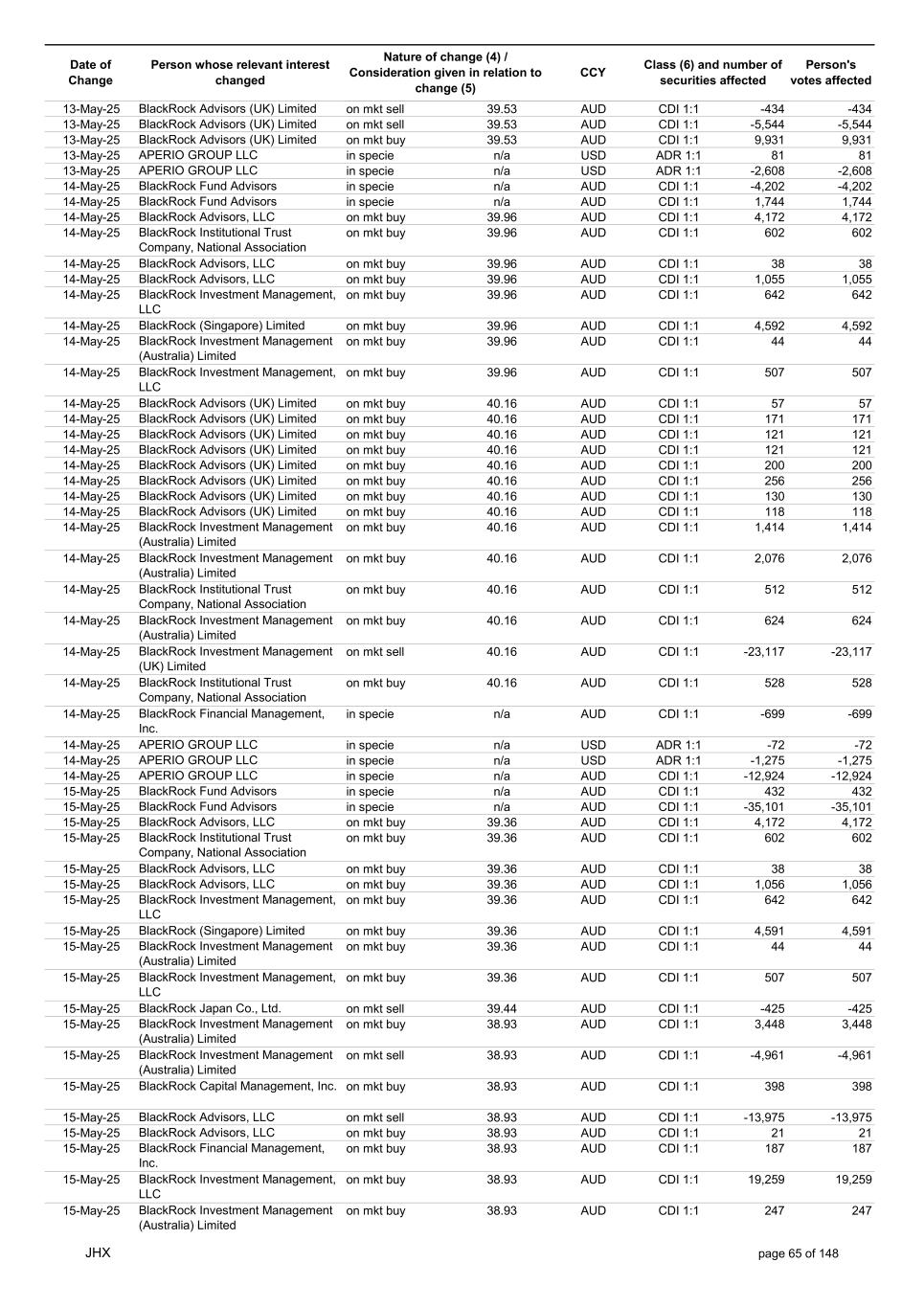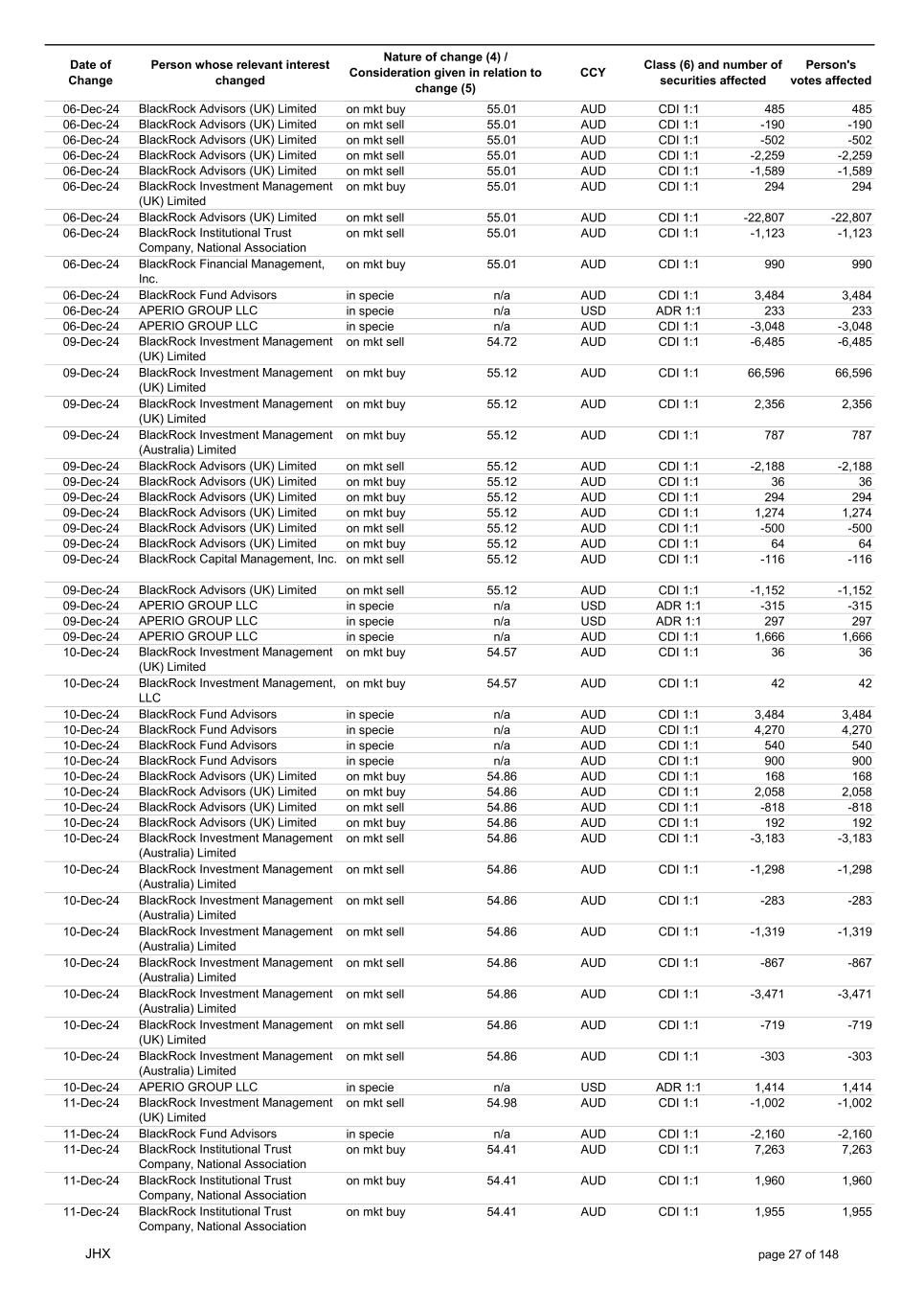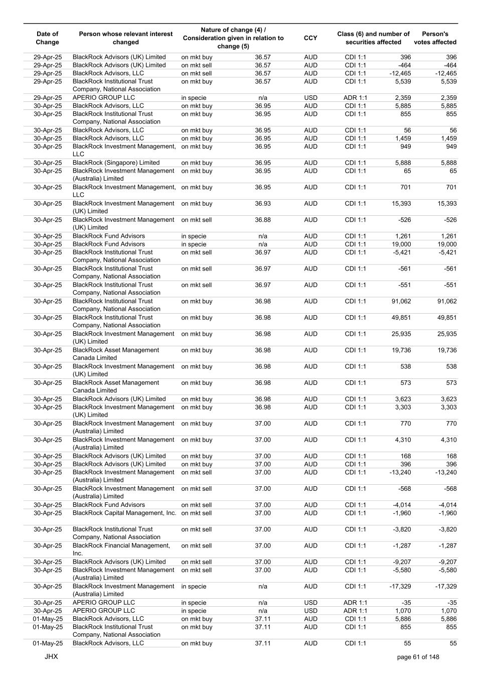Date of Change Person whose relevant interest changed Nature of change (4) / Consideration given in relation to change (5) Class (6) and number of securities affected Person's votes affected CCY 20-Jun-25 BlackRock Investment Management, LLC on mkt sell 36.88 AUD CDI 1:1 -29,219 -29,219 20-Jun-25 BlackRock Investment Management (UK) Limited on mkt buy 36.88 AUD CDI 1:1 2,954 2,954 20-Jun-25 BlackRock Investment Management (UK) Limited on mkt buy 36.88 AUD CDI 1:1 12,706 12,706 20-Jun-25 BlackRock Investment Management (UK) Limited on mkt sell 36.88 AUD CDI 1:1 -1,224 -1,224 20-Jun-25 APERIO GROUP LLC in specie n/a USD ADR 1:1 -57,504 -57,504 20-Jun-25 APERIO GROUP LLC in specie n/a USD ADR 1:1 -714,219 -714,219 20-Jun-25 APERIO GROUP LLC in specie n/a AUD CDI 1:1 -13,045 -13,045 20-Jun-25 APERIO GROUP LLC in specie n/a AUD CDI 1:1 -183,704 -183,704 22-Jun-25 BlackRock Advisors (UK) Limited collateral transfer n/a AUD CDI 1:1 -686,000 -686,000 23-Jun-25 BlackRock Investment Management (UK) Limited on mkt sell 36.95 AUD CDI 1:1 -15,495 -15,495 23-Jun-25 BlackRock Investment Management, LLC on mkt buy 37.04 AUD CDI 1:1 1,045 1,045 23-Jun-25 BlackRock Investment Management (Australia) Limited on mkt sell 36.85 AUD CDI 1:1 -1,724 -1,724 23-Jun-25 BlackRock Advisors (UK) Limited on mkt sell 36.85 AUD CDI 1:1 -4,420 -4,420 23-Jun-25 BlackRock Advisors (UK) Limited on mkt sell 36.85 AUD CDI 1:1 -91 -91 23-Jun-25 BlackRock Capital Management, Inc. on mkt buy 36.85 AUD CDI 1:1 8,752 8,752 23-Jun-25 BlackRock Financial Management, Inc. on mkt buy 36.85 AUD CDI 1:1 4,340 4,340 23-Jun-25 BlackRock Asset Management Canada Limited on mkt buy 36.85 AUD CDI 1:1 233 233 23-Jun-25 BlackRock Advisors (UK) Limited collateral transfer n/a AUD CDI 1:1 461,097 461,097 23-Jun-25 APERIO GROUP LLC in specie n/a USD ADR 1:1 164 164 23-Jun-25 APERIO GROUP LLC in specie n/a USD ADR 1:1 -977 -977 24-Jun-25 BlackRock Advisors, LLC on mkt sell 37.89 AUD CDI 1:1 -3,056 -3,056 24-Jun-25 BlackRock Institutional Trust Company, National Association on mkt sell 37.89 AUD CDI 1:1 -426 -426 24-Jun-25 BlackRock Advisors, LLC on mkt sell 37.89 AUD CDI 1:1 -49 -49 24-Jun-25 BlackRock Advisors, LLC on mkt sell 37.89 AUD CDI 1:1 -782 -782 24-Jun-25 BlackRock Investment Management, LLC on mkt sell 37.89 AUD CDI 1:1 -496 -496 24-Jun-25 BlackRock Investment Management, LLC on mkt sell 37.99 AUD CDI 1:1 -1,593 -1,593 24-Jun-25 BlackRock (Singapore) Limited on mkt sell 37.89 AUD CDI 1:1 -2,970 -2,970 24-Jun-25 BlackRock Investment Management (Australia) Limited on mkt sell 37.89 AUD CDI 1:1 -35 -35 24-Jun-25 BlackRock Fund Advisors on mkt buy 37.99 AUD CDI 1:1 473 473 24-Jun-25 BlackRock Investment Management, LLC on mkt sell 37.89 AUD CDI 1:1 -393 -393 24-Jun-25 BlackRock Fund Advisors in specie n/a AUD CDI 1:1 -12,738 -12,738 24-Jun-25 BlackRock Advisors (UK) Limited on mkt sell 37.89 AUD CDI 1:1 -1,197 -1,197 24-Jun-25 BlackRock Advisors (UK) Limited on mkt buy 37.89 AUD CDI 1:1 1,180 1,180 24-Jun-25 BlackRock Advisors (UK) Limited on mkt sell 37.89 AUD CDI 1:1 -408 -408 24-Jun-25 BlackRock Advisors (UK) Limited on mkt sell 37.89 AUD CDI 1:1 -1,030 -1,030 24-Jun-25 BlackRock Asset Management Canada Limited on mkt buy 37.89 AUD CDI 1:1 206 206 24-Jun-25 BlackRock Advisors (UK) Limited on mkt buy 37.89 AUD CDI 1:1 229 229 24-Jun-25 BlackRock Institutional Trust Company, National Association on mkt buy 37.89 AUD CDI 1:1 33,796 33,796 24-Jun-25 BlackRock Advisors (UK) Limited collateral transfer n/a AUD CDI 1:1 224,903 224,903 24-Jun-25 APERIO GROUP LLC in specie n/a USD ADR 1:1 418 418 24-Jun-25 APERIO GROUP LLC in specie n/a USD ADR 1:1 2,134 2,134 25-Jun-25 BlackRock Fund Advisors in specie n/a AUD CDI 1:1 -11,842 -11,842 25-Jun-25 BlackRock Advisors, LLC on mkt sell 38.64 AUD CDI 1:1 -2,970 -2,970 25-Jun-25 BlackRock Institutional Trust Company, National Association on mkt sell 38.64 AUD CDI 1:1 -414 -414 25-Jun-25 BlackRock Advisors, LLC on mkt sell 38.64 AUD CDI 1:1 -35 -35 25-Jun-25 BlackRock Advisors, LLC on mkt sell 38.64 AUD CDI 1:1 -761 -761 25-Jun-25 BlackRock Investment Management, LLC on mkt sell 38.64 AUD CDI 1:1 -481 -481 25-Jun-25 BlackRock (Singapore) Limited on mkt sell 38.64 AUD CDI 1:1 -2,887 -2,887 25-Jun-25 BlackRock Investment Management (Australia) Limited on mkt sell 38.64 AUD CDI 1:1 -35 -35 25-Jun-25 BlackRock Investment Management, LLC on mkt sell 38.64 AUD CDI 1:1 -382 -382 25-Jun-25 BlackRock Fund Advisors in specie n/a AUD CDI 1:1 885 885 JHX page 75 of 148