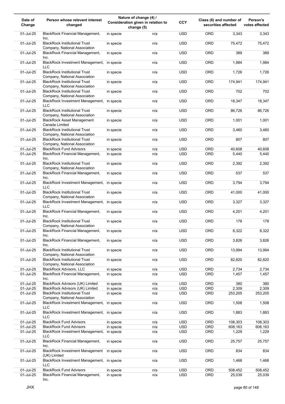 Date of Change Person whose relevant interest changed Nature of change (4) / Consideration given in relation to change (5) Class (6) and number of securities affected Person's votes affected CCY 01-Jul-25 BlackRock Financial Management, Inc. in specie n/a USD ORD 3,343 3,343 01-Jul-25 BlackRock Institutional Trust Company, National Association in specie n/a USD ORD 75,472 75,472 01-Jul-25 BlackRock Financial Management, Inc. in specie n/a USD ORD 389 389 01-Jul-25 BlackRock Investment Management, LLC in specie n/a USD ORD 1,984 1,984 01-Jul-25 BlackRock Institutional Trust Company, National Association in specie n/a USD ORD 1,726 1,726 01-Jul-25 BlackRock Institutional Trust Company, National Association in specie n/a USD ORD 174,941 174,941 01-Jul-25 BlackRock Institutional Trust Company, National Association in specie n/a USD ORD 702 702 01-Jul-25 BlackRock Investment Management, LLC in specie n/a USD ORD 18,347 18,347 01-Jul-25 BlackRock Institutional Trust Company, National Association in specie n/a USD ORD 86,726 86,726 01-Jul-25 BlackRock Asset Management Canada Limited in specie n/a USD ORD 1,001 1,001 01-Jul-25 BlackRock Institutional Trust Company, National Association in specie n/a USD ORD 3,460 3,460 01-Jul-25 BlackRock Institutional Trust Company, National Association in specie n/a USD ORD 807 807 01-Jul-25 BlackRock Fund Advisors in specie n/a USD ORD 40,608 40,608 01-Jul-25 BlackRock Financial Management, Inc. in specie n/a USD ORD 5,440 5,440 01-Jul-25 BlackRock Institutional Trust Company, National Association in specie n/a USD ORD 2,392 2,392 01-Jul-25 BlackRock Financial Management, Inc. in specie n/a USD ORD 537 537 01-Jul-25 BlackRock Investment Management, LLC in specie n/a USD ORD 3,794 3,794 01-Jul-25 BlackRock Institutional Trust Company, National Association in specie n/a USD ORD 41,000 41,000 01-Jul-25 BlackRock Investment Management, LLC in specie n/a USD ORD 3,327 3,327 01-Jul-25 BlackRock Financial Management, Inc. in specie n/a USD ORD 4,201 4,201 01-Jul-25 BlackRock Institutional Trust Company, National Association in specie n/a USD ORD 178 178 01-Jul-25 BlackRock Financial Management, Inc. in specie n/a USD ORD 8,322 8,322 01-Jul-25 BlackRock Financial Management, Inc. in specie n/a USD ORD 3,826 3,826 01-Jul-25 BlackRock Institutional Trust Company, National Association in specie n/a USD ORD 13,994 13,994 01-Jul-25 BlackRock Institutional Trust Company, National Association in specie n/a USD ORD 82,820 82,820 01-Jul-25 BlackRock Advisors, LLC in specie n/a USD ORD 2,734 2,734 01-Jul-25 BlackRock Financial Management, Inc. in specie n/a USD ORD 1,457 1,457 01-Jul-25 BlackRock Advisors (UK) Limited in specie n/a USD ORD 380 380 01-Jul-25 BlackRock Advisors (UK) Limited in specie n/a USD ORD 2,309 2,309 01-Jul-25 BlackRock Institutional Trust Company, National Association in specie n/a USD ORD 253,205 253,205 01-Jul-25 BlackRock Investment Management, LLC in specie n/a USD ORD 1,508 1,508 01-Jul-25 BlackRock Investment Management, LLC in specie n/a USD ORD 1,883 1,883 01-Jul-25 BlackRock Fund Advisors in specie n/a USD ORD 108,303 108,303 01-Jul-25 BlackRock Fund Advisors in specie n/a USD ORD 608,163 608,163 01-Jul-25 BlackRock Investment Management, LLC in specie n/a USD ORD 1,229 1,229 01-Jul-25 BlackRock Financial Management, Inc. in specie n/a USD ORD 25,757 25,757 01-Jul-25 BlackRock Investment Management (UK) Limited in specie n/a USD ORD 834 834 01-Jul-25 BlackRock Investment Management, LLC in specie n/a USD ORD 1,468 1,468 01-Jul-25 BlackRock Fund Advisors in specie n/a USD ORD 508,452 508,452 01-Jul-25 BlackRock Financial Management, Inc. in specie n/a USD ORD 25,039 25,039 JHX page 80 of 148