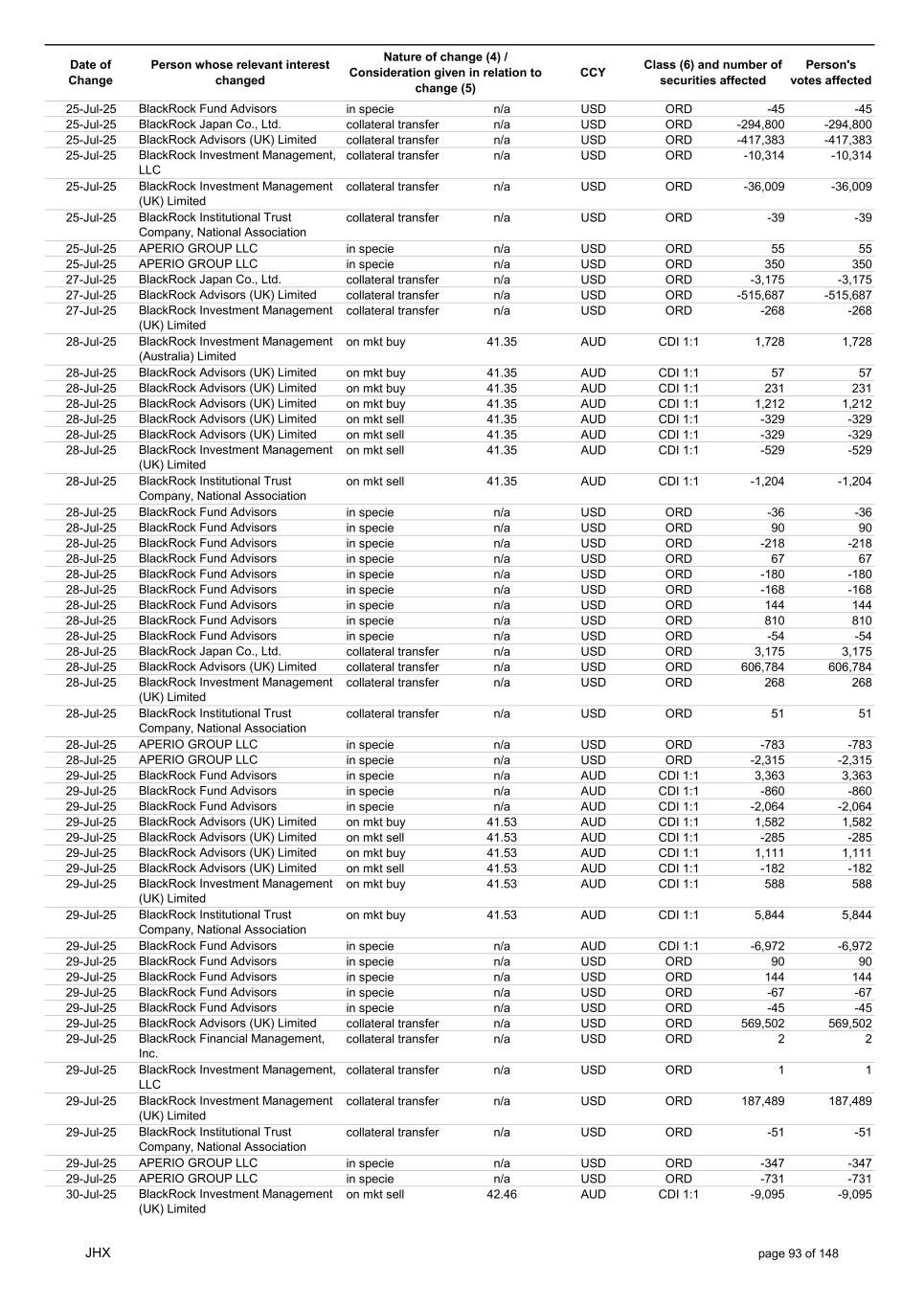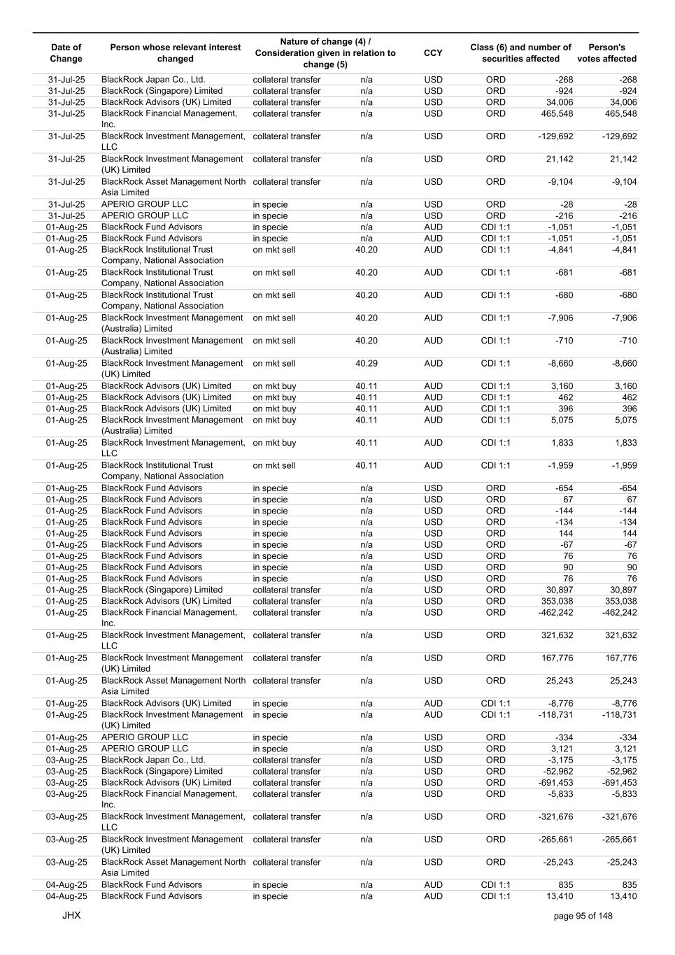 Date of Change Person whose relevant interest changed Nature of change (4) / Consideration given in relation to change (5) Class (6) and number of securities affected Person's votes affected CCY 18-Jul-25 BlackRock Advisors (UK) Limited on mkt buy 41.00 AUD CDI 1:1 303 303 18-Jul-25 BlackRock Investment Management (UK) Limited on mkt sell 41.00 AUD CDI 1:1 -2,370 -2,370 18-Jul-25 BlackRock Investment Management (UK) Limited on mkt sell 41.00 AUD CDI 1:1 -331 -331 18-Jul-25 BlackRock Investment Management (UK) Limited on mkt sell 41.00 AUD CDI 1:1 -3,210 -3,210 18-Jul-25 BlackRock Investment Management (UK) Limited on mkt buy 41.00 AUD CDI 1:1 20,864 20,864 18-Jul-25 BlackRock Advisors (UK) Limited on mkt buy 26.26 USD ORD 14 14 18-Jul-25 BlackRock Advisors (UK) Limited on mkt buy 26.26 USD ORD 8 8 18-Jul-25 BlackRock Investment Management, LLC on mkt sell 26.26 USD ORD -23 -23 18-Jul-25 BlackRock Fund Advisors in specie n/a USD ORD -67 -67 18-Jul-25 BlackRock Fund Advisors in specie n/a USD ORD -126 -126 18-Jul-25 BlackRock Fund Advisors in specie n/a USD ORD 315 315 18-Jul-25 BlackRock Fund Advisors in specie n/a USD ORD -180 -180 18-Jul-25 BlackRock Fund Advisors in specie n/a USD ORD 335 335 18-Jul-25 BlackRock Fund Advisors in specie n/a USD ORD -67 -67 18-Jul-25 BlackRock Fund Advisors in specie n/a USD ORD 90 90 18-Jul-25 BlackRock Fund Advisors in specie n/a USD ORD 90 90 18-Jul-25 BlackRock Fund Advisors in specie n/a USD ORD 168 168 18-Jul-25 BlackRock Fund Advisors in specie n/a USD ORD -224 -224 18-Jul-25 BlackRock Advisors (UK) Limited collateral transfer n/a USD ORD -187,057 -187,057 18-Jul-25 BlackRock Investment Management, LLC collateral transfer n/a USD ORD 17,120 17,120 18-Jul-25 BlackRock Investment Management (UK) Limited collateral transfer n/a USD ORD 329,678 329,678 18-Jul-25 BlackRock Institutional Trust Company, National Association collateral transfer n/a USD ORD -94 -94 20-Jul-25 BlackRock Japan Co., Ltd. collateral transfer n/a USD ORD -3,175 -3,175 20-Jul-25 BlackRock Advisors (UK) Limited collateral transfer n/a USD ORD -485,042 -485,042 20-Jul-25 BlackRock Investment Management, LLC collateral transfer n/a USD ORD -17,120 -17,120 20-Jul-25 BlackRock Investment Management (UK) Limited collateral transfer n/a USD ORD -409,985 -409,985 21-Jul-25 BlackRock Capital Management, Inc. on mkt buy 40.43 AUD CDI 1:1 9,199 9,199 21-Jul-25 BlackRock Financial Management, Inc. on mkt buy 40.43 AUD CDI 1:1 683 683 21-Jul-25 BlackRock Advisors (UK) Limited on mkt sell 40.37 AUD CDI 1:1 -1,584 -1,584 21-Jul-25 BlackRock Advisors (UK) Limited on mkt buy 40.37 AUD CDI 1:1 156 156 21-Jul-25 BlackRock Advisors (UK) Limited on mkt buy 40.37 AUD CDI 1:1 1,625 1,625 21-Jul-25 BlackRock Investment Management (Australia) Limited on mkt sell 40.37 AUD CDI 1:1 -5,112 -5,112 21-Jul-25 BlackRock Advisors (UK) Limited on mkt sell 40.37 AUD CDI 1:1 -1,914 -1,914 21-Jul-25 BlackRock Advisors (UK) Limited on mkt buy 40.37 AUD CDI 1:1 13,885 13,885 21-Jul-25 BlackRock Investment Management (Australia) Limited on mkt buy 40.37 AUD CDI 1:1 2,268 2,268 21-Jul-25 BlackRock Advisors, LLC on mkt buy 40.37 AUD CDI 1:1 468 468 21-Jul-25 BlackRock Investment Management (UK) Limited on mkt buy 40.37 AUD CDI 1:1 691 691 21-Jul-25 BlackRock Advisors (UK) Limited on mkt buy 26.25 USD ORD 8 8 21-Jul-25 BlackRock Investment Management, LLC on mkt buy 26.25 USD ORD 5,674 5,674 21-Jul-25 BlackRock Fund Advisors in specie n/a USD ORD -67 -67 21-Jul-25 BlackRock Fund Advisors in specie n/a USD ORD 134 134 21-Jul-25 BlackRock Fund Advisors in specie n/a USD ORD -72 -72 21-Jul-25 BlackRock Fund Advisors in specie n/a USD ORD -72 -72 21-Jul-25 BlackRock Fund Advisors in specie n/a USD ORD -76 -76 21-Jul-25 BlackRock Japan Co., Ltd. collateral transfer n/a USD ORD 3,175 3,175 21-Jul-25 BlackRock (Singapore) Limited collateral transfer n/a USD ORD 74,975 74,975 21-Jul-25 BlackRock Advisors (UK) Limited collateral transfer n/a USD ORD 837,246 837,246 21-Jul-25 BlackRock Financial Management, Inc. collateral transfer n/a USD ORD 3,640 3,640 21-Jul-25 BlackRock Investment Management (UK) Limited collateral transfer n/a USD ORD 31,497 31,497 21-Jul-25 APERIO GROUP LLC in specie n/a USD ORD 247 247 21-Jul-25 APERIO GROUP LLC in specie n/a USD ORD 2,122 2,122 22-Jul-25 BlackRock Fund Advisors in specie n/a AUD CDI 1:1 141 141 22-Jul-25 BlackRock Advisors (UK) Limited on mkt buy 39.75 AUD CDI 1:1 1,584 1,584 22-Jul-25 BlackRock Advisors (UK) Limited on mkt buy 39.75 AUD CDI 1:1 505 505 JHX page 90 of 148