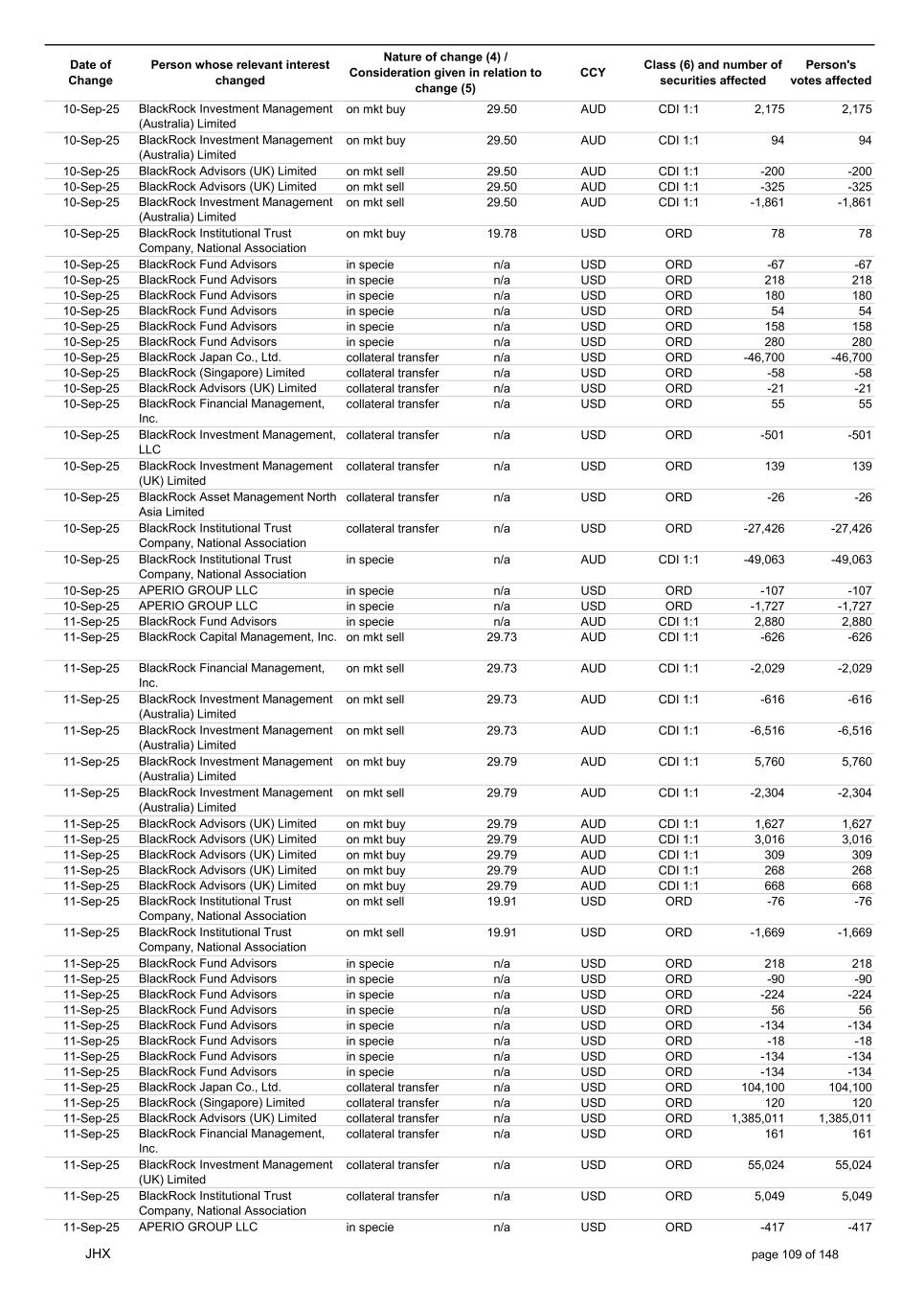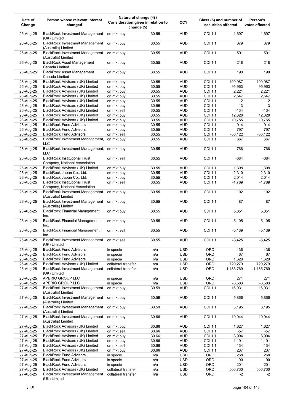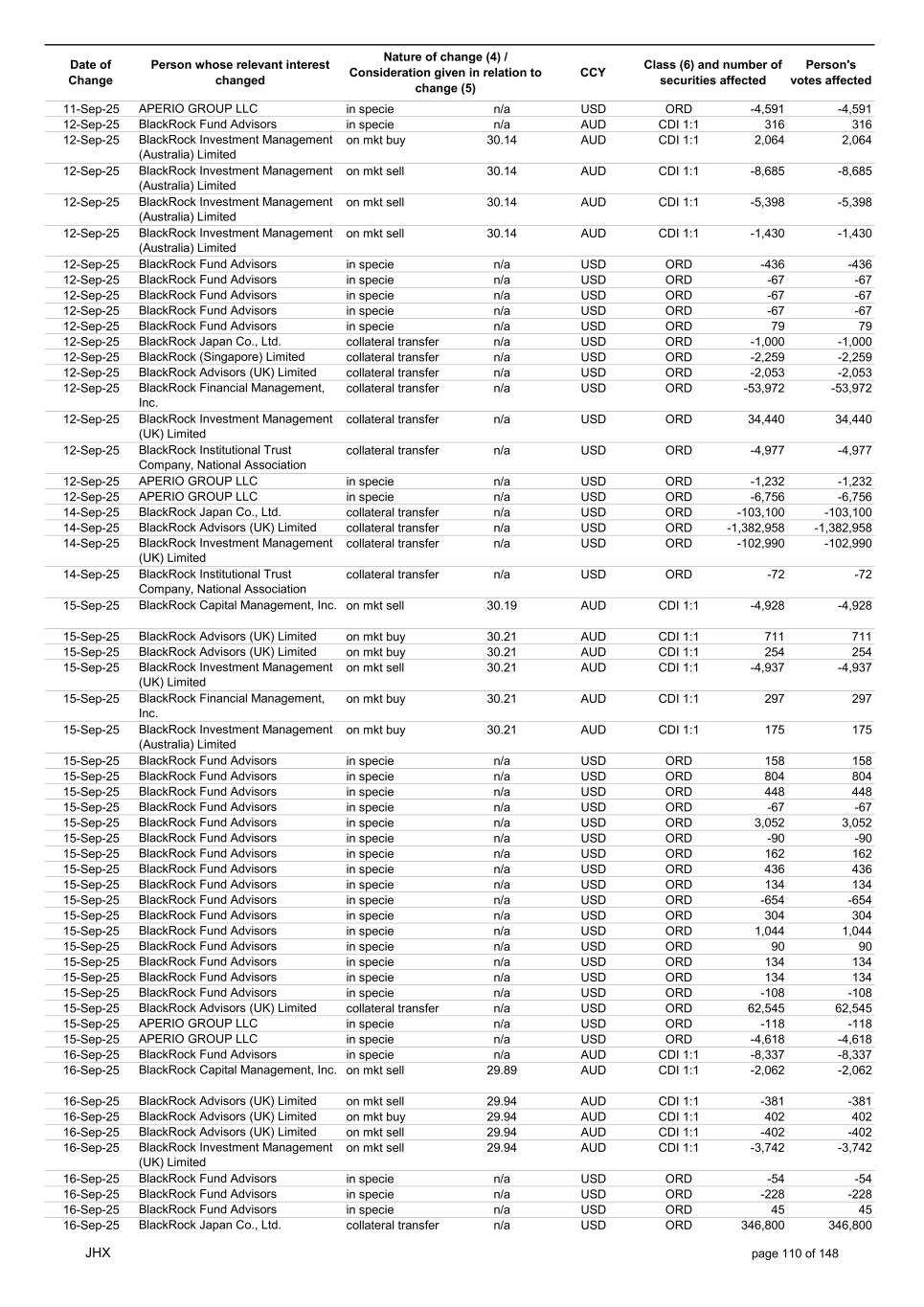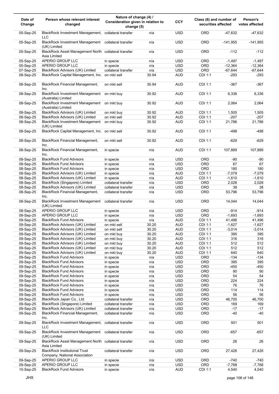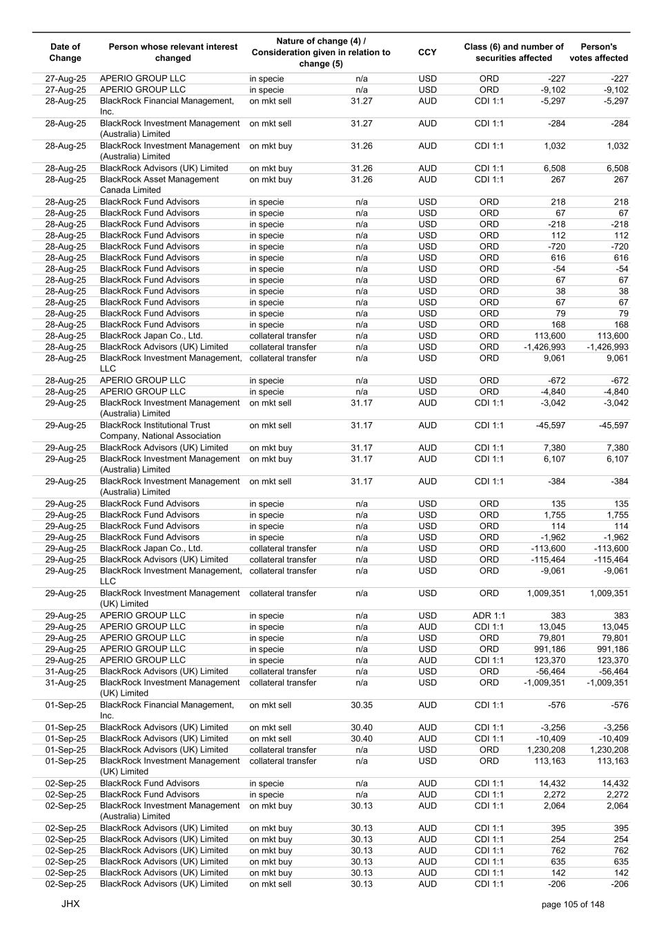 Date of Change Person whose relevant interest changed Nature of change (4) / Consideration given in relation to change (5) Class (6) and number of securities affected Person's votes affected CCY 05-Sep-25 BlackRock Investment Management, LLC collateral transfer n/a USD ORD -47,632 -47,632 05-Sep-25 BlackRock Investment Management (UK) Limited collateral transfer n/a USD ORD -141,955 -141,955 05-Sep-25 BlackRock Asset Management North Asia Limited collateral transfer n/a USD ORD -112 -112 05-Sep-25 APERIO GROUP LLC in specie n/a USD ORD -1,497 -1,497 05-Sep-25 APERIO GROUP LLC in specie n/a USD ORD -12,364 -12,364 07-Sep-25 BlackRock Advisors (UK) Limited collateral transfer n/a USD ORD -67,644 -67,644 08-Sep-25 BlackRock Capital Management, Inc. on mkt sell 30.94 AUD CDI 1:1 -293 -293 08-Sep-25 BlackRock Financial Management, Inc. on mkt sell 30.94 AUD CDI 1:1 -367 -367 08-Sep-25 BlackRock Investment Management (Australia) Limited on mkt buy 30.92 AUD CDI 1:1 6,336 6,336 08-Sep-25 BlackRock Investment Management (Australia) Limited on mkt buy 30.92 AUD CDI 1:1 2,064 2,064 08-Sep-25 BlackRock Advisors (UK) Limited on mkt buy 30.92 AUD CDI 1:1 1,505 1,505 08-Sep-25 BlackRock Advisors (UK) Limited on mkt sell 30.92 AUD CDI 1:1 -207 -207 08-Sep-25 BlackRock Investment Management (UK) Limited on mkt buy 30.92 AUD CDI 1:1 21,786 21,786 08-Sep-25 BlackRock Capital Management, Inc. on mkt sell 30.92 AUD CDI 1:1 -498 -498 08-Sep-25 BlackRock Financial Management, Inc. on mkt sell 30.92 AUD CDI 1:1 -629 -629 08-Sep-25 BlackRock Financial Management, Inc. in specie n/a AUD CDI 1:1 107,889 107,889 08-Sep-25 BlackRock Fund Advisors in specie n/a USD ORD -90 -90 08-Sep-25 BlackRock Fund Advisors in specie n/a USD ORD 67 67 08-Sep-25 BlackRock Fund Advisors in specie n/a USD ORD 180 180 08-Sep-25 BlackRock Advisors (UK) Limited in specie n/a AUD CDI 1:1 -7,079 -7,079 08-Sep-25 BlackRock Advisors (UK) Limited in specie n/a AUD CDI 1:1 -1,610 -1,610 08-Sep-25 BlackRock (Singapore) Limited collateral transfer n/a USD ORD 2,028 2,028 08-Sep-25 BlackRock Advisors (UK) Limited collateral transfer n/a USD ORD 38 38 08-Sep-25 BlackRock Financial Management, Inc. collateral transfer n/a USD ORD 53,796 53,796 08-Sep-25 BlackRock Investment Management (UK) Limited collateral transfer n/a USD ORD 14,044 14,044 08-Sep-25 APERIO GROUP LLC in specie n/a USD ORD -914 -914 08-Sep-25 APERIO GROUP LLC in specie n/a USD ORD -1,693 -1,693 09-Sep-25 BlackRock Fund Advisors in specie n/a AUD CDI 1:1 41,496 41,496 09-Sep-25 BlackRock Advisors (UK) Limited on mkt sell 30.20 AUD CDI 1:1 -1,627 -1,627 09-Sep-25 BlackRock Advisors (UK) Limited on mkt sell 30.20 AUD CDI 1:1 -3,014 -3,014 09-Sep-25 BlackRock Advisors (UK) Limited on mkt buy 30.20 AUD CDI 1:1 395 395 09-Sep-25 BlackRock Advisors (UK) Limited on mkt buy 30.20 AUD CDI 1:1 316 316 09-Sep-25 BlackRock Advisors (UK) Limited on mkt buy 30.20 AUD CDI 1:1 512 512 09-Sep-25 BlackRock Advisors (UK) Limited on mkt buy 30.20 AUD CDI 1:1 512 512 09-Sep-25 BlackRock Advisors (UK) Limited on mkt buy 30.20 AUD CDI 1:1 640 640 09-Sep-25 BlackRock Fund Advisors in specie n/a USD ORD -134 -134 09-Sep-25 BlackRock Fund Advisors in specie n/a USD ORD 395 395 09-Sep-25 BlackRock Fund Advisors in specie n/a USD ORD -450 -450 09-Sep-25 BlackRock Fund Advisors in specie n/a USD ORD 90 90 09-Sep-25 BlackRock Fund Advisors in specie n/a USD ORD 54 54 09-Sep-25 BlackRock Fund Advisors in specie n/a USD ORD 224 224 09-Sep-25 BlackRock Fund Advisors in specie n/a USD ORD 76 76 09-Sep-25 BlackRock Fund Advisors in specie n/a USD ORD 114 114 09-Sep-25 BlackRock Fund Advisors in specie n/a USD ORD 56 56 09-Sep-25 BlackRock Japan Co., Ltd. collateral transfer n/a USD ORD 46,700 46,700 09-Sep-25 BlackRock (Singapore) Limited collateral transfer n/a USD ORD 169 169 09-Sep-25 BlackRock Advisors (UK) Limited collateral transfer n/a USD ORD -17 -17 09-Sep-25 BlackRock Financial Management, Inc. collateral transfer n/a USD ORD -40 -40 09-Sep-25 BlackRock Investment Management, LLC collateral transfer n/a USD ORD 501 501 09-Sep-25 BlackRock Investment Management (UK) Limited collateral transfer n/a USD ORD -657 -657 09-Sep-25 BlackRock Asset Management North Asia Limited collateral transfer n/a USD ORD 26 26 09-Sep-25 BlackRock Institutional Trust Company, National Association collateral transfer n/a USD ORD 27,426 27,426 09-Sep-25 APERIO GROUP LLC in specie n/a USD ORD -740 -740 09-Sep-25 APERIO GROUP LLC in specie n/a USD ORD -7,768 -7,768 10-Sep-25 BlackRock Fund Advisors in specie n/a AUD CDI 1:1 4,540 4,540 JHX page 108 of 148