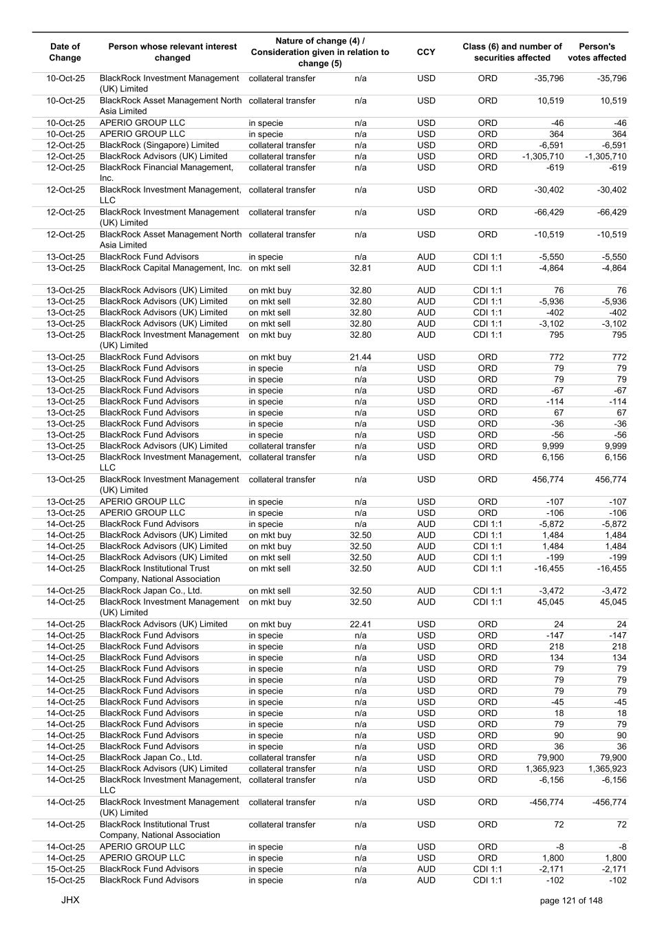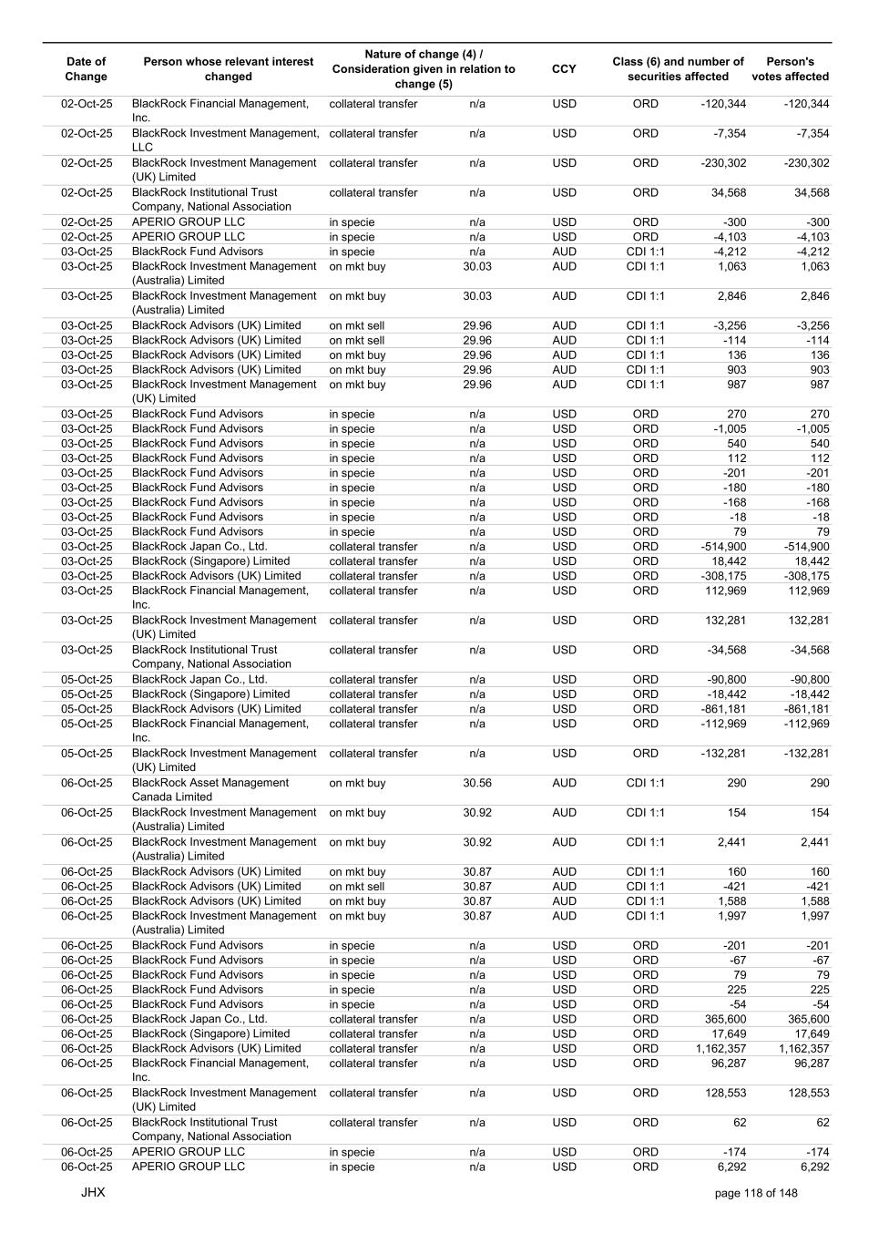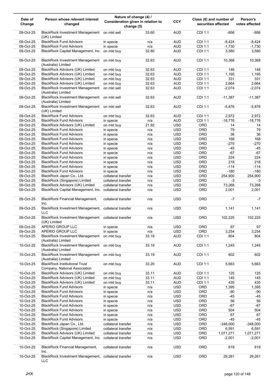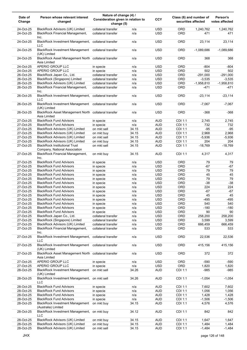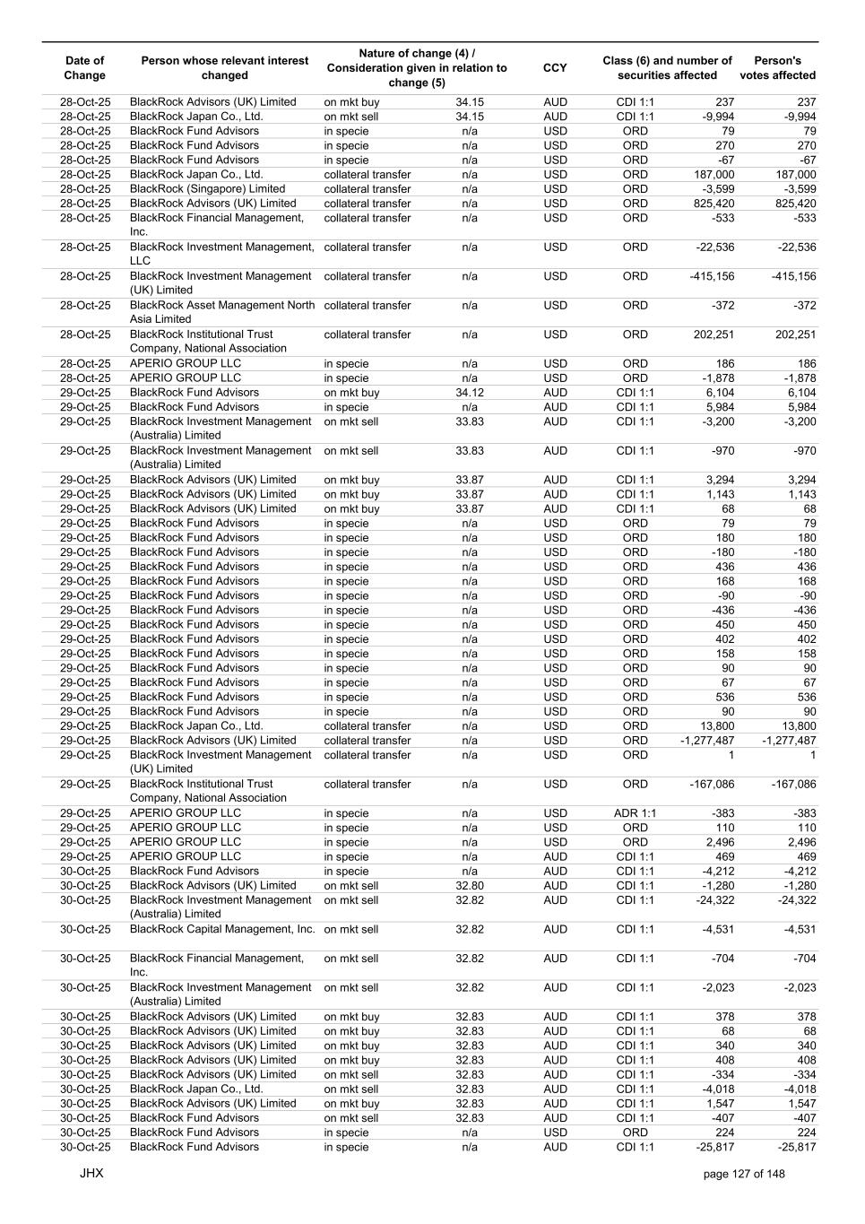 Date of Change Person whose relevant interest changed Nature of change (4) / Consideration given in relation to change (5) Class (6) and number of securities affected Person's votes affected CCY 10-Oct-25 BlackRock Investment Management (UK) Limited collateral transfer n/a USD ORD -35,796 -35,796 10-Oct-25 BlackRock Asset Management North Asia Limited collateral transfer n/a USD ORD 10,519 10,519 10-Oct-25 APERIO GROUP LLC in specie n/a USD ORD -46 -46 10-Oct-25 APERIO GROUP LLC in specie n/a USD ORD 364 364 12-Oct-25 BlackRock (Singapore) Limited collateral transfer n/a USD ORD -6,591 -6,591 12-Oct-25 BlackRock Advisors (UK) Limited collateral transfer n/a USD ORD -1,305,710 -1,305,710 12-Oct-25 BlackRock Financial Management, Inc. collateral transfer n/a USD ORD -619 -619 12-Oct-25 BlackRock Investment Management, LLC collateral transfer n/a USD ORD -30,402 -30,402 12-Oct-25 BlackRock Investment Management (UK) Limited collateral transfer n/a USD ORD -66,429 -66,429 12-Oct-25 BlackRock Asset Management North Asia Limited collateral transfer n/a USD ORD -10,519 -10,519 13-Oct-25 BlackRock Fund Advisors in specie n/a AUD CDI 1:1 -5,550 -5,550 13-Oct-25 BlackRock Capital Management, Inc. on mkt sell 32.81 AUD CDI 1:1 -4,864 -4,864 13-Oct-25 BlackRock Advisors (UK) Limited on mkt buy 32.80 AUD CDI 1:1 76 76 13-Oct-25 BlackRock Advisors (UK) Limited on mkt sell 32.80 AUD CDI 1:1 -5,936 -5,936 13-Oct-25 BlackRock Advisors (UK) Limited on mkt sell 32.80 AUD CDI 1:1 -402 -402 13-Oct-25 BlackRock Advisors (UK) Limited on mkt sell 32.80 AUD CDI 1:1 -3,102 -3,102 13-Oct-25 BlackRock Investment Management (UK) Limited on mkt buy 32.80 AUD CDI 1:1 795 795 13-Oct-25 BlackRock Fund Advisors on mkt buy 21.44 USD ORD 772 772 13-Oct-25 BlackRock Fund Advisors in specie n/a USD ORD 79 79 13-Oct-25 BlackRock Fund Advisors in specie n/a USD ORD 79 79 13-Oct-25 BlackRock Fund Advisors in specie n/a USD ORD -67 -67 13-Oct-25 BlackRock Fund Advisors in specie n/a USD ORD -114 -114 13-Oct-25 BlackRock Fund Advisors in specie n/a USD ORD 67 67 13-Oct-25 BlackRock Fund Advisors in specie n/a USD ORD -36 -36 13-Oct-25 BlackRock Fund Advisors in specie n/a USD ORD -56 -56 13-Oct-25 BlackRock Advisors (UK) Limited collateral transfer n/a USD ORD 9,999 9,999 13-Oct-25 BlackRock Investment Management, LLC collateral transfer n/a USD ORD 6,156 6,156 13-Oct-25 BlackRock Investment Management (UK) Limited collateral transfer n/a USD ORD 456,774 456,774 13-Oct-25 APERIO GROUP LLC in specie n/a USD ORD -107 -107 13-Oct-25 APERIO GROUP LLC in specie n/a USD ORD -106 -106 14-Oct-25 BlackRock Fund Advisors in specie n/a AUD CDI 1:1 -5,872 -5,872 14-Oct-25 BlackRock Advisors (UK) Limited on mkt buy 32.50 AUD CDI 1:1 1,484 1,484 14-Oct-25 BlackRock Advisors (UK) Limited on mkt buy 32.50 AUD CDI 1:1 1,484 1,484 14-Oct-25 BlackRock Advisors (UK) Limited on mkt sell 32.50 AUD CDI 1:1 -199 -199 14-Oct-25 BlackRock Institutional Trust Company, National Association on mkt sell 32.50 AUD CDI 1:1 -16,455 -16,455 14-Oct-25 BlackRock Japan Co., Ltd. on mkt sell 32.50 AUD CDI 1:1 -3,472 -3,472 14-Oct-25 BlackRock Investment Management (UK) Limited on mkt buy 32.50 AUD CDI 1:1 45,045 45,045 14-Oct-25 BlackRock Advisors (UK) Limited on mkt buy 22.41 USD ORD 24 24 14-Oct-25 BlackRock Fund Advisors in specie n/a USD ORD -147 -147 14-Oct-25 BlackRock Fund Advisors in specie n/a USD ORD 218 218 14-Oct-25 BlackRock Fund Advisors in specie n/a USD ORD 134 134 14-Oct-25 BlackRock Fund Advisors in specie n/a USD ORD 79 79 14-Oct-25 BlackRock Fund Advisors in specie n/a USD ORD 79 79 14-Oct-25 BlackRock Fund Advisors in specie n/a USD ORD 79 79 14-Oct-25 BlackRock Fund Advisors in specie n/a USD ORD -45 -45 14-Oct-25 BlackRock Fund Advisors in specie n/a USD ORD 18 18 14-Oct-25 BlackRock Fund Advisors in specie n/a USD ORD 79 79 14-Oct-25 BlackRock Fund Advisors in specie n/a USD ORD 90 90 14-Oct-25 BlackRock Fund Advisors in specie n/a USD ORD 36 36 14-Oct-25 BlackRock Japan Co., Ltd. collateral transfer n/a USD ORD 79,900 79,900 14-Oct-25 BlackRock Advisors (UK) Limited collateral transfer n/a USD ORD 1,365,923 1,365,923 14-Oct-25 BlackRock Investment Management, LLC collateral transfer n/a USD ORD -6,156 -6,156 14-Oct-25 BlackRock Investment Management (UK) Limited collateral transfer n/a USD ORD -456,774 -456,774 14-Oct-25 BlackRock Institutional Trust Company, National Association collateral transfer n/a USD ORD 72 72 14-Oct-25 APERIO GROUP LLC in specie n/a USD ORD -8 -8 14-Oct-25 APERIO GROUP LLC in specie n/a USD ORD 1,800 1,800 15-Oct-25 BlackRock Fund Advisors in specie n/a AUD CDI 1:1 -2,171 -2,171 15-Oct-25 BlackRock Fund Advisors in specie n/a AUD CDI 1:1 -102 -102 JHX page 121 of 148