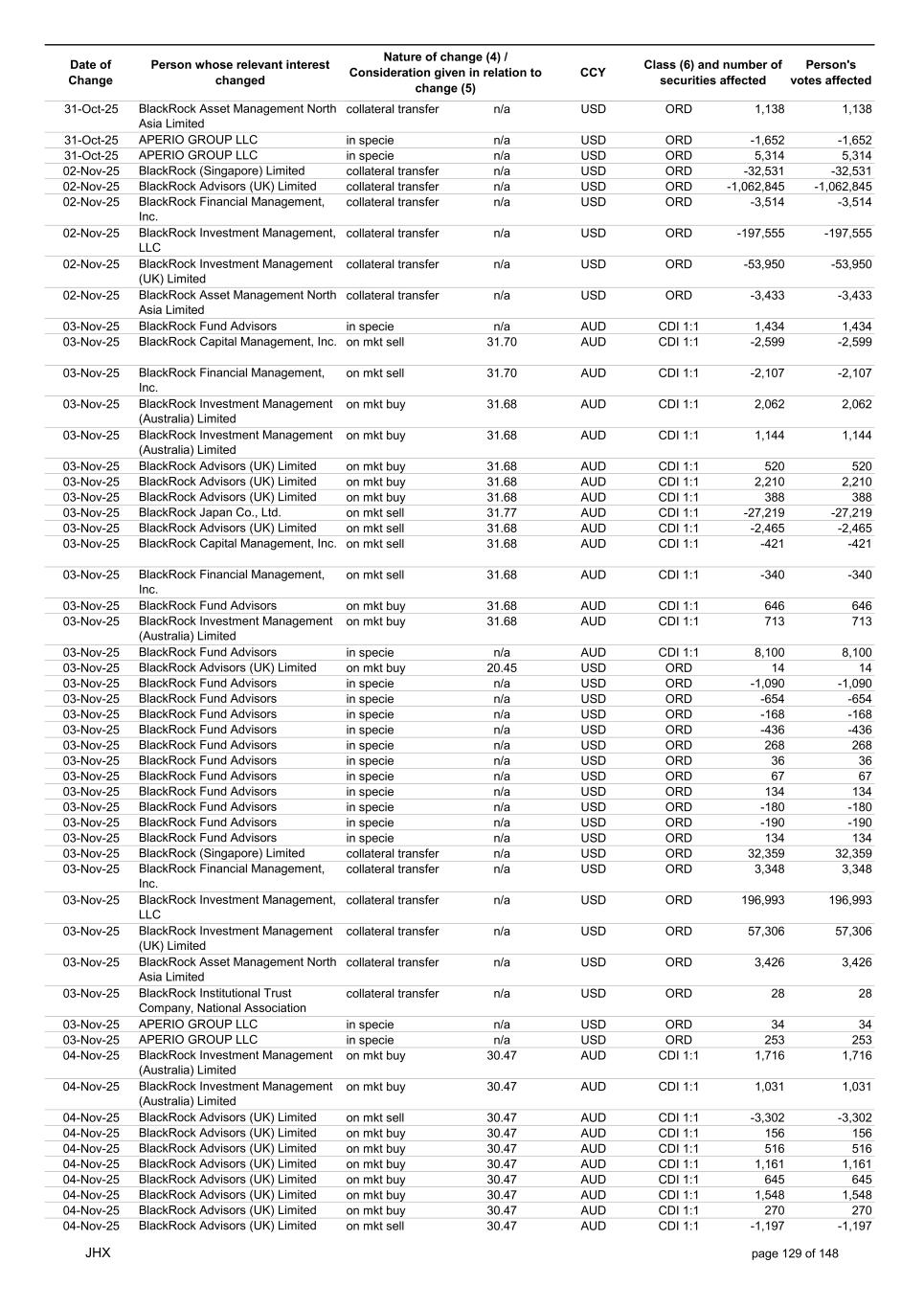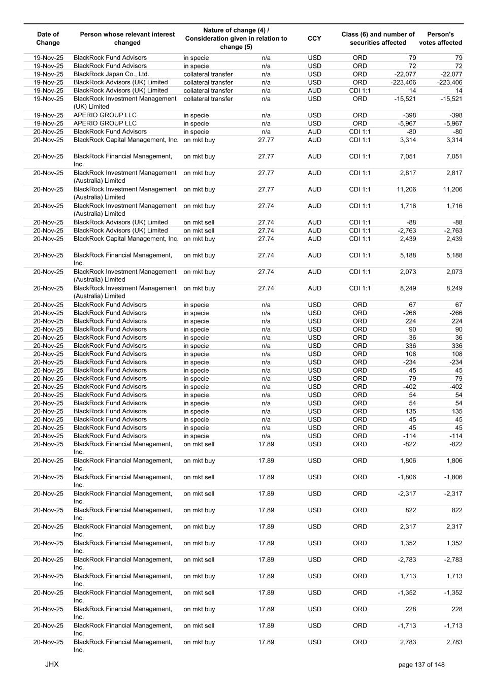 Date of Change Person whose relevant interest changed Nature of change (4) / Consideration given in relation to change (5) Class (6) and number of securities affected Person's votes affected CCY 22-Oct-25 APERIO GROUP LLC in specie n/a USD ORD -307 -307 22-Oct-25 APERIO GROUP LLC in specie n/a USD ORD -1,251 -1,251 23-Oct-25 BlackRock Institutional Trust Company, National Association in specie n/a AUD CDI 1:1 13,778 13,778 23-Oct-25 BlackRock Fund Advisors in specie n/a AUD CDI 1:1 1,580 1,580 23-Oct-25 BlackRock Capital Management, Inc. on mkt sell 33.37 AUD CDI 1:1 -1,502 -1,502 23-Oct-25 BlackRock Investment Management (Australia) Limited on mkt sell 33.37 AUD CDI 1:1 -408 -408 23-Oct-25 BlackRock Investment Management (Australia) Limited on mkt sell 33.37 AUD CDI 1:1 -7,879 -7,879 23-Oct-25 BlackRock Advisors (UK) Limited on mkt buy 33.41 AUD CDI 1:1 2,968 2,968 23-Oct-25 BlackRock Institutional Trust Company, National Association on mkt sell 33.41 AUD CDI 1:1 -30,356 -30,356 23-Oct-25 BlackRock Japan Co., Ltd. on mkt sell 33.41 AUD CDI 1:1 -6,483 -6,483 23-Oct-25 BlackRock Financial Management, Inc. on mkt sell 33.41 AUD CDI 1:1 -6,844 -6,844 23-Oct-25 BlackRock Financial Management, Inc. on mkt buy 33.41 AUD CDI 1:1 1,194 1,194 23-Oct-25 BlackRock Institutional Trust Company, National Association on mkt buy 33.41 AUD CDI 1:1 6,029 6,029 23-Oct-25 BlackRock Fund Advisors in specie n/a USD ORD -436 -436 23-Oct-25 BlackRock Fund Advisors in specie n/a USD ORD -134 -134 23-Oct-25 BlackRock Fund Advisors in specie n/a USD ORD -180 -180 23-Oct-25 BlackRock Fund Advisors in specie n/a USD ORD 135 135 23-Oct-25 BlackRock Fund Advisors in specie n/a USD ORD 79 79 23-Oct-25 BlackRock Fund Advisors in specie n/a USD ORD 112 112 23-Oct-25 BlackRock Fund Advisors in specie n/a USD ORD 18 18 23-Oct-25 BlackRock Fund Advisors in specie n/a USD ORD -2,616 -2,616 23-Oct-25 BlackRock Fund Advisors in specie n/a USD ORD 79 79 23-Oct-25 BlackRock Fund Advisors in specie n/a USD ORD -218 -218 23-Oct-25 BlackRock Fund Advisors in specie n/a USD ORD -342 -342 23-Oct-25 BlackRock Fund Advisors in specie n/a USD ORD 45 45 23-Oct-25 BlackRock Fund Advisors in specie n/a USD ORD 54 54 23-Oct-25 BlackRock Japan Co., Ltd. collateral transfer n/a USD ORD -474,700 -474,700 23-Oct-25 BlackRock Advisors (UK) Limited collateral transfer n/a USD ORD -641,916 -641,916 23-Oct-25 BlackRock Investment Management (UK) Limited collateral transfer n/a USD ORD 1,096,753 1,096,753 23-Oct-25 APERIO GROUP LLC in specie n/a USD ORD -110 -110 23-Oct-25 APERIO GROUP LLC in specie n/a USD ORD -3,637 -3,637 24-Oct-25 BlackRock Fund Advisors in specie n/a AUD CDI 1:1 1,056 1,056 24-Oct-25 BlackRock Investment Management (Australia) Limited on mkt sell 34.14 AUD CDI 1:1 -936 -936 24-Oct-25 BlackRock Investment Management (Australia) Limited on mkt sell 34.14 AUD CDI 1:1 -199 -199 24-Oct-25 BlackRock Investment Management (Australia) Limited on mkt buy 34.13 AUD CDI 1:1 1,144 1,144 24-Oct-25 BlackRock Investment Management (Australia) Limited on mkt buy 34.13 AUD CDI 1:1 5,720 5,720 24-Oct-25 BlackRock Advisors (UK) Limited on mkt buy 34.13 AUD CDI 1:1 1,484 1,484 24-Oct-25 BlackRock Advisors (UK) Limited on mkt buy 34.13 AUD CDI 1:1 1,008 1,008 24-Oct-25 BlackRock Advisors (UK) Limited on mkt buy 34.13 AUD CDI 1:1 378 378 24-Oct-25 BlackRock Advisors (UK) Limited on mkt sell 34.13 AUD CDI 1:1 -145 -145 24-Oct-25 BlackRock Advisors (UK) Limited on mkt sell 34.13 AUD CDI 1:1 -1,665 -1,665 24-Oct-25 BlackRock Advisors (UK) Limited on mkt sell 34.13 AUD CDI 1:1 -1,665 -1,665 24-Oct-25 BlackRock Advisors (UK) Limited on mkt sell 34.13 AUD CDI 1:1 -333 -333 24-Oct-25 BlackRock Investment Management (UK) Limited on mkt sell 34.13 AUD CDI 1:1 -1,863 -1,863 24-Oct-25 BlackRock Investment Management (Australia) Limited on mkt sell 34.13 AUD CDI 1:1 -11,789 -11,789 24-Oct-25 BlackRock Investment Management (Australia) Limited on mkt sell 34.13 AUD CDI 1:1 -2,506 -2,506 24-Oct-25 BlackRock Investment Management (UK) Limited on mkt sell 34.13 AUD CDI 1:1 -23,448 -23,448 24-Oct-25 BlackRock Fund Advisors in specie n/a AUD CDI 1:1 2,534 2,534 24-Oct-25 BlackRock Fund Advisors in specie n/a USD ORD 560 560 24-Oct-25 BlackRock Fund Advisors in specie n/a USD ORD -114 -114 24-Oct-25 BlackRock Fund Advisors in specie n/a USD ORD 36 36 24-Oct-25 BlackRock Fund Advisors in specie n/a USD ORD 1,323 1,323 24-Oct-25 BlackRock Fund Advisors in specie n/a USD ORD 45 45 24-Oct-25 BlackRock Fund Advisors in specie n/a USD ORD 336 336 24-Oct-25 BlackRock Japan Co., Ltd. collateral transfer n/a USD ORD 291,000 291,000 24-Oct-25 BlackRock (Singapore) Limited collateral transfer n/a USD ORD 3,535 3,535 JHX page 125 of 148