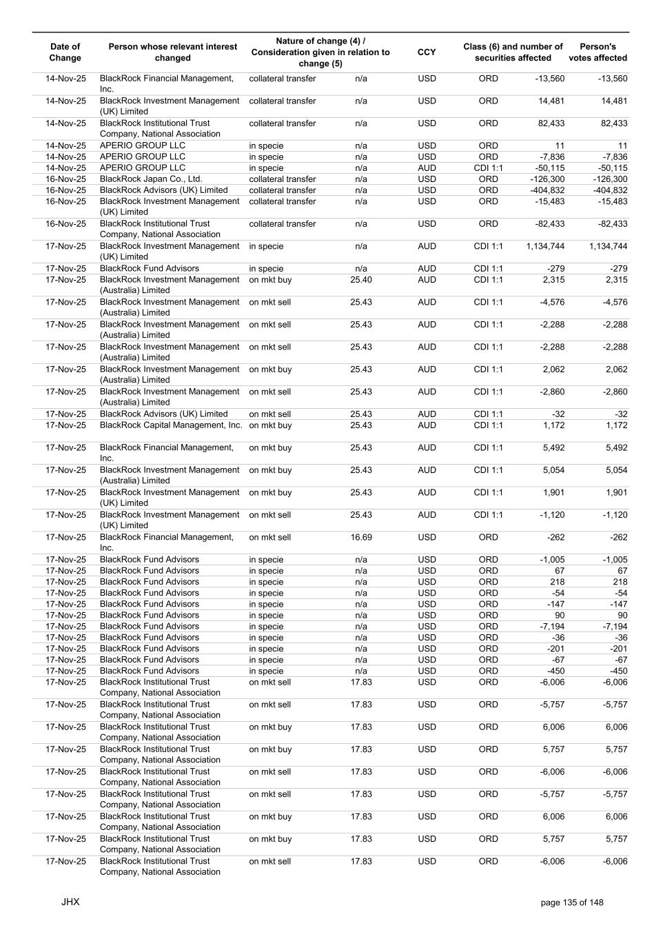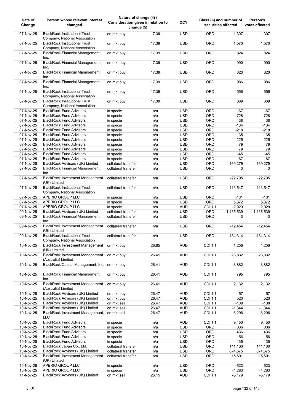 Date of Change Person whose relevant interest changed Nature of change (4) / Consideration given in relation to change (5) Class (6) and number of securities affected Person's votes affected CCY 05-Nov-25 BlackRock Investment Management (UK) Limited collateral transfer n/a USD ORD -56,454 -56,454 05-Nov-25 BlackRock Asset Management North Asia Limited collateral transfer n/a USD ORD 141,451 141,451 05-Nov-25 APERIO GROUP LLC in specie n/a USD ORD 421 421 05-Nov-25 APERIO GROUP LLC in specie n/a USD ORD 4,056 4,056 06-Nov-25 BlackRock Advisors (UK) Limited on mkt buy 25.75 AUD CDI 1:1 78 78 06-Nov-25 BlackRock Advisors (UK) Limited on mkt buy 25.75 AUD CDI 1:1 1,320 1,320 06-Nov-25 BlackRock Advisors (UK) Limited on mkt sell 25.75 AUD CDI 1:1 -668 -668 06-Nov-25 BlackRock Japan Co., Ltd. on mkt sell 25.75 AUD CDI 1:1 -1,164 -1,164 06-Nov-25 BlackRock Japan Co., Ltd. on mkt sell 25.75 AUD CDI 1:1 -2,813 -2,813 06-Nov-25 BlackRock Financial Management, Inc. on mkt buy 25.75 AUD CDI 1:1 733 733 06-Nov-25 BlackRock Financial Management, Inc. on mkt buy 25.75 AUD CDI 1:1 447 447 06-Nov-25 BlackRock Investment Management (UK) Limited on mkt buy 25.75 AUD CDI 1:1 738 738 06-Nov-25 BlackRock Investment Management (Australia) Limited on mkt buy 25.75 AUD CDI 1:1 1,406 1,406 06-Nov-25 BlackRock Investment Management (Australia) Limited on mkt buy 25.75 AUD CDI 1:1 3,733 3,733 06-Nov-25 BlackRock Investment Management (Australia) Limited on mkt buy 25.75 AUD CDI 1:1 6,132 6,132 06-Nov-25 BlackRock Advisors, LLC on mkt sell 17.34 USD ORD -10 -10 06-Nov-25 BlackRock Institutional Trust Company, National Association on mkt buy 17.34 USD ORD 1,653 1,653 06-Nov-25 BlackRock Financial Management, Inc. on mkt buy 17.34 USD ORD 969 969 06-Nov-25 BlackRock Financial Management, Inc. on mkt buy 17.34 USD ORD 921 921 06-Nov-25 BlackRock Fund Advisors in specie n/a USD ORD 54 54 06-Nov-25 BlackRock Fund Advisors in specie n/a USD ORD -67 -67 06-Nov-25 BlackRock Fund Advisors in specie n/a USD ORD -218 -218 06-Nov-25 BlackRock Fund Advisors in specie n/a USD ORD 36 36 06-Nov-25 BlackRock Fund Advisors in specie n/a USD ORD 79 79 06-Nov-25 BlackRock Fund Advisors in specie n/a USD ORD 54 54 06-Nov-25 BlackRock Fund Advisors in specie n/a USD ORD -76 -76 06-Nov-25 BlackRock Fund Advisors in specie n/a USD ORD 79 79 06-Nov-25 BlackRock Japan Co., Ltd. collateral transfer n/a USD ORD -429,400 -429,400 06-Nov-25 BlackRock (Singapore) Limited collateral transfer n/a USD ORD -107,727 -107,727 06-Nov-25 BlackRock Advisors (UK) Limited collateral transfer n/a USD ORD 1,160,015 1,160,015 06-Nov-25 BlackRock Financial Management, Inc. collateral transfer n/a USD ORD -14,126 -14,126 06-Nov-25 BlackRock Investment Management, LLC collateral transfer n/a USD ORD -457,167 -457,167 06-Nov-25 BlackRock Investment Management (UK) Limited collateral transfer n/a USD ORD -721,345 -721,345 06-Nov-25 BlackRock Asset Management North Asia Limited collateral transfer n/a USD ORD -145,536 -145,536 06-Nov-25 BlackRock Institutional Trust Company, National Association collateral transfer n/a USD ORD 70,767 70,767 06-Nov-25 APERIO GROUP LLC in specie n/a USD ORD -106 -106 06-Nov-25 APERIO GROUP LLC in specie n/a USD ORD -1,565 -1,565 07-Nov-25 BlackRock Fund Advisors in specie n/a AUD CDI 1:1 8,100 8,100 07-Nov-25 BlackRock Investment Management (Australia) Limited on mkt buy 26.11 AUD CDI 1:1 10,321 10,321 07-Nov-25 BlackRock Investment Management (Australia) Limited on mkt buy 26.11 AUD CDI 1:1 6,345 6,345 07-Nov-25 BlackRock Investment Management (Australia) Limited on mkt buy 26.11 AUD CDI 1:1 1,805 1,805 07-Nov-25 BlackRock Advisors (UK) Limited on mkt buy 26.12 AUD CDI 1:1 2,984 2,984 07-Nov-25 BlackRock Advisors (UK) Limited on mkt buy 26.12 AUD CDI 1:1 1,566 1,566 07-Nov-25 BlackRock Advisors (UK) Limited on mkt buy 26.12 AUD CDI 1:1 910 910 07-Nov-25 BlackRock Advisors (UK) Limited on mkt sell 26.12 AUD CDI 1:1 -639 -639 07-Nov-25 BlackRock Advisors (UK) Limited on mkt sell 26.12 AUD CDI 1:1 -1,675 -1,675 07-Nov-25 BlackRock Advisors (UK) Limited on mkt sell 26.12 AUD CDI 1:1 -1,005 -1,005 07-Nov-25 BlackRock Advisors (UK) Limited on mkt sell 26.12 AUD CDI 1:1 -327 -327 07-Nov-25 BlackRock Investment Management (Australia) Limited on mkt buy 26.12 AUD CDI 1:1 814 814 07-Nov-25 BlackRock Investment Management (Australia) Limited on mkt buy 26.12 AUD CDI 1:1 499 499 07-Nov-25 BlackRock Investment Management (Australia) Limited on mkt buy 26.12 AUD CDI 1:1 142 142 JHX page 131 of 148