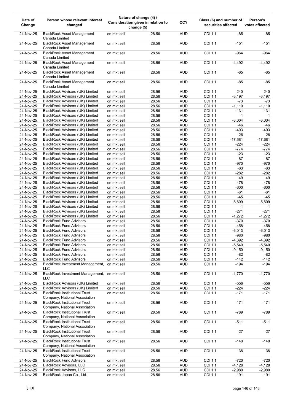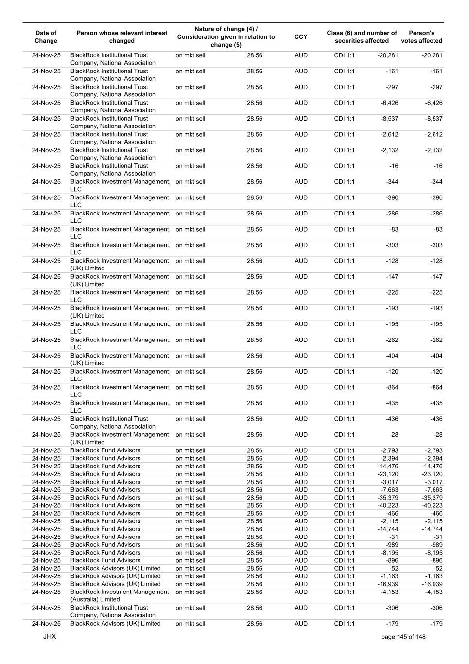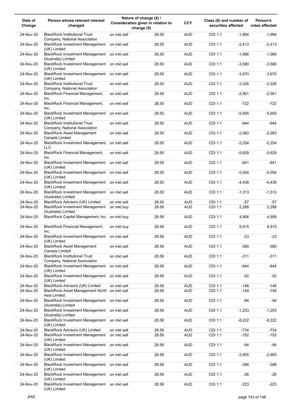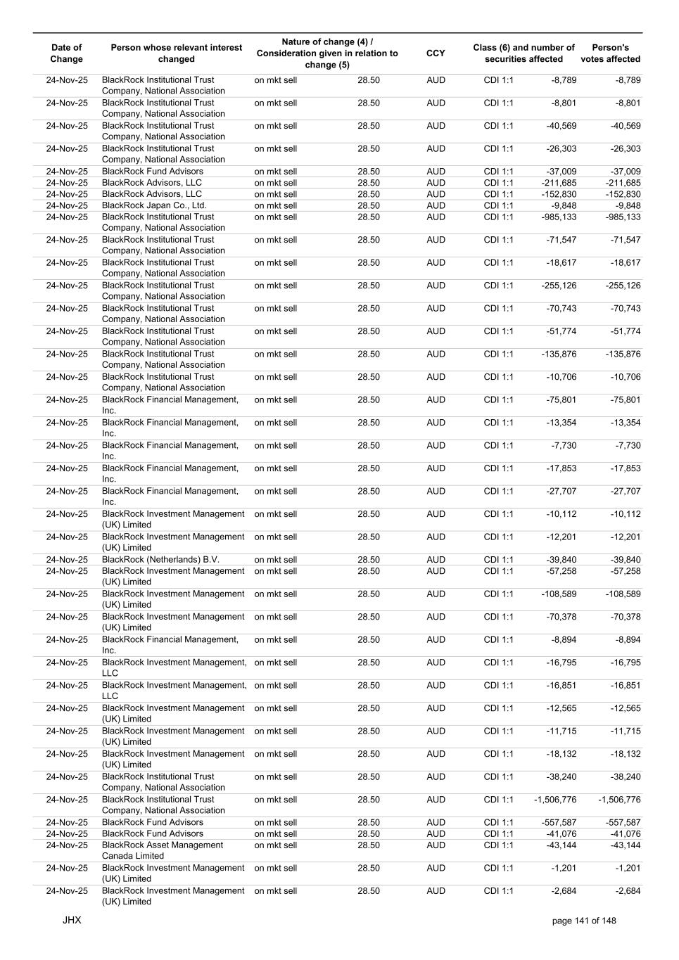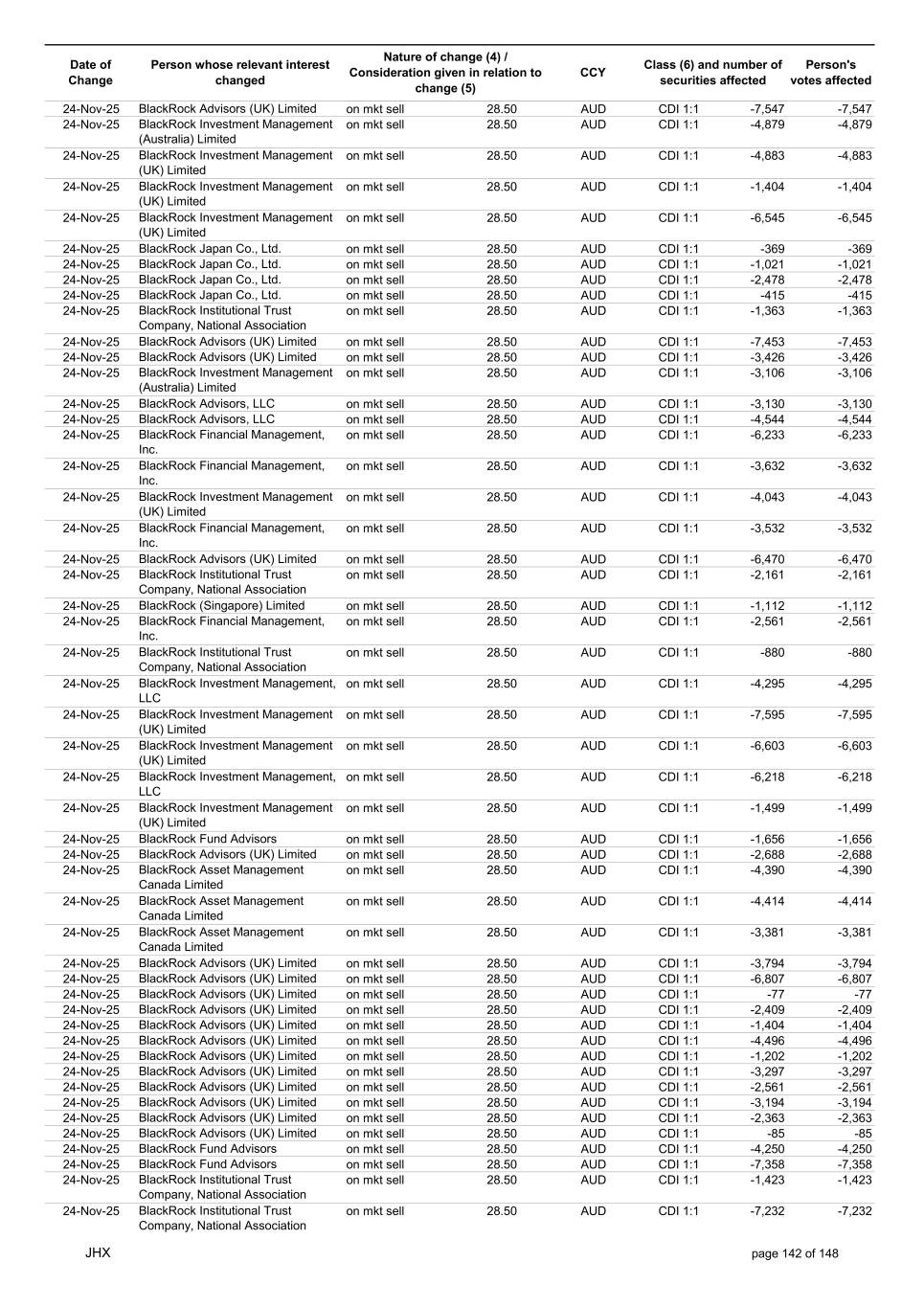 Date of Change Person whose relevant interest changed Nature of change (4) / Consideration given in relation to change (5) Class (6) and number of securities affected Person's votes affected CCY 24-Nov-25 BlackRock Institutional Trust Company, National Association on mkt sell 28.50 AUD CDI 1:1 -8,789 -8,789 24-Nov-25 BlackRock Institutional Trust Company, National Association on mkt sell 28.50 AUD CDI 1:1 -8,801 -8,801 24-Nov-25 BlackRock Institutional Trust Company, National Association on mkt sell 28.50 AUD CDI 1:1 -40,569 -40,569 24-Nov-25 BlackRock Institutional Trust Company, National Association on mkt sell 28.50 AUD CDI 1:1 -26,303 -26,303 24-Nov-25 BlackRock Fund Advisors on mkt sell 28.50 AUD CDI 1:1 -37,009 -37,009 24-Nov-25 BlackRock Advisors, LLC on mkt sell 28.50 AUD CDI 1:1 -211,685 -211,685 24-Nov-25 BlackRock Advisors, LLC on mkt sell 28.50 AUD CDI 1:1 -152,830 -152,830 24-Nov-25 BlackRock Japan Co., Ltd. on mkt sell 28.50 AUD CDI 1:1 -9,848 -9,848 24-Nov-25 BlackRock Institutional Trust Company, National Association on mkt sell 28.50 AUD CDI 1:1 -985,133 -985,133 24-Nov-25 BlackRock Institutional Trust Company, National Association on mkt sell 28.50 AUD CDI 1:1 -71,547 -71,547 24-Nov-25 BlackRock Institutional Trust Company, National Association on mkt sell 28.50 AUD CDI 1:1 -18,617 -18,617 24-Nov-25 BlackRock Institutional Trust Company, National Association on mkt sell 28.50 AUD CDI 1:1 -255,126 -255,126 24-Nov-25 BlackRock Institutional Trust Company, National Association on mkt sell 28.50 AUD CDI 1:1 -70,743 -70,743 24-Nov-25 BlackRock Institutional Trust Company, National Association on mkt sell 28.50 AUD CDI 1:1 -51,774 -51,774 24-Nov-25 BlackRock Institutional Trust Company, National Association on mkt sell 28.50 AUD CDI 1:1 -135,876 -135,876 24-Nov-25 BlackRock Institutional Trust Company, National Association on mkt sell 28.50 AUD CDI 1:1 -10,706 -10,706 24-Nov-25 BlackRock Financial Management, Inc. on mkt sell 28.50 AUD CDI 1:1 -75,801 -75,801 24-Nov-25 BlackRock Financial Management, Inc. on mkt sell 28.50 AUD CDI 1:1 -13,354 -13,354 24-Nov-25 BlackRock Financial Management, Inc. on mkt sell 28.50 AUD CDI 1:1 -7,730 -7,730 24-Nov-25 BlackRock Financial Management, Inc. on mkt sell 28.50 AUD CDI 1:1 -17,853 -17,853 24-Nov-25 BlackRock Financial Management, Inc. on mkt sell 28.50 AUD CDI 1:1 -27,707 -27,707 24-Nov-25 BlackRock Investment Management (UK) Limited on mkt sell 28.50 AUD CDI 1:1 -10,112 -10,112 24-Nov-25 BlackRock Investment Management (UK) Limited on mkt sell 28.50 AUD CDI 1:1 -12,201 -12,201 24-Nov-25 BlackRock (Netherlands) B.V. on mkt sell 28.50 AUD CDI 1:1 -39,840 -39,840 24-Nov-25 BlackRock Investment Management (UK) Limited on mkt sell 28.50 AUD CDI 1:1 -57,258 -57,258 24-Nov-25 BlackRock Investment Management (UK) Limited on mkt sell 28.50 AUD CDI 1:1 -108,589 -108,589 24-Nov-25 BlackRock Investment Management (UK) Limited on mkt sell 28.50 AUD CDI 1:1 -70,378 -70,378 24-Nov-25 BlackRock Financial Management, Inc. on mkt sell 28.50 AUD CDI 1:1 -8,894 -8,894 24-Nov-25 BlackRock Investment Management, LLC on mkt sell 28.50 AUD CDI 1:1 -16,795 -16,795 24-Nov-25 BlackRock Investment Management, LLC on mkt sell 28.50 AUD CDI 1:1 -16,851 -16,851 24-Nov-25 BlackRock Investment Management (UK) Limited on mkt sell 28.50 AUD CDI 1:1 -12,565 -12,565 24-Nov-25 BlackRock Investment Management (UK) Limited on mkt sell 28.50 AUD CDI 1:1 -11,715 -11,715 24-Nov-25 BlackRock Investment Management (UK) Limited on mkt sell 28.50 AUD CDI 1:1 -18,132 -18,132 24-Nov-25 BlackRock Institutional Trust Company, National Association on mkt sell 28.50 AUD CDI 1:1 -38,240 -38,240 24-Nov-25 BlackRock Institutional Trust Company, National Association on mkt sell 28.50 AUD CDI 1:1 -1,506,776 -1,506,776 24-Nov-25 BlackRock Fund Advisors on mkt sell 28.50 AUD CDI 1:1 -557,587 -557,587 24-Nov-25 BlackRock Fund Advisors on mkt sell 28.50 AUD CDI 1:1 -41,076 -41,076 24-Nov-25 BlackRock Asset Management Canada Limited on mkt sell 28.50 AUD CDI 1:1 -43,144 -43,144 24-Nov-25 BlackRock Investment Management (UK) Limited on mkt sell 28.50 AUD CDI 1:1 -1,201 -1,201 24-Nov-25 BlackRock Investment Management (UK) Limited on mkt sell 28.50 AUD CDI 1:1 -2,684 -2,684 JHX page 141 of 148